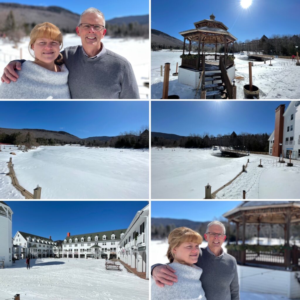 Waterville Valley is like a Matryoshka doll set — you know, those Russian nesting dolls. We say that first because of its geography, a flat plain nestled between mountains which form the outermost shell, so to speak. Then within that is the Village itself and nestled within that is a quaint “Town Square” lined with shoppes. And then, at the very heart of it all, is the pond-side gazebo. It was there, at the center of it all, that on March 13th, 2021, Michael and Ellen married. This was a small ceremony witnessed by a small group of family and friends.