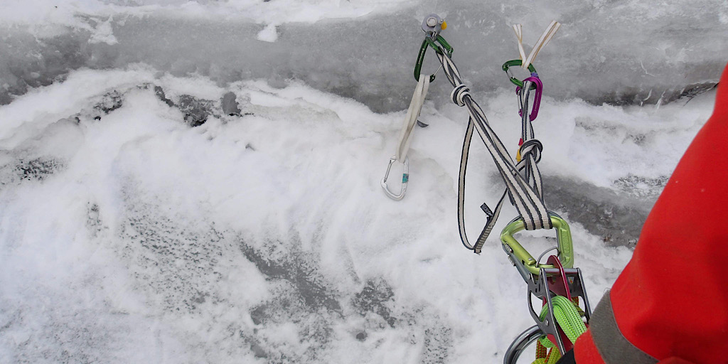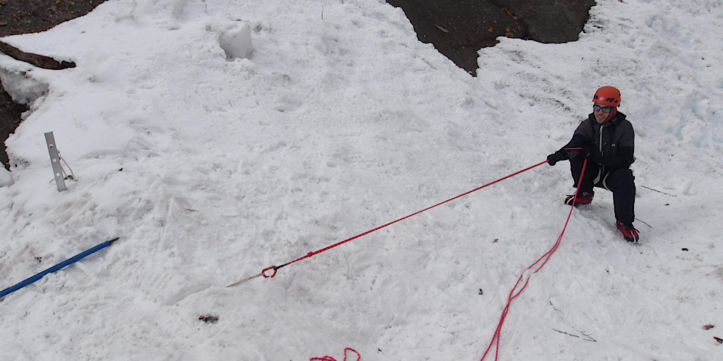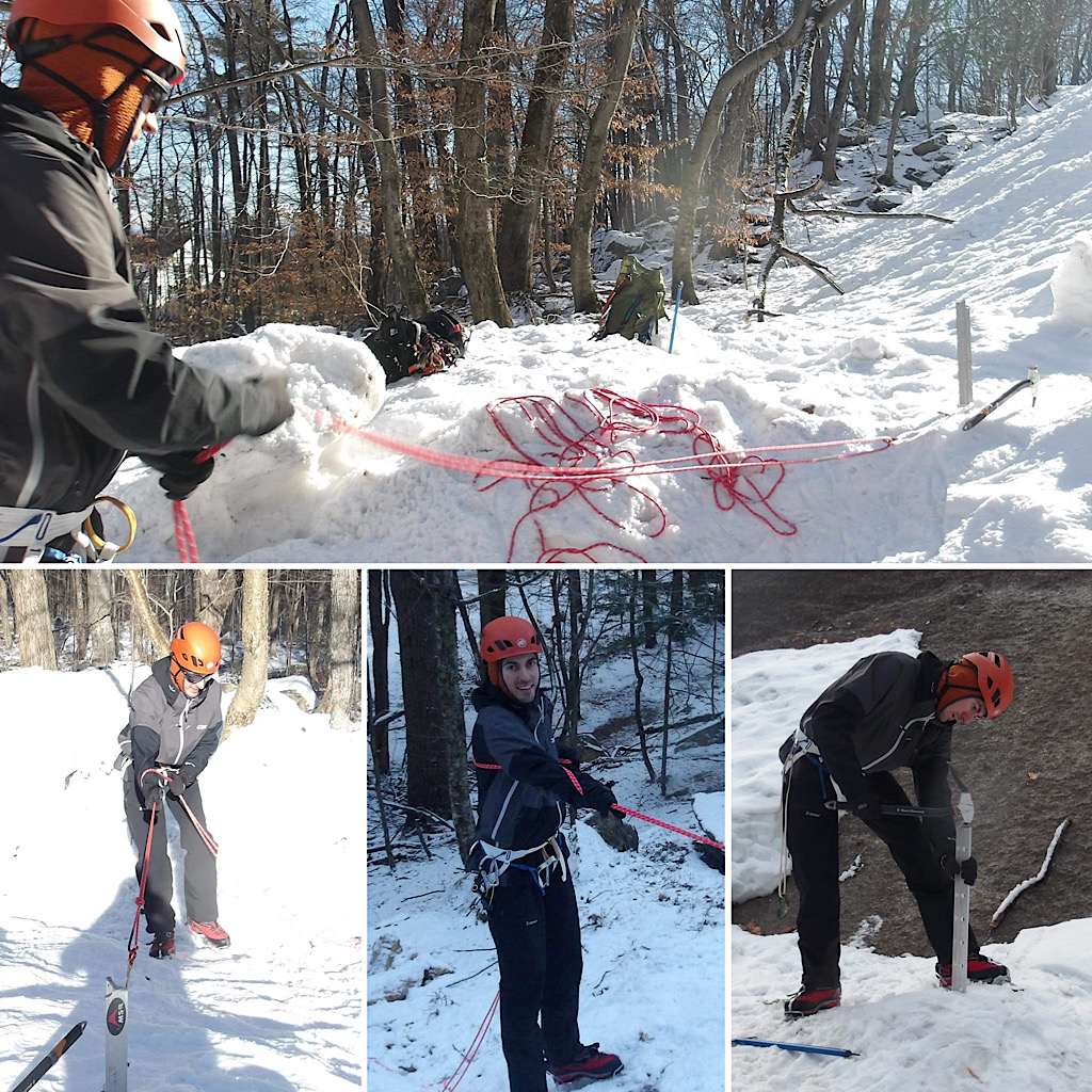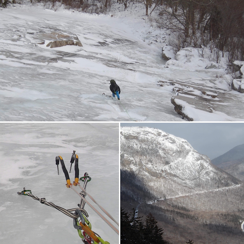 We have standardized educational offerings, programs complete with certification (from us), but sometimes someone will come to us looking for a truly custom program — something like our multi-day Advanced Alpine Skills program, but shorter and less structured. This sort of thing usually ends up looking like a hybrid of all we do. And creating this one-off blended, custom offering is what Redline Guide Pat Ferland was doing the past couple days for a fellow from Connecticut with some special requests. Pat showed him the ropes, quite literally, at Cathedral and Whitehorse Ledges on day one then they went to Willey Slide in Crawford Notch on day two to execute some of what was learned as well as taking a lot more information on board. Pat grabbed some photos of their training time together, as shown below…