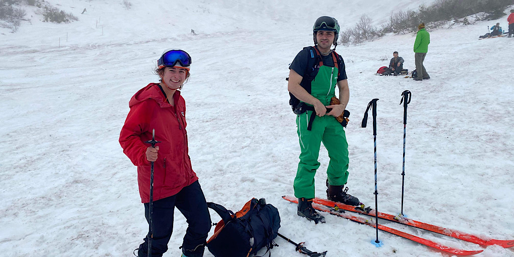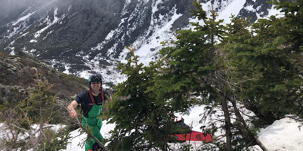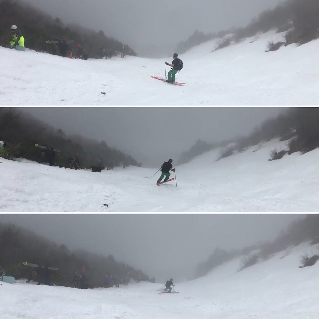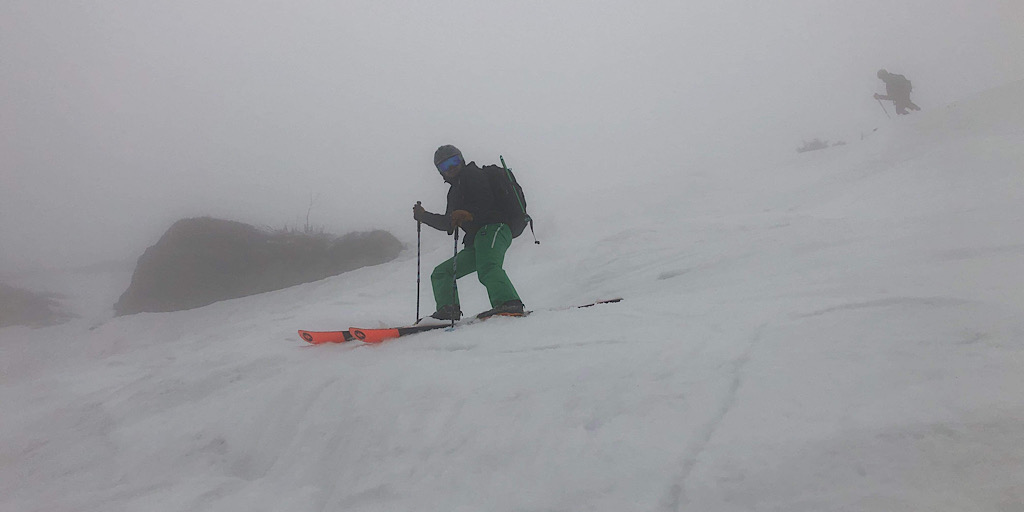 We noted in our last blog post that the team ventured to the edge of the mist, everything above it obscured, but didn’t really venture too far beyond that point. Meanwhile, one returning experienced backcountry ski guest also on the mountain, enjoying his own tour with Redline Guide Phoebe Seltzer, pushed further. They entered VertigoLand where ground meets sky at some ill-defined point. Just like a disoriented S.C.U.B.A. diver following their bubbles to the surface, the team knew the fall line was the line, gravity told the tale, and anything darker to the sides should be avoided. Having skied in whiteout conditions on Mt Washington, we can appreciate the exciting journey they took.