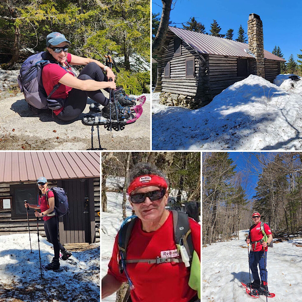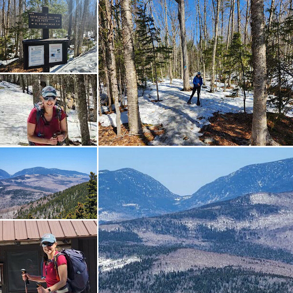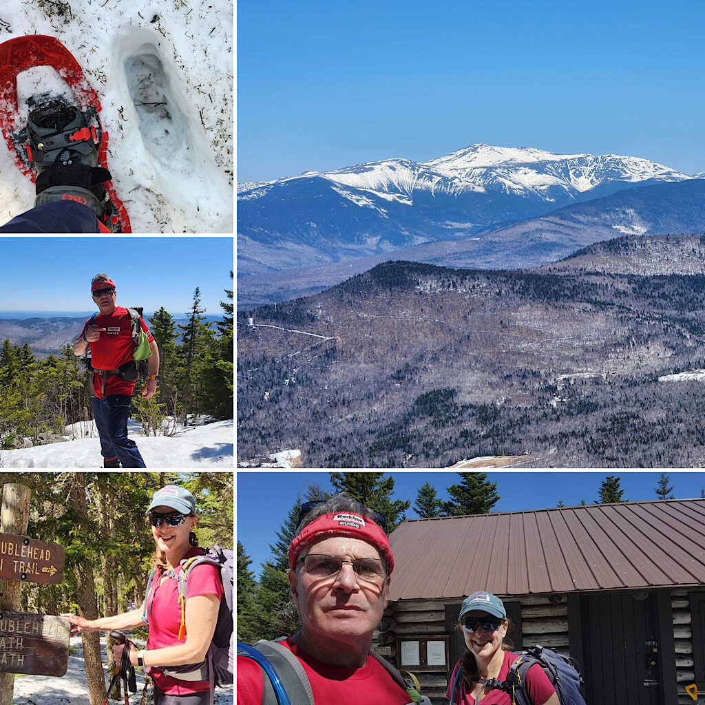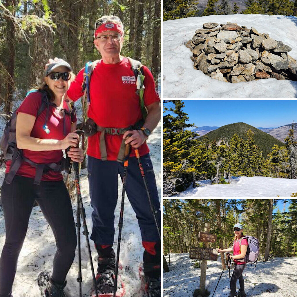Working on her 52 With A View list, taking on the Doubleheads in Jackson brought here two peaks (albeit just one spot) closer to the finish line for our oft-returning guest. It was a gorgeous day, sunny, clear, and unseasonably warm, almost too warm to hike. Yet, despite appearances, the deep snows on the ground told the true story: it’s spring. The team, led by Redline Guide Howard Aronson, used the ski trail and the “Old Path” — wearing snowshoes the entire time — took on the north peak first. They then went to the even better south mountain taking lunch on the ridge before doubling back to the bottom of the col and Old Path junction. Both guide and guest supplied the following photos: