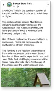 With one hard hike down I offered a mellow hike for day 2. At least I thought it would be a mellow hike. A 13-mile loop starting at Daicey Pond following the Blueberry Ledges Trail south to connect with the AT north-bound and passing by Baxter’s Little and Big Niagara Falls. All was well on the Blueberry Ledges Trail. A mossy trail, with beautiful bog boards, and wonderful cascades at the ledges. But as soon as we turned on to the Appalachian Trail (AT) northbound we encountered flooded sections. First we were able to walk around some and we figured it surely wouldn’t stay that way. I happened to hike in my sandals that day and walked straight on through even when it got deeper. To my surprise I found myself waist deep in the water with fish swimming around me!Arlette reported the flooded sections to the park. They posted this warning soon afterward. (Click to see a larger version of this BSP announcement.)