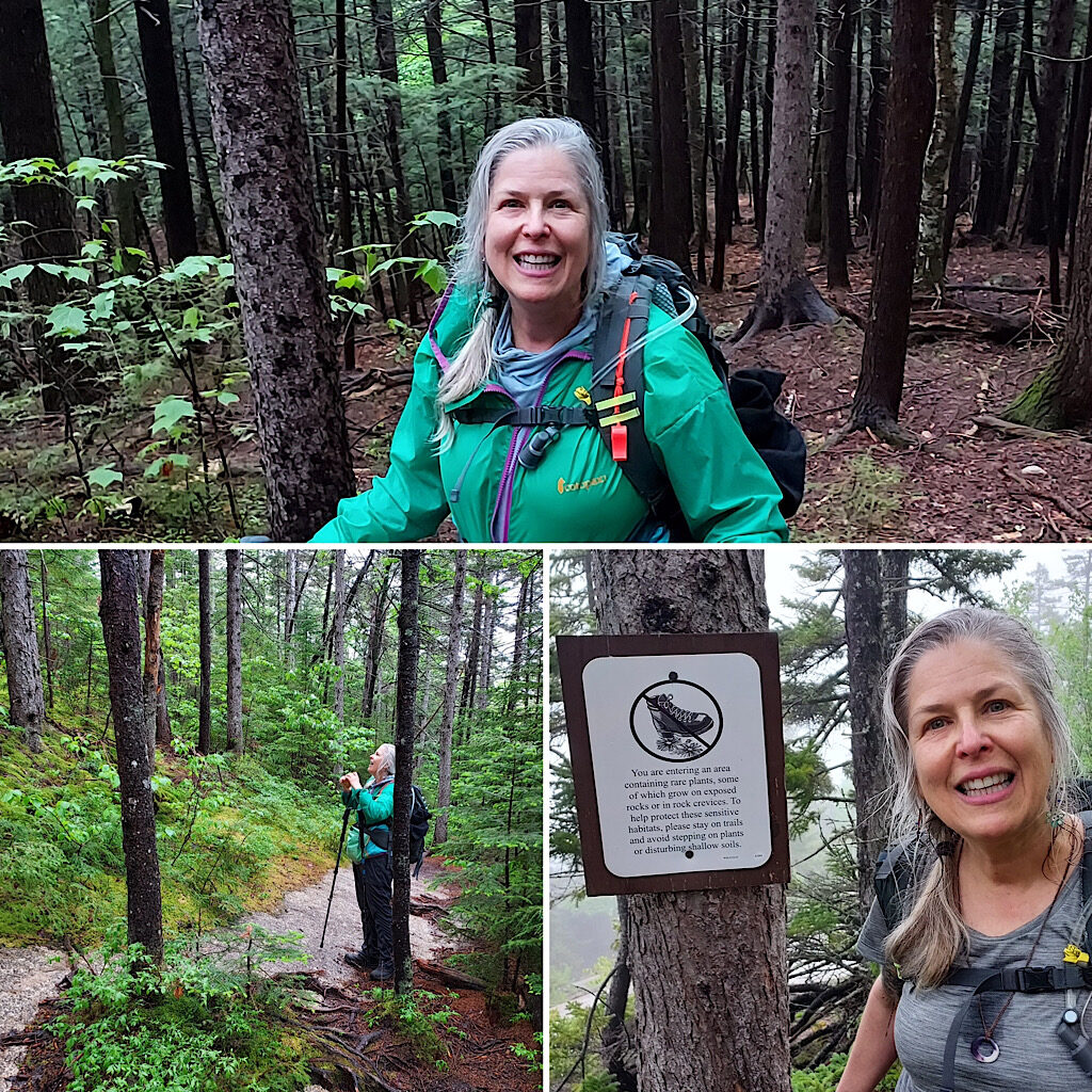 The forecast wasn’t inspiring and the ragged edges of the low clouds were hanging over the tops of the mountain as we headed up Potash. The ledges on this trail have enough traction to provide good footing when they are wet and we ambled upward through an ethereal forest, stopping to admire the lady’s slippers that were blooming everywhere, listening to a forlorn sapsucker persistently tapping out his hopeful mating call. At the top we enjoyed our lunch break, then noticed that the clouds were beginning to lift, enough to give us view to the top of the Kanc and down to Church Pond which shimmered like a precious gem. By the time we got off the mountain is was drizzling again, but we had met only five other hikers (plus two polite dogs) and had a great day. —Tim Jones