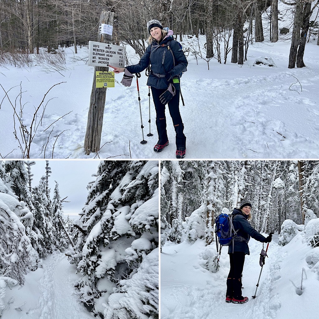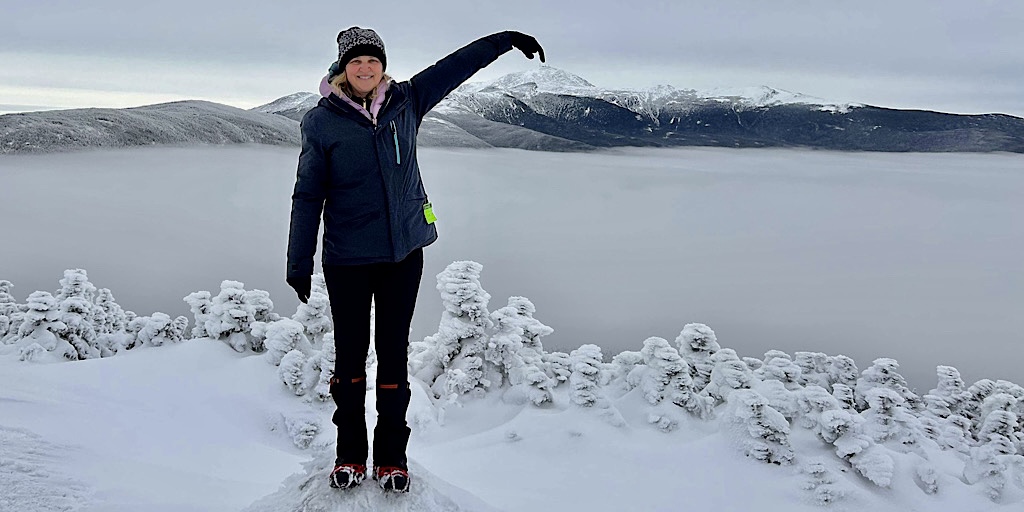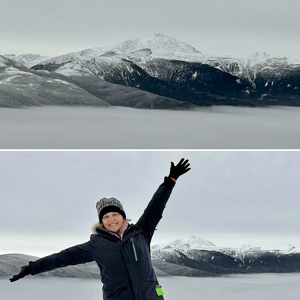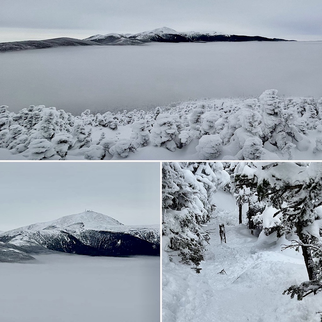 Today’s guest took a 20 year break from hiking the Whites, with such a long break, I decided to take her up to visit the summit of the 4052-foot Mt. Jackson. It’s a wonderful mountain in winter. The trail is very popular and that can help with packing it down, making it a lot easier for beginner hikers to enjoy, rather than arduously breaking it out. The views at the top are worth the 2.6 mile hike up. The Webster-Jackson trail today was rich with hiking enthusiasts out and about enjoying the winter weather. The summit revealed one of the best undercasts of the season. The clouds were like water stretching across the horizon. You could see the tips of the mountains peaking above the clouds. It was spectacular. Our guest was happy to see this rare event as well. —Chase
