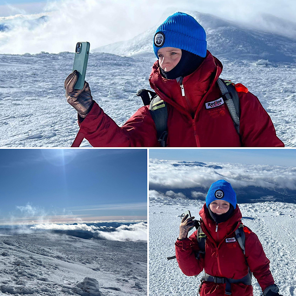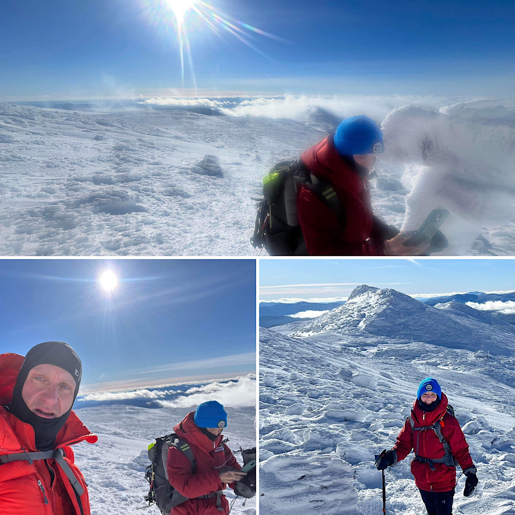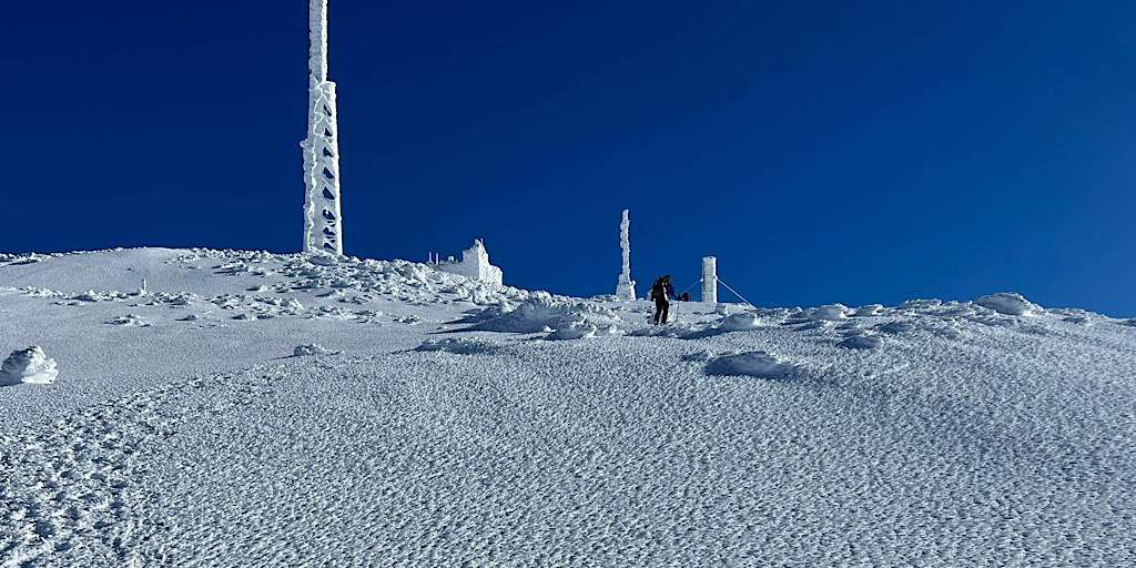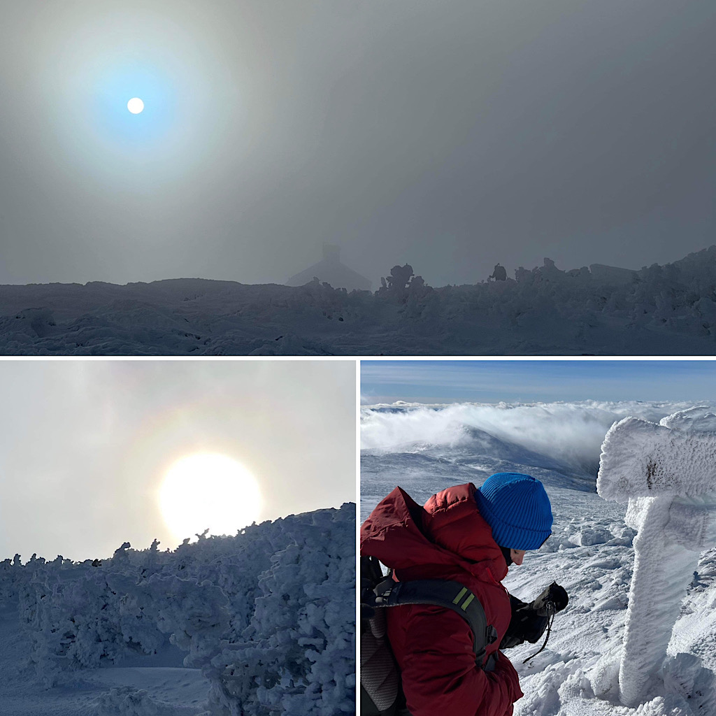 When we reached the Lakes of the Clouds Hut it did not look like we would go any higher. Maybe Monroe, but even that seemed a long way away. Visibility was pretty poor, and the wind was gusting in the 40s, maybe 50s. Into the ‘dungeon’ shelter under the hut we went to get out of the weather. Another party was in there and we discussed the options. They departed unsure of which way they were going, we discussed Monroe, and our guest was in agreement but also wanted to see if we could go any high towards Mt Washington. We readied ourselves, opened the door, and stepped into a transformed landscape! Clouds, gone! Blue skies! The summit loomed above us. And we were off! Summit of Mt Washington, in winter, for our guest’s first winter hike! What’s not to like? —Glenn