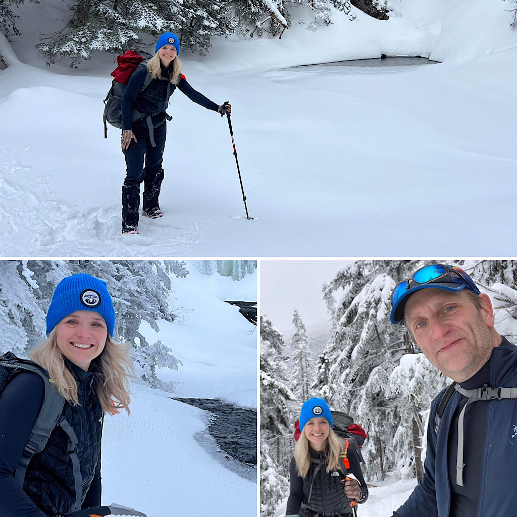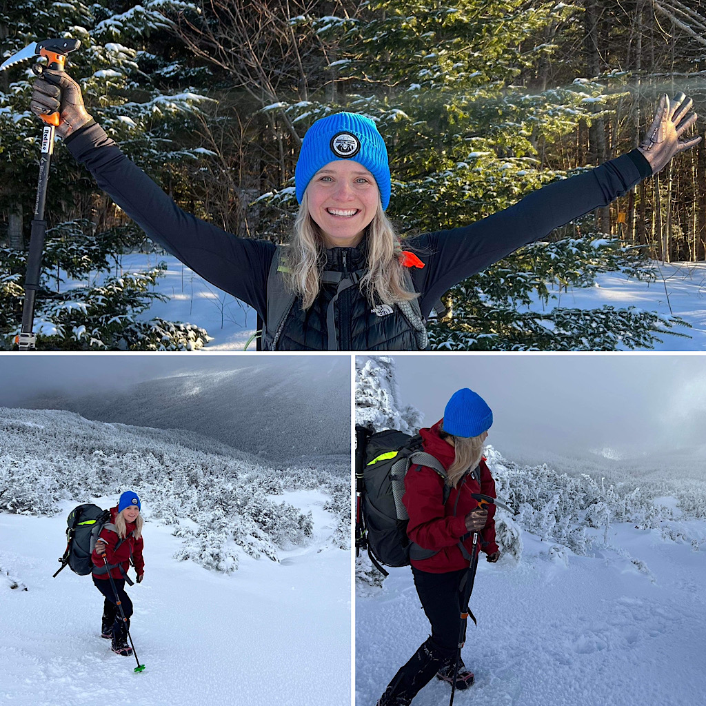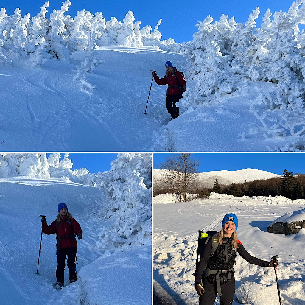 When we reached the Lakes of the Clouds Hut it did not look like we would go any higher. Maybe Monroe, but even that seemed a long way away. Visibility was pretty poor, and the wind was gusting in the 40s, maybe 50s. Into the ‘dungeon’ shelter under the hut we went to get out of the weather. Another party was in there and we discussed the options. They departed unsure of which way they were going, we discussed Monroe, and our guest was in agreement but also wanted to see if we could go any high towards Mt Washington. We readied ourselves, opened the door, and stepped into a transformed landscape! Clouds, gone! Blue skies! The summit loomed above us. And we were off! Summit of Mt Washington, in winter, for our guest’s first winter hike! What’s not to like? —Glenn