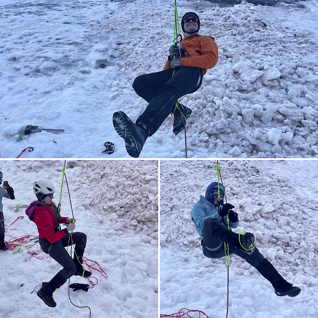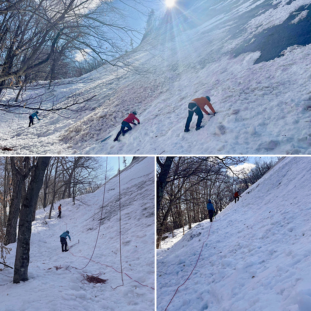 While we have no glaciers here in the Northeast, we do have wide, snow-covered hills that may resemble glaciated terrain… if you squint. And that’s all we need. Even for practicing crevasse rescue. Bi-angled hills, trees for self-rescue, some creative use of the landscape plays a role in our training. The training featured in this blog post was a custom combination course. The morning was our standard half-day mountaineering skills course, in this case, and the afternoon was the standard glacier travel half day of our full day glacier skills course — with what looks like some guest torture added in since it appears Redline Guide Pat Ferland had them climb a rope using Prusiks (a loop of cord is a Prusik and using it as a type of friction hitch goes by the same name). This is not an easy feat!