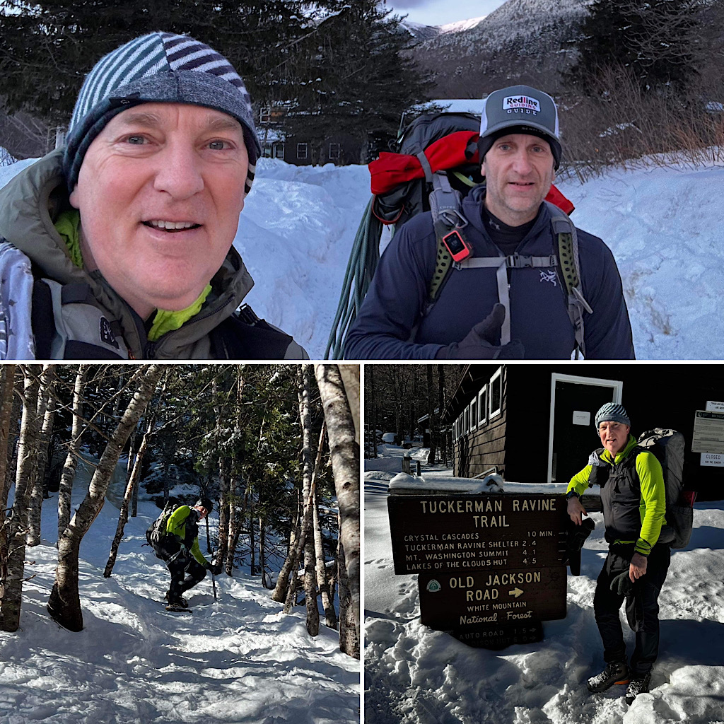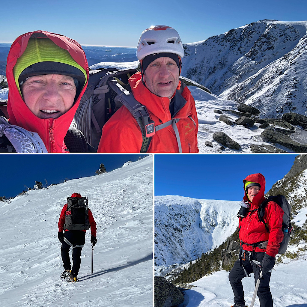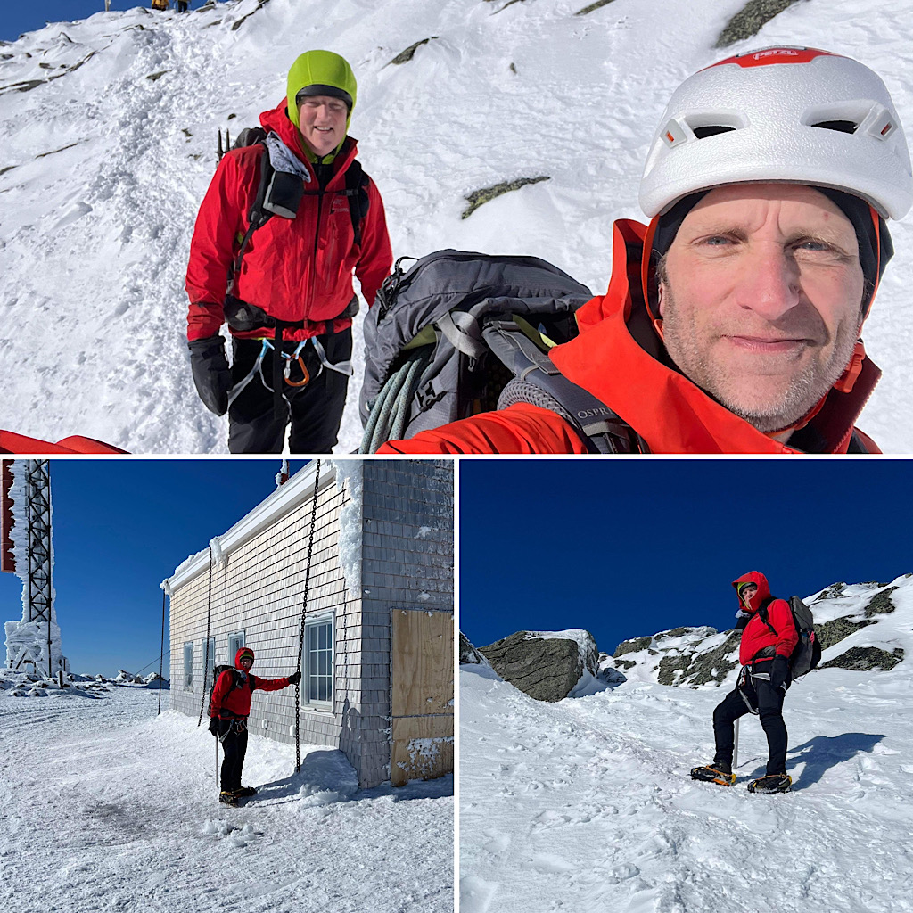 Snow has fallen in July, and in August, and in any month you may select — at least on Mt Washington. On that mountain the weather ranges from the worst humankind has ever seen to beyond spectacular. This latest trip was on the nice end of that scale. Today was sublime, amazing, and spectacular, the latter tagged as an understatement. The ascent was part of our Two-Day Winter Mount Washington program. For those not in the know, this consists of a full day of Winter and Mountaineering Skills followed by our attack on the mountain the following day. The objective not just being to climb and stay safe, we also want our guests to look good doing it. On lead for the weekend was Redline Guide Glenn Van Neil. He led both the instructional segment and the climb. Both days a success. Here’s his take, along with some photos: