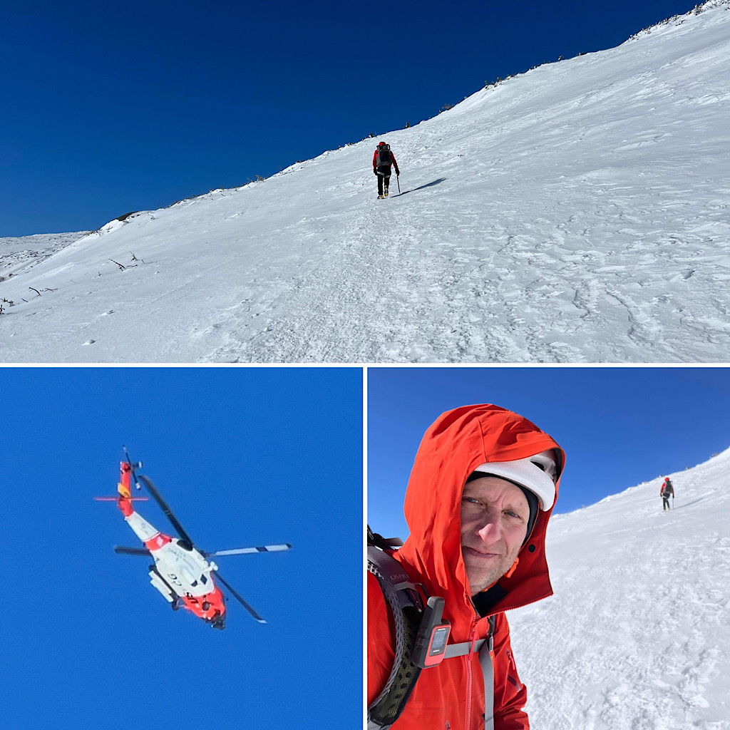 Success! The weather forecast said cold and windy so we were prepared: warm clothes, plenty of snacks, water, and the Thirteen Essentials. We left Pinkham Notch at 7 AM and there were already a number of parties in front of us. We made good time and quickly found ourselves at the start of the Winter Route of the Lion Head Trail. There was a small traffic jam at the [Wilcox] step, but we passed those groups and continued moving up towards the summit. Even though the forecast said windy, it was calm, we reached treeline, and then the wind was there. Up over the Lion Head, across the Alpine Garden, and onto the summit cone back into the calm. On the south side of the summit, there was no wind and we talked about how warm it was in the sun. We continued up, cresting the top of the hill and we were there! Spectacular clear day… truly an understatement. The views were endless and we watched a few clouds pushed by the wind, make their way through Crawford Notch from the summit. A quick walk around to check out the views from all directions and we decided it was time to head down. There were many parties still coming up the trail as we descended. It seemed as though we were back in the parking lot too fast. All in all a spectacular day on Mount Washington, and under eight hours car-to-car is pretty respectable. —Glenn