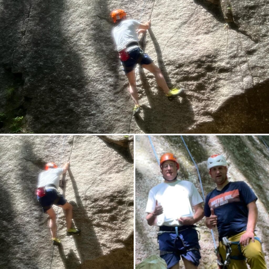 Our guest hadn’t climb outdoors (or really at all) in the last 20 years. He wanted an introduction — or really a reintroduction — to outdoor rock with a progression of increasing difficulty. Cathedral Ledge was our spot and we had 4 climbs identified” Child’s Play (5.6), Kiddy Crack 5.7), the Mantle Problem (5.8) and finally Birds Nest 5.9). Hadn’t climbed in 20 years? No problem!