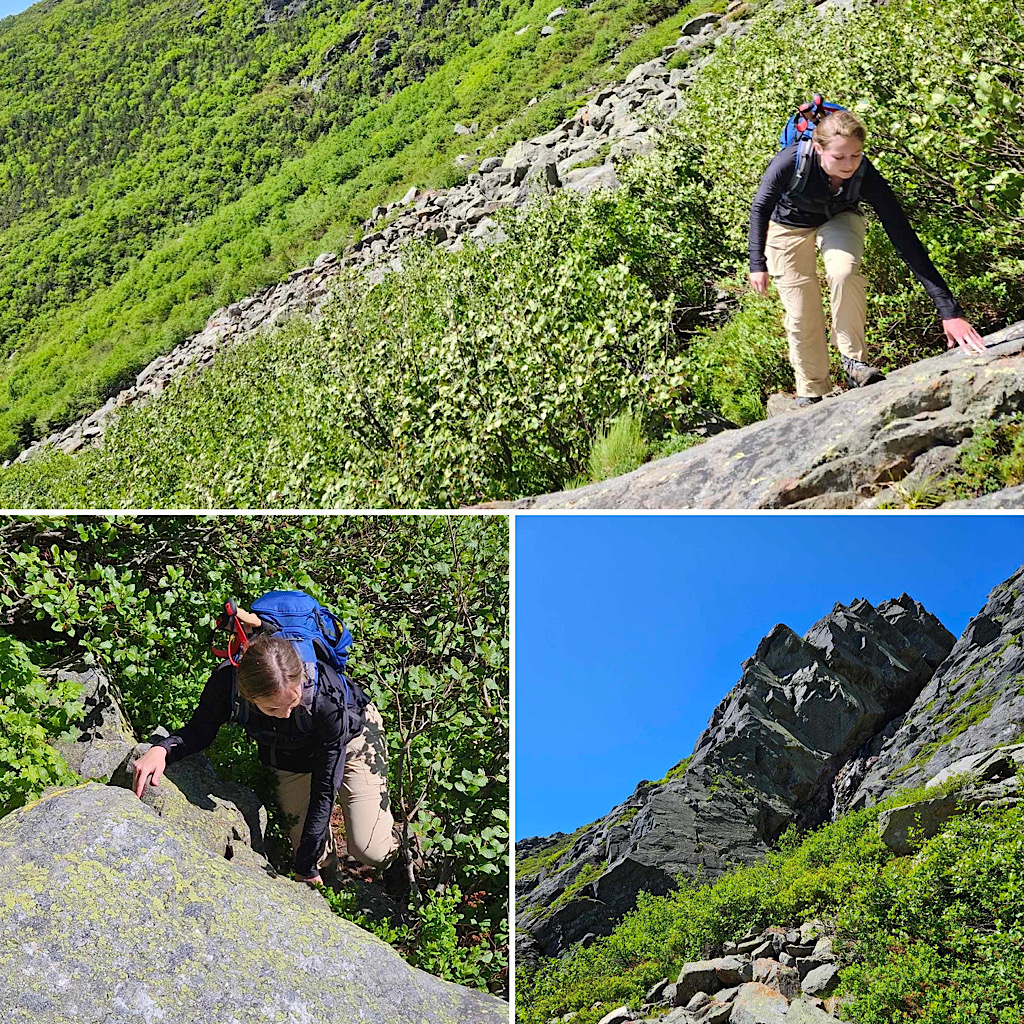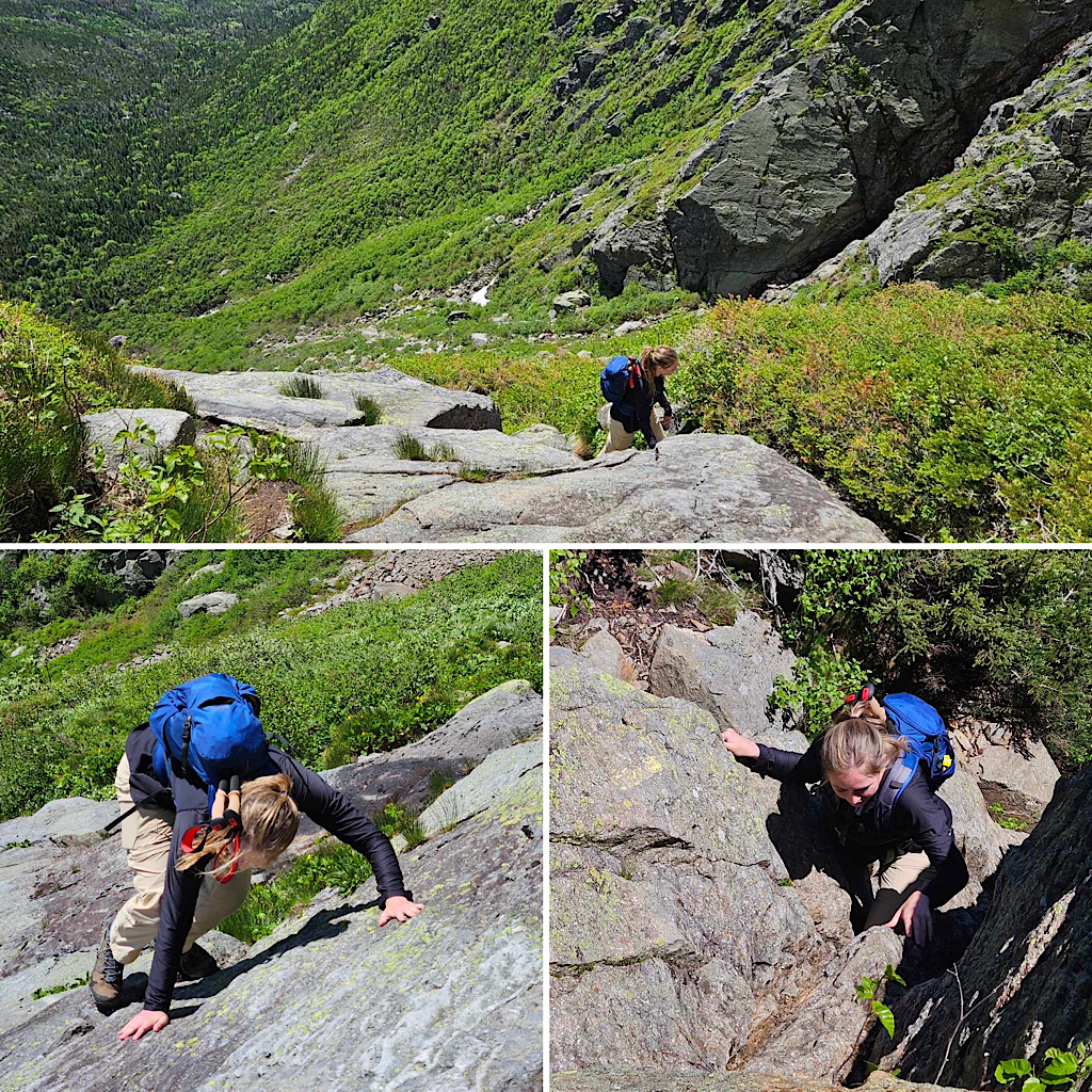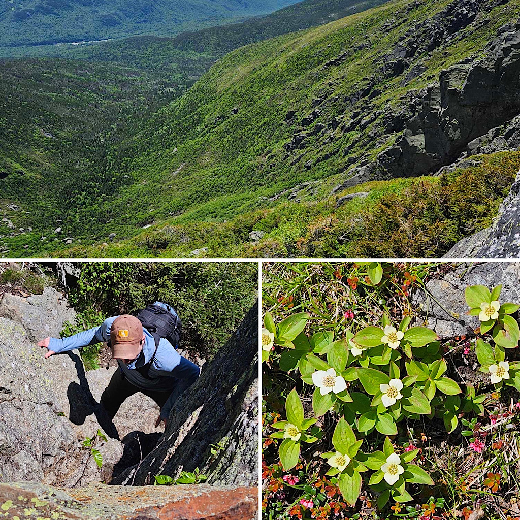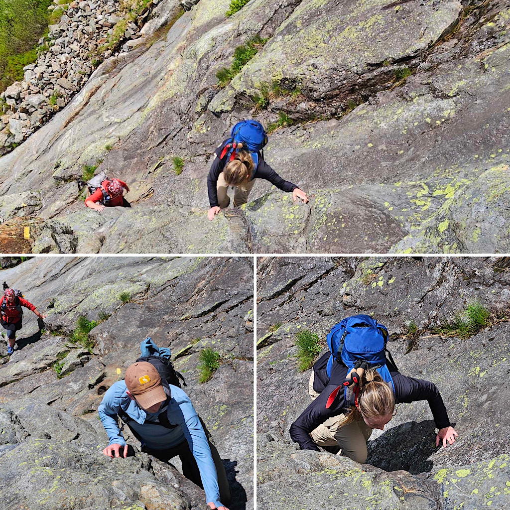 Damp slabs are okay, but the ones on Huntington are a little bit hazardous in pouring rain. If it’s pouring at 7AM tomorrow, I’m thinking about options — like let them choose Lion Head to the summit of Washy or Caps Ridge to Jefferson… still a wet scramble, but probably a little safer than Huntington. Fingers crossed for dry and sunshine tho, lol. —Debra