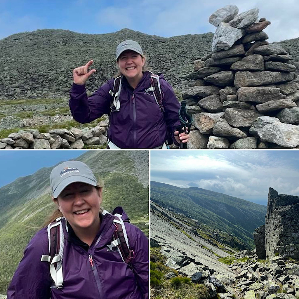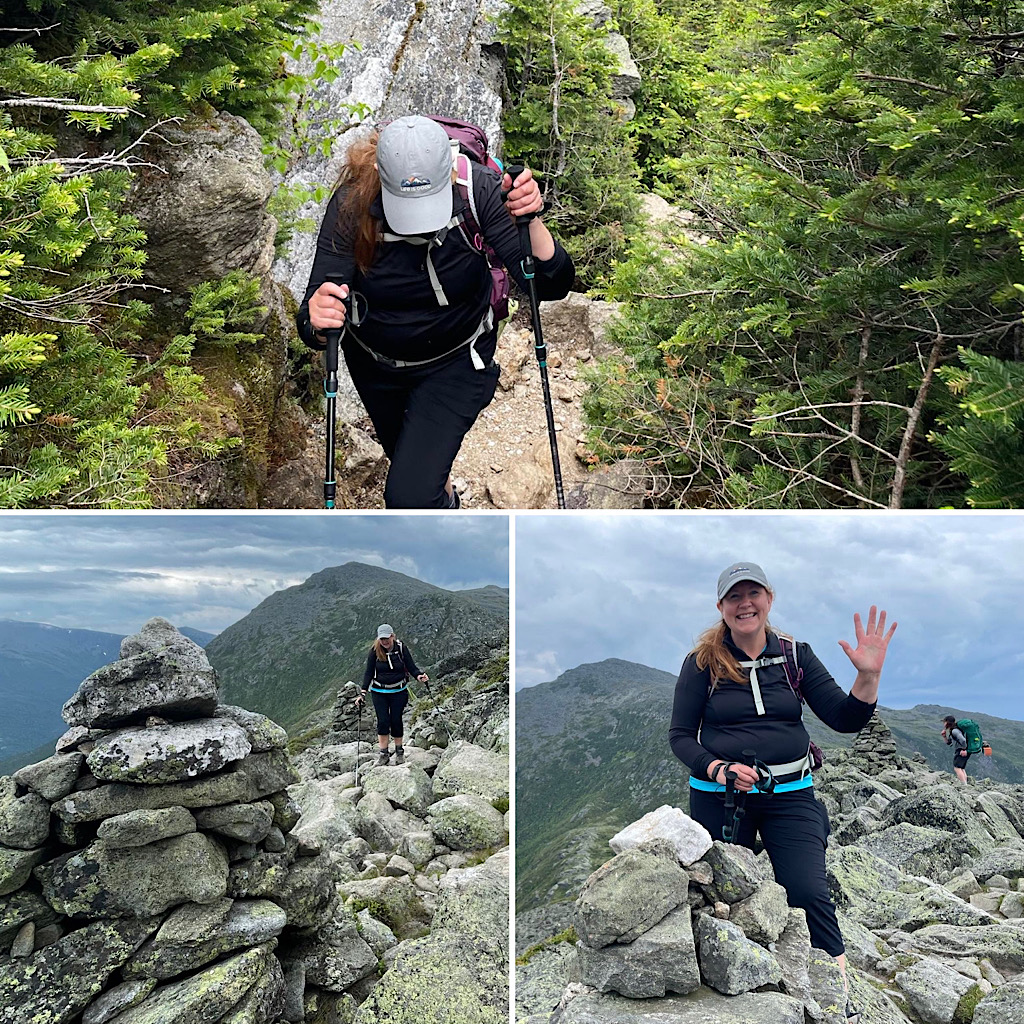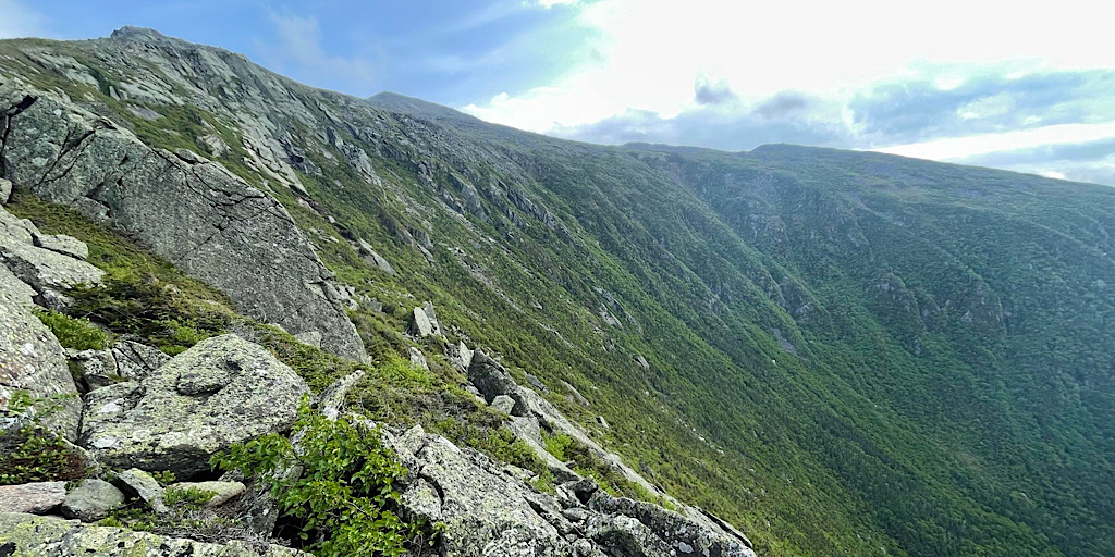 The steady climb up brought us successfully to Madison Spring Hut and after a brief water stop we continued to the summit. Number 6 of the 48 (5 with us) for this guest [congratulations]. It started drizzling at this point but after lunch at the hut the weather seemed to clear. We felt energetic enough to continue on to Airline Trail and maybe add Adams. Making good time to Airline but knowing the boulders to Adams would slow us down a lot I offered the slightly longer but easier approach: hike to Thunderstorm junction and then decide if there was enough energy and time to do the shorter, less steep boulder section to the summit. Unfortunately energy was running out and calculating speed, daylight and ‘do we really want to be dead tired and exhausted at the end?’ the guest made the decision to not push on. While somewhat disappointing being only .3 from the top, it turned out to be the smart decision and it gives us a reason to come back and tag another Terrifying 25 Trail. As it was we backtracked to Airline and enjoyed the views over King Ravine, now being graced with sunshine again. —Arlette