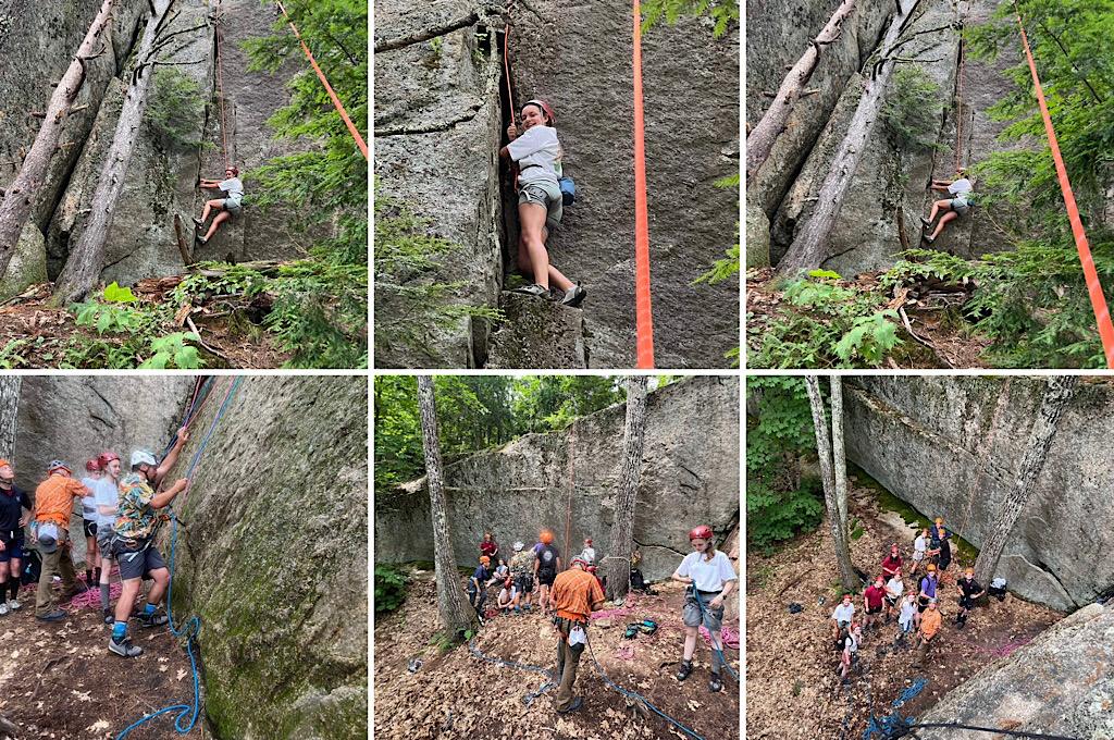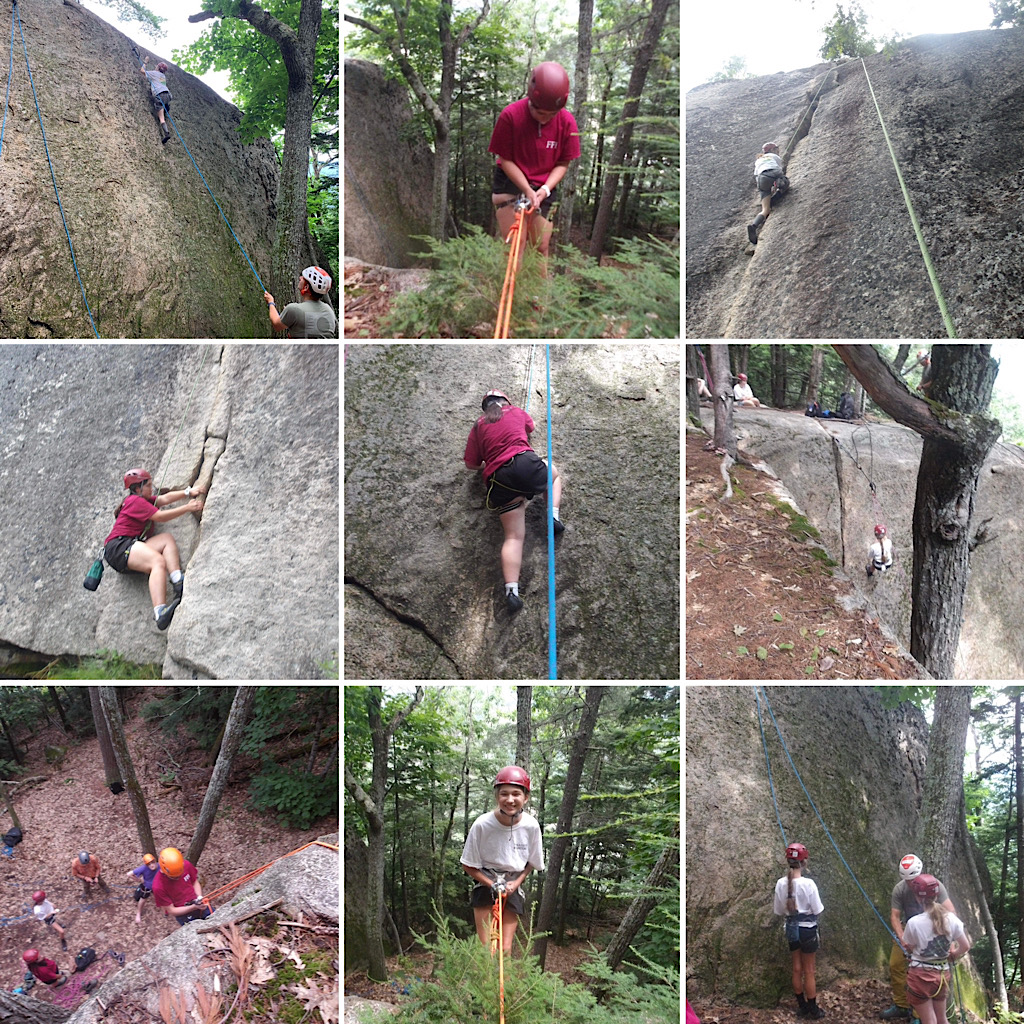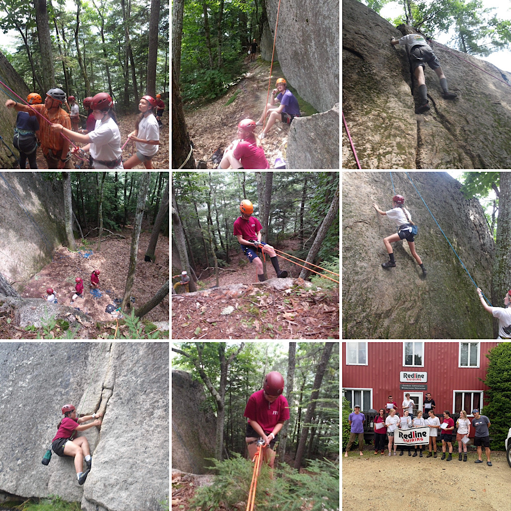 The group started a Rock Climbing Intro Course at our Basecamp gearing up and prepping. When ready the team caravanned to the top of Cathedral Ledge, where we drove to the top of the cliff and headed over to “The Wall of Hurley Morning Light” — a fun area ranging from 20 to 25 feet high with routes rated from 5.2-5.7. Before moving on to nearby routes, they worked on face climbing, crack climbing, corners, and other techniques like hand-jamming, and laying back. Also belaying and tying in was of course covered. The team even got into some rappelling. Every one loved that! Leading this group were Redline Guides Pat Ferland, Glenn Van Neil, and Gregg Ludvigson. Check out the photos of their day.