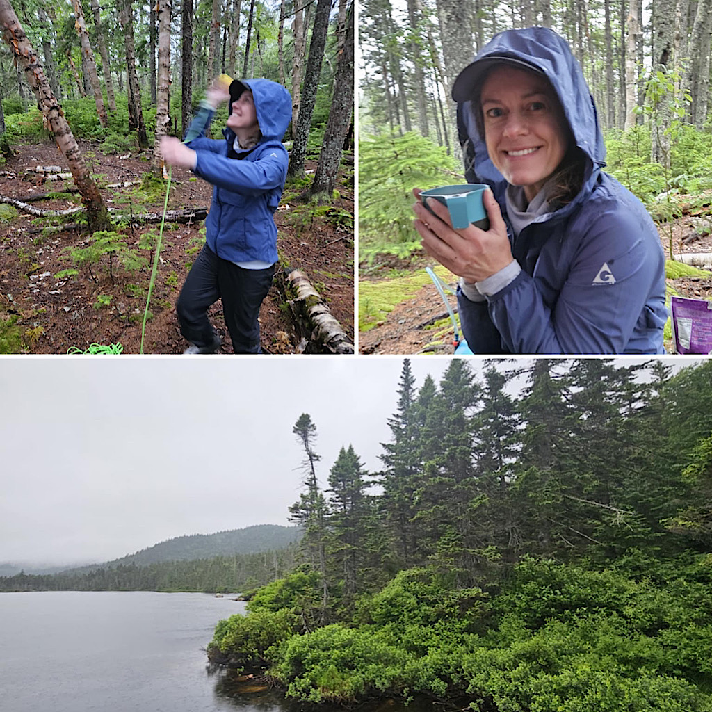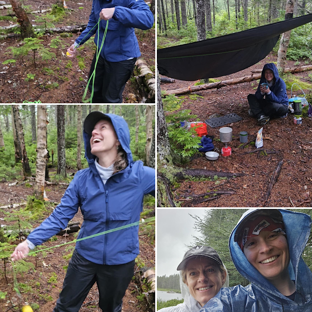 We set up our tents in the rain, taking care to choose flat spots where water was unlikely to pool. We cooked on camp stoves under a tarp and hung our food in a bear bag away from camp. It poured all night, but we were snug and dry.