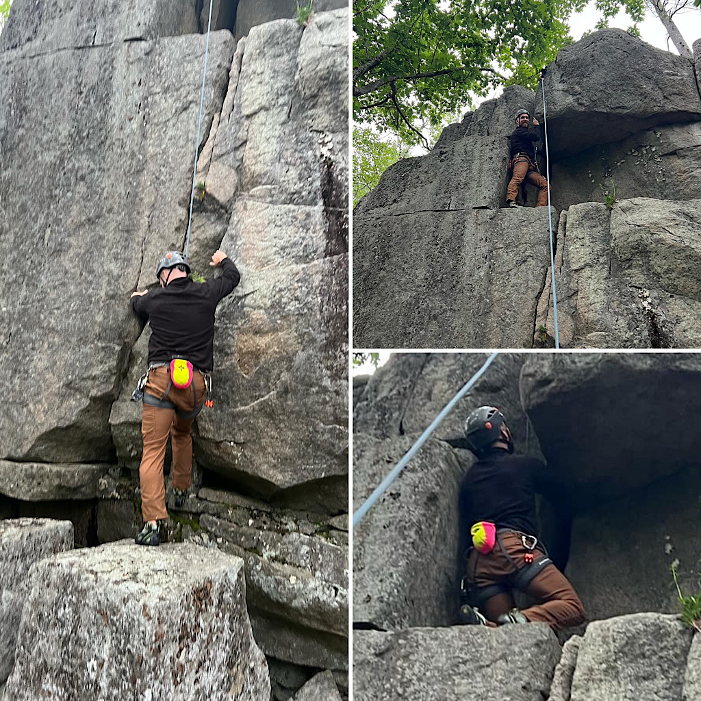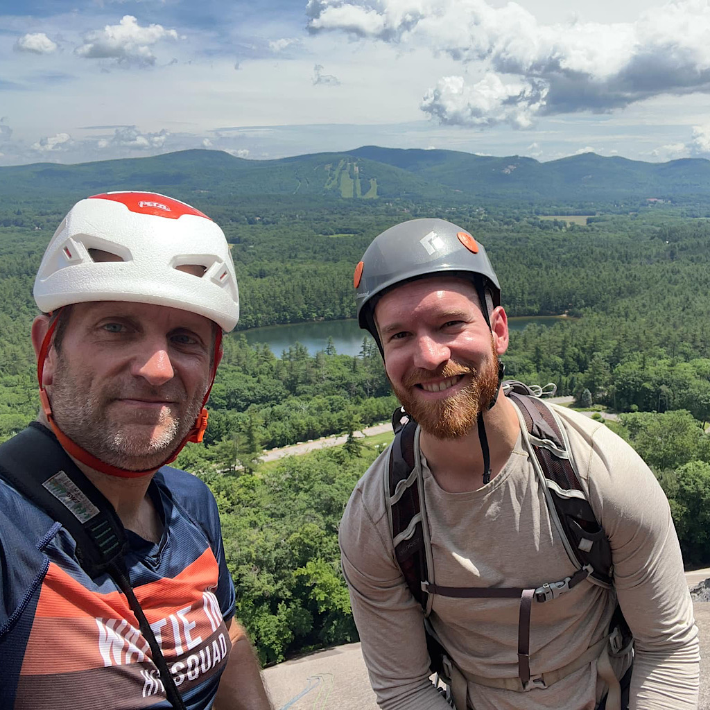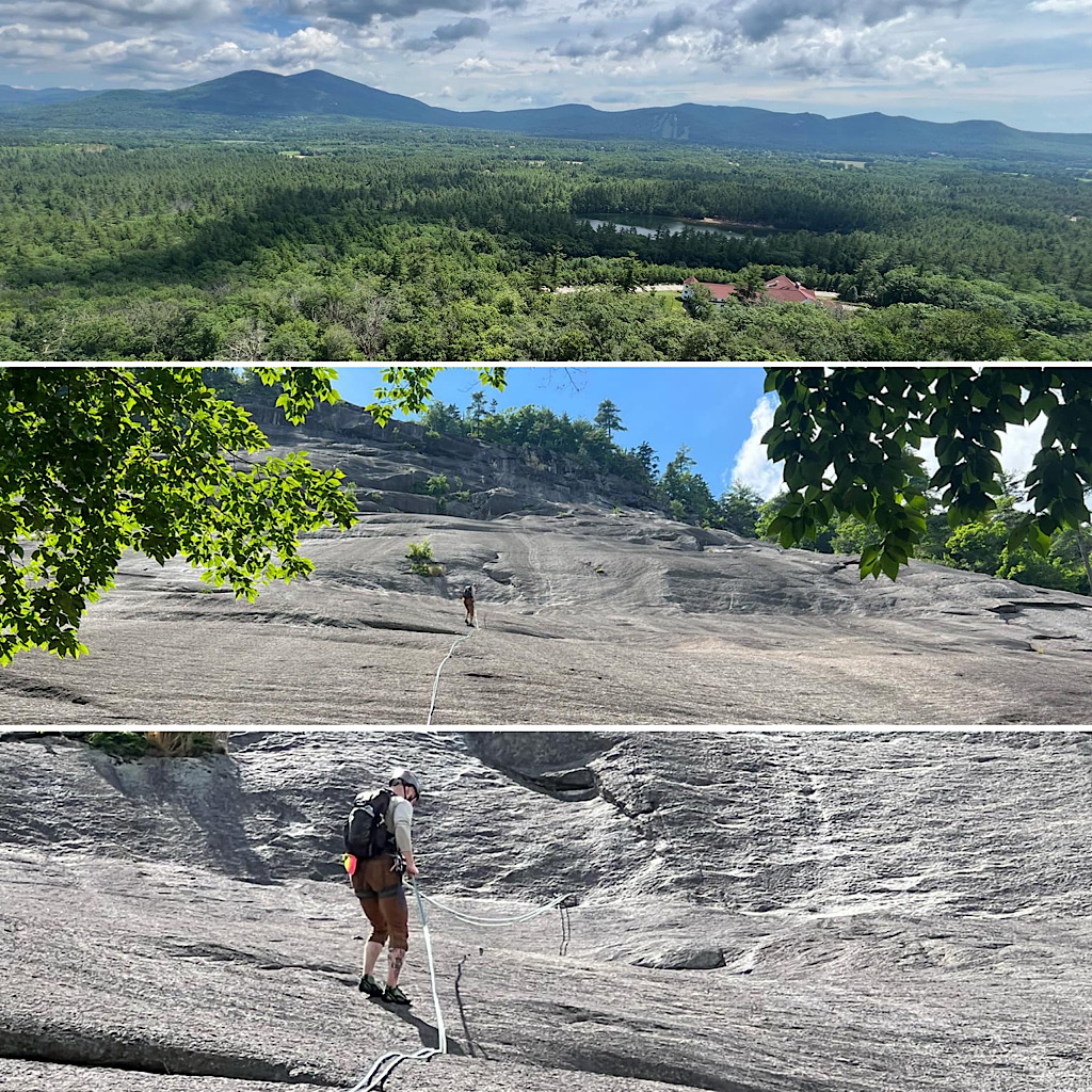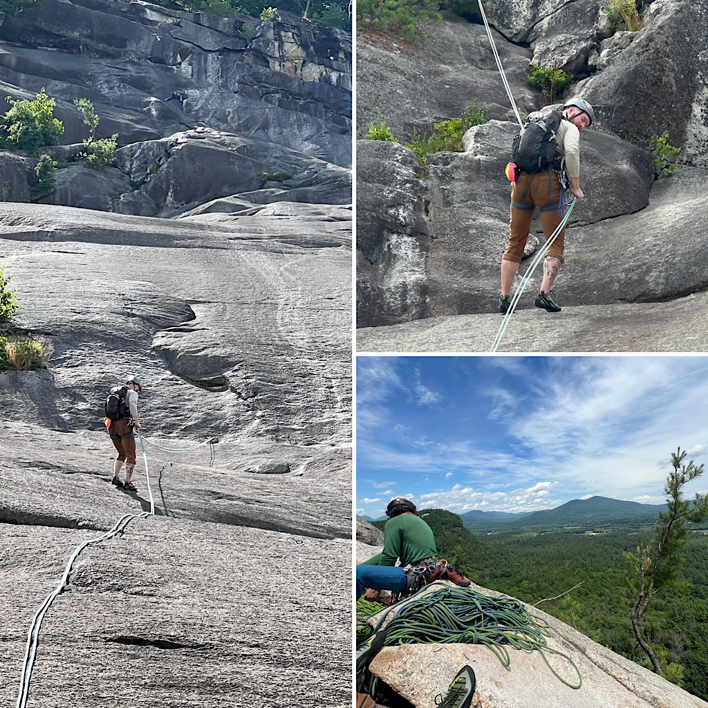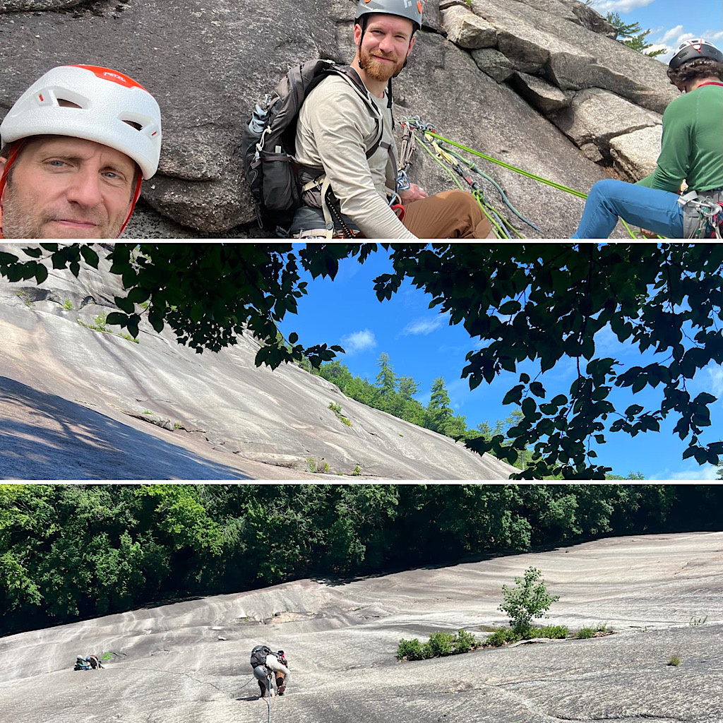 Two days, in a row, without some rain? Is that even possible? Not that rain seems to stop the guides around here. They’re out there hiking and backpacking in it all the same, and even rock climbing — though that part was done between rains, as if by magic. We were worried. The notion of two consecutive days… was it fantasy? As it turned out, however, Redline Guide Glenn Van Neil was able to deftly side step the rain. On day one — over at Woodchuck Ledge — they started early enough to dodge the weather. On day two the opposite was true. The climbers slept in. The intense summer sun was out and the steaming rock of Whitehorse Ledge was beginning to dry. When they finally got to it, things were good and the team was able to send. What follows is Glenn’s summary, complete with some details about their close-call, and some photos: