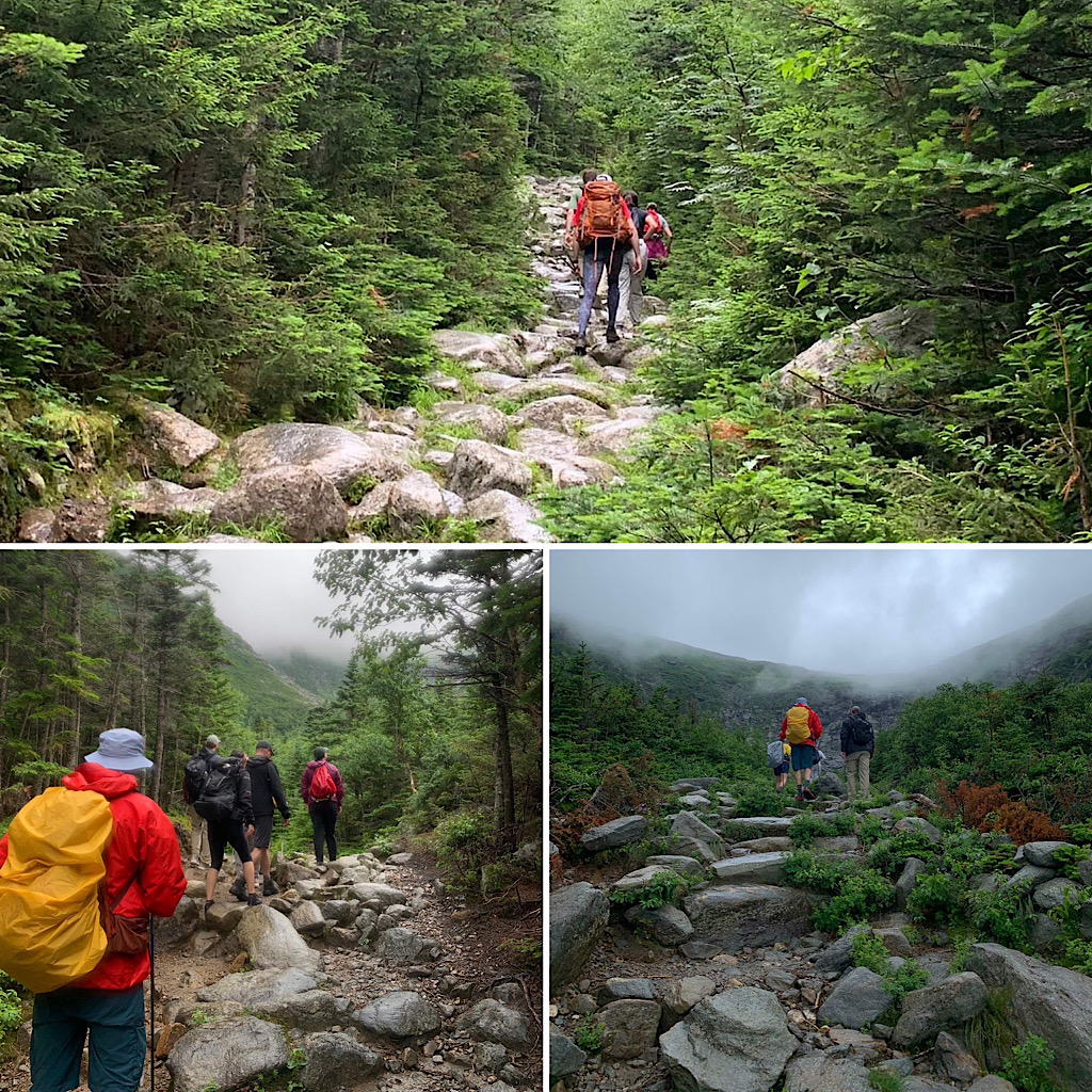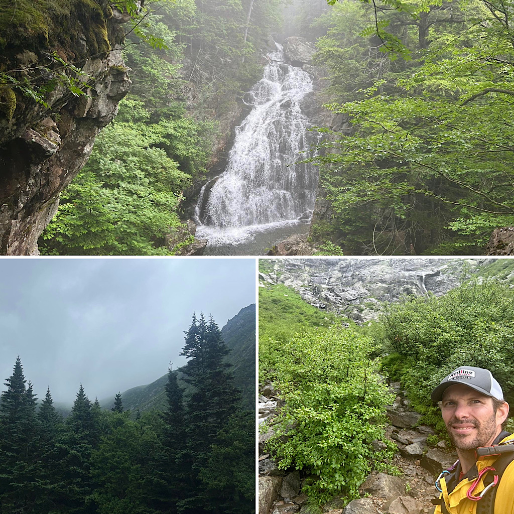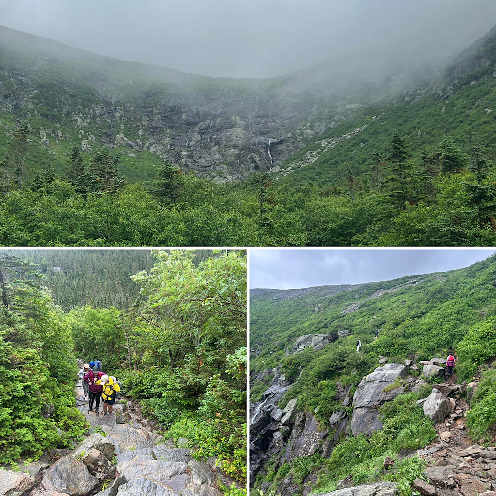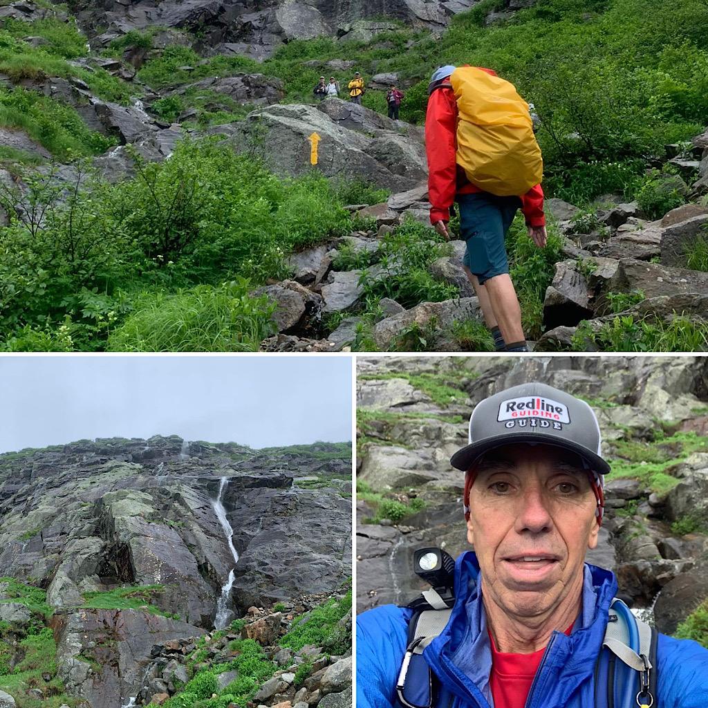 Wild day guiding a group on Mount Washington. Forecast called for rain, with high probability of severe thunderstorms. Not long after we started, we got hit by a heavy downpour. We went for cover under some trees so we could put on rain gear. A little further up the trail, and it was just a light shower, but we were already soaked. So, we decided to continue on, and see what happened with the weather. As we pushed upward, the rain stopped and the wind picked up. At the next major intersection, we could see the summit was totally socked in by fog, with high winds. We made the decision not to summit, and decided to go across to the Alpine Garden and make our way down. We hit Lion Head, and from there we could see clearing off in the valley. We took a lunch break, and then started down as the sun broke through the clouds. It got warm enough with the sunshine, we all shed our rain gear for the rest of the way down. Back at the bottom, it was blue skies and warm sunshine. As those of us that live and play in the White Mountains say, never expect the weather to do what it is expected to do. The weather in the White Mountains is unpredictable! —Gregg