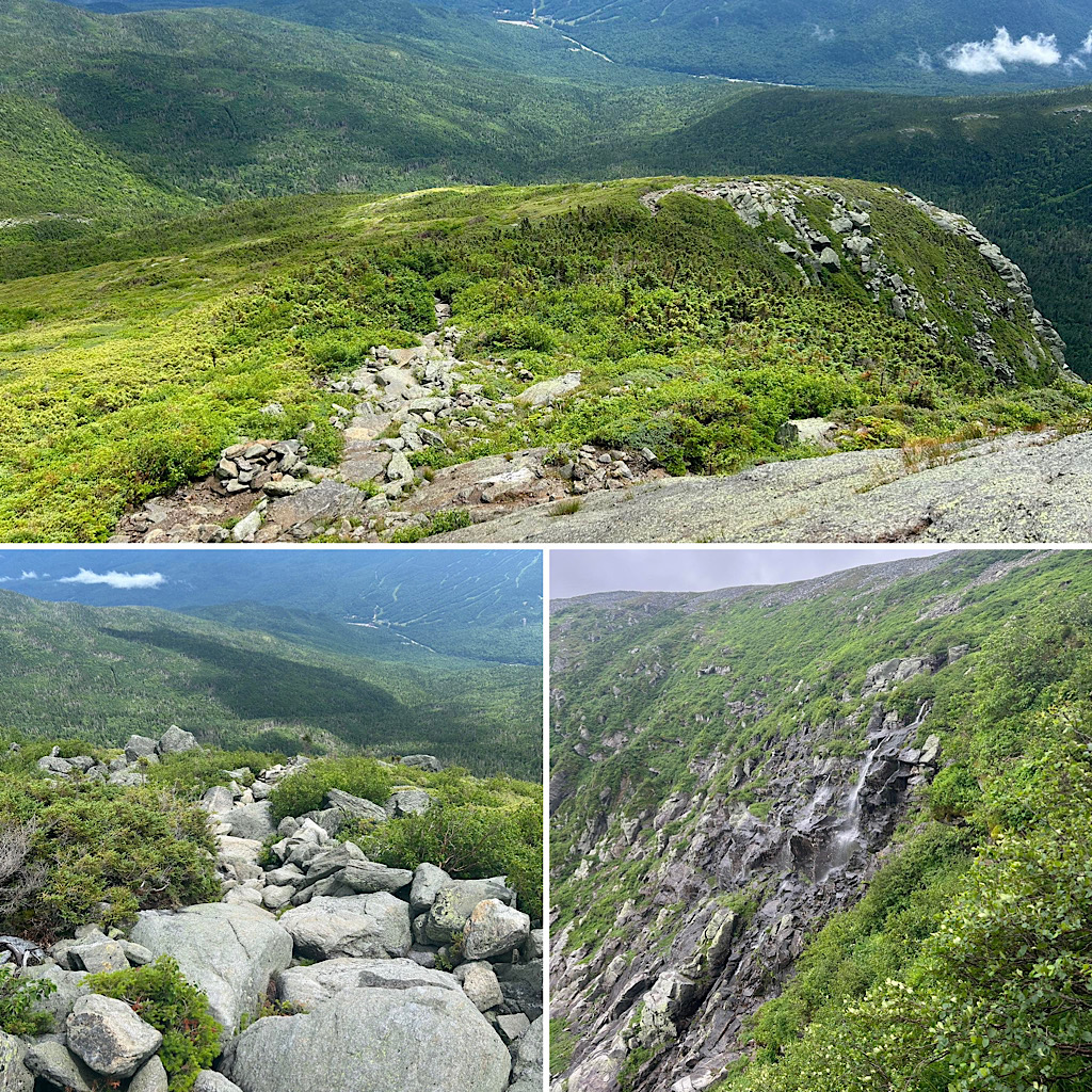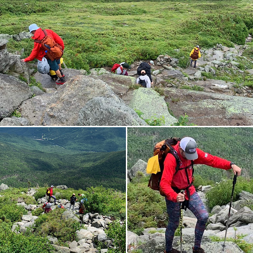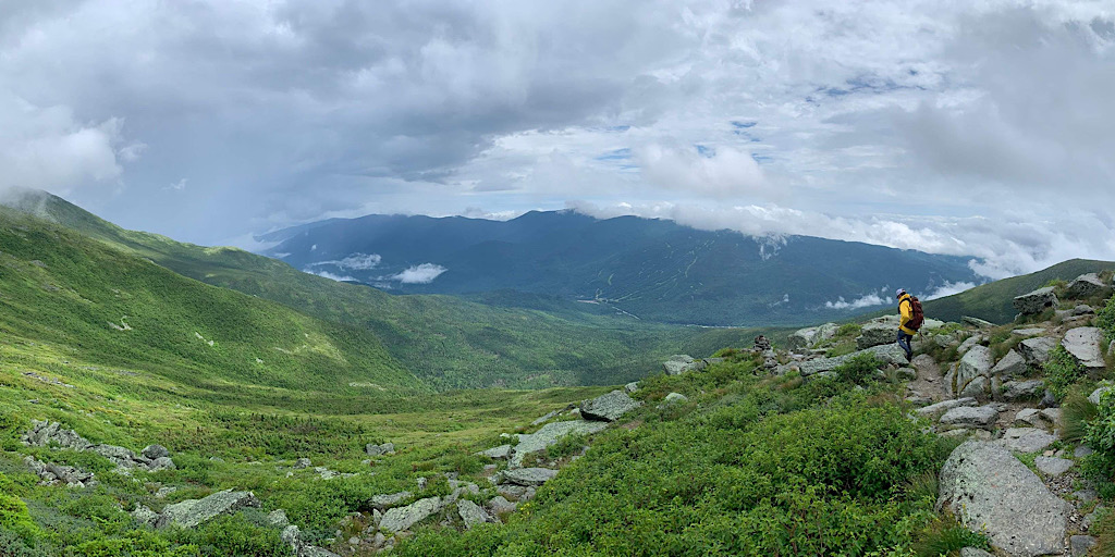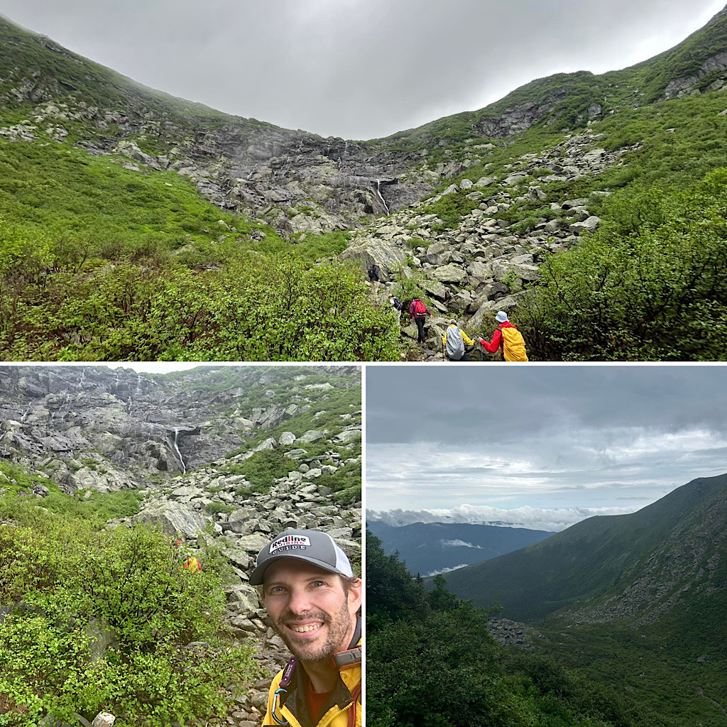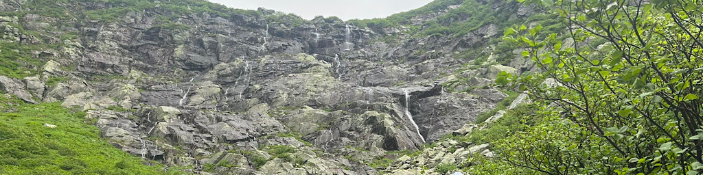 Wild day guiding a group on Mount Washington. Forecast called for rain, with high probability of severe thunderstorms. Not long after we started, we got hit by a heavy downpour. We went for cover under some trees so we could put on rain gear. A little further up the trail, and it was just a light shower, but we were already soaked. So, we decided to continue on, and see what happened with the weather. As we pushed upward, the rain stopped and the wind picked up. At the next major intersection, we could see the summit was totally socked in by fog, with high winds. We made the decision not to summit, and decided to go across to the Alpine Garden and make our way down. We hit Lion Head, and from there we could see clearing off in the valley. We took a lunch break, and then started down as the sun broke through the clouds. It got warm enough with the sunshine, we all shed our rain gear for the rest of the way down. Back at the bottom, it was blue skies and warm sunshine. As those of us that live and play in the White Mountains say, never expect the weather to do what it is expected to do. The weather in the White Mountains is unpredictable! —Gregg