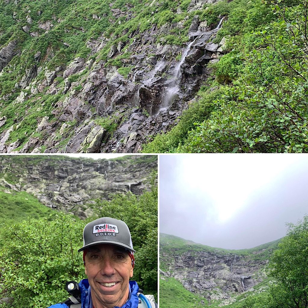 Huntington Ravine was on the table, but the air was so wet, the clouds coming and going, and morning sprinkles added to the soggy problem. A little wetness is okay, but the more of it there is, the more dangerous the hike becomes, especially if Huntington is on the agenda. Tuckerman Ravine was Plan B and that is the plan Redline Guides Chase Hall and Gregg Ludvigson opted for. In the interest of safety.