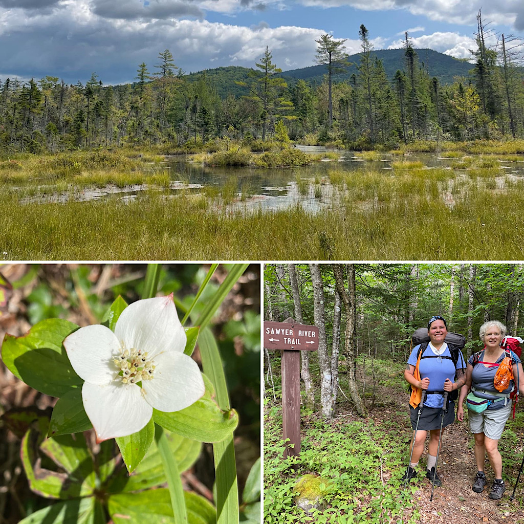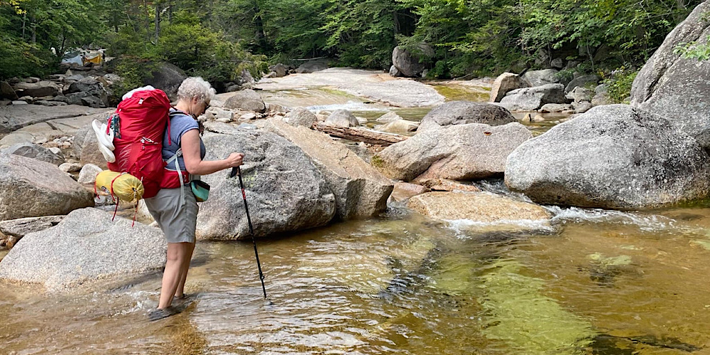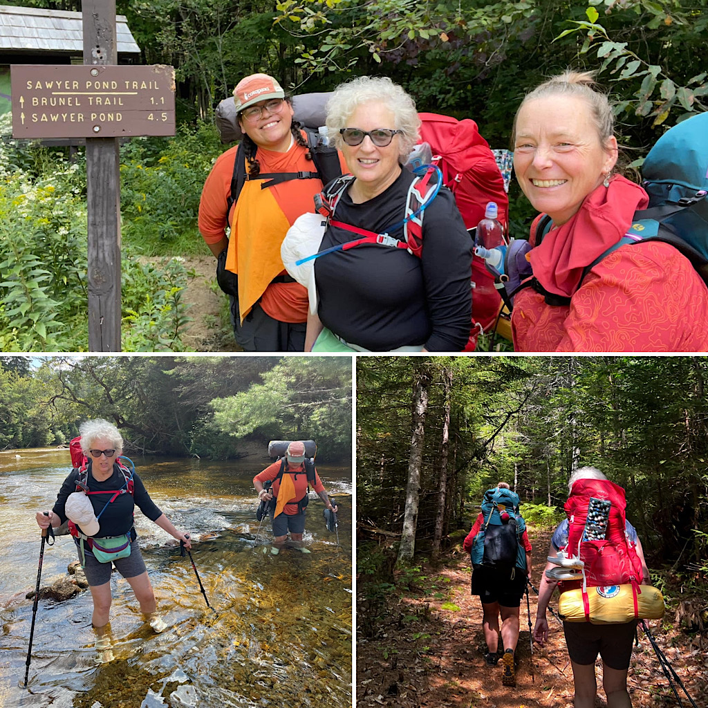 This was the final in a series of educational, women’s only backpacking trips for the Hiking Buddies Group. Stay tuned for a fall offering or two. On this trip the destination was Sawyer Pond and was led by Redline Guide Arlette Laan. This site’s a little tougher to get to this year as the closer access road is closed due to a major wash out. That said, it is still accessible from the Kancamagus Highway (NH Rte. 112 a.k.a. The Kanc), but it now involves more hiking and an access-guarding crossing of the Swift River. Next up is Arlette’s summary of this educational trip along with some crowd-sourced photos (thanks team).