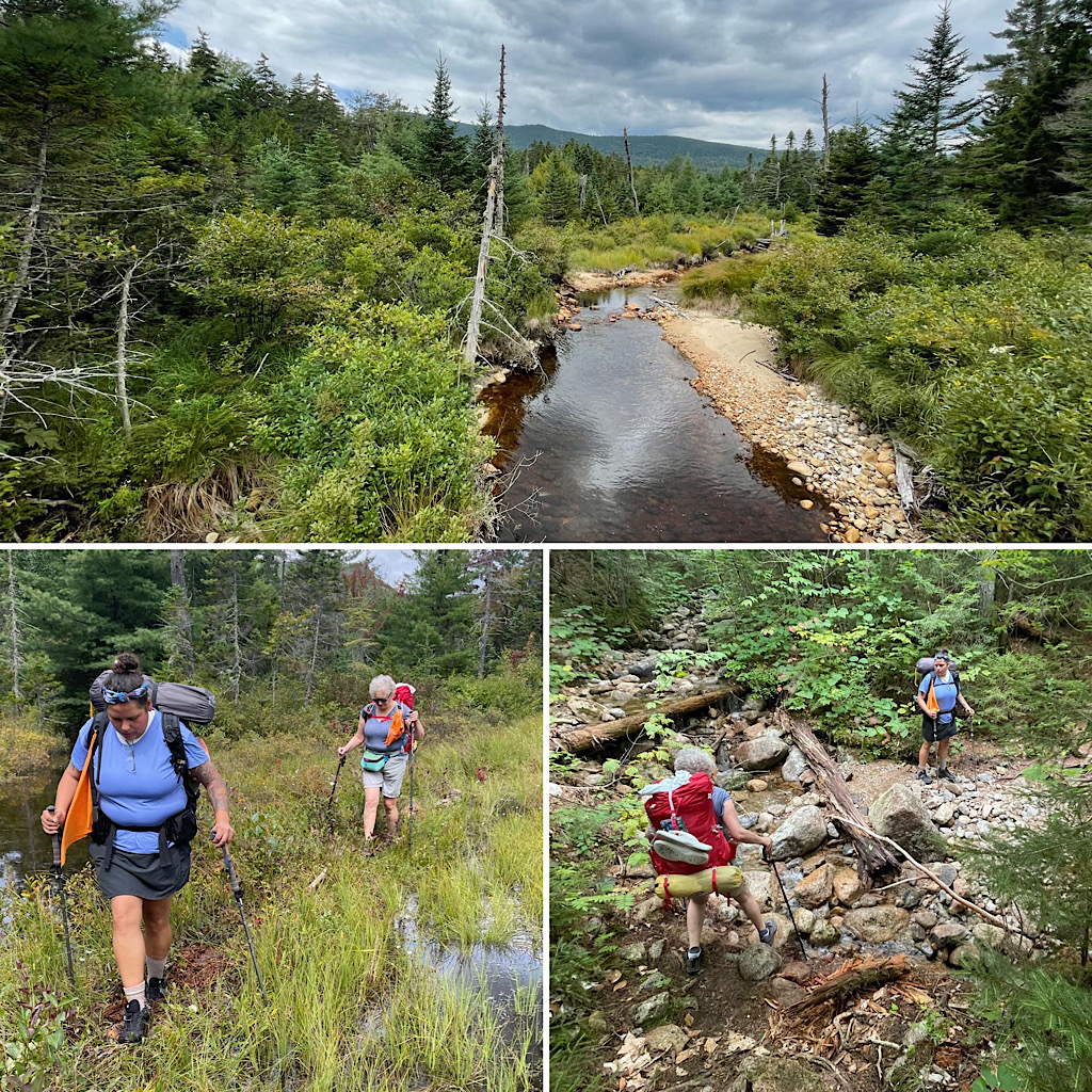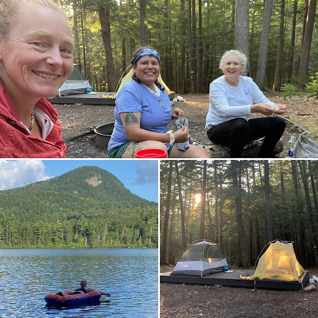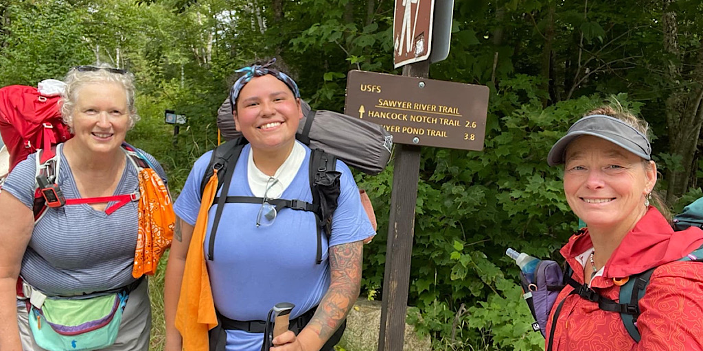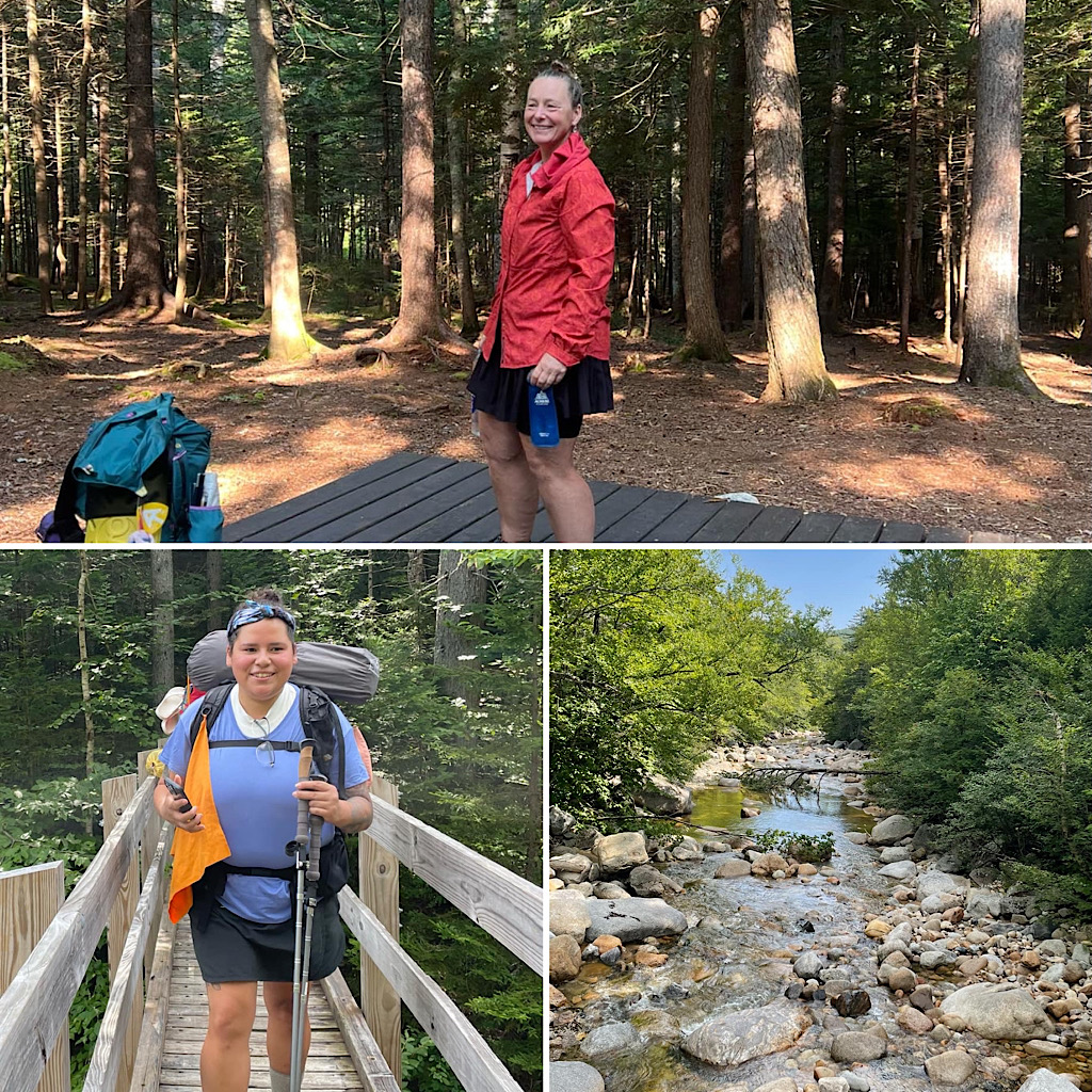 This was the final in a series of educational, women’s only backpacking trips for the Hiking Buddies Group. Stay tuned for a fall offering or two. On this trip the destination was Sawyer Pond and was led by Redline Guide Arlette Laan. This site’s a little tougher to get to this year as the closer access road is closed due to a major wash out. That said, it is still accessible from the Kancamagus Highway (NH Rte. 112 a.k.a. The Kanc), but it now involves more hiking and an access-guarding crossing of the Swift River. Next up is Arlette’s summary of this educational trip along with some crowd-sourced photos (thanks team).