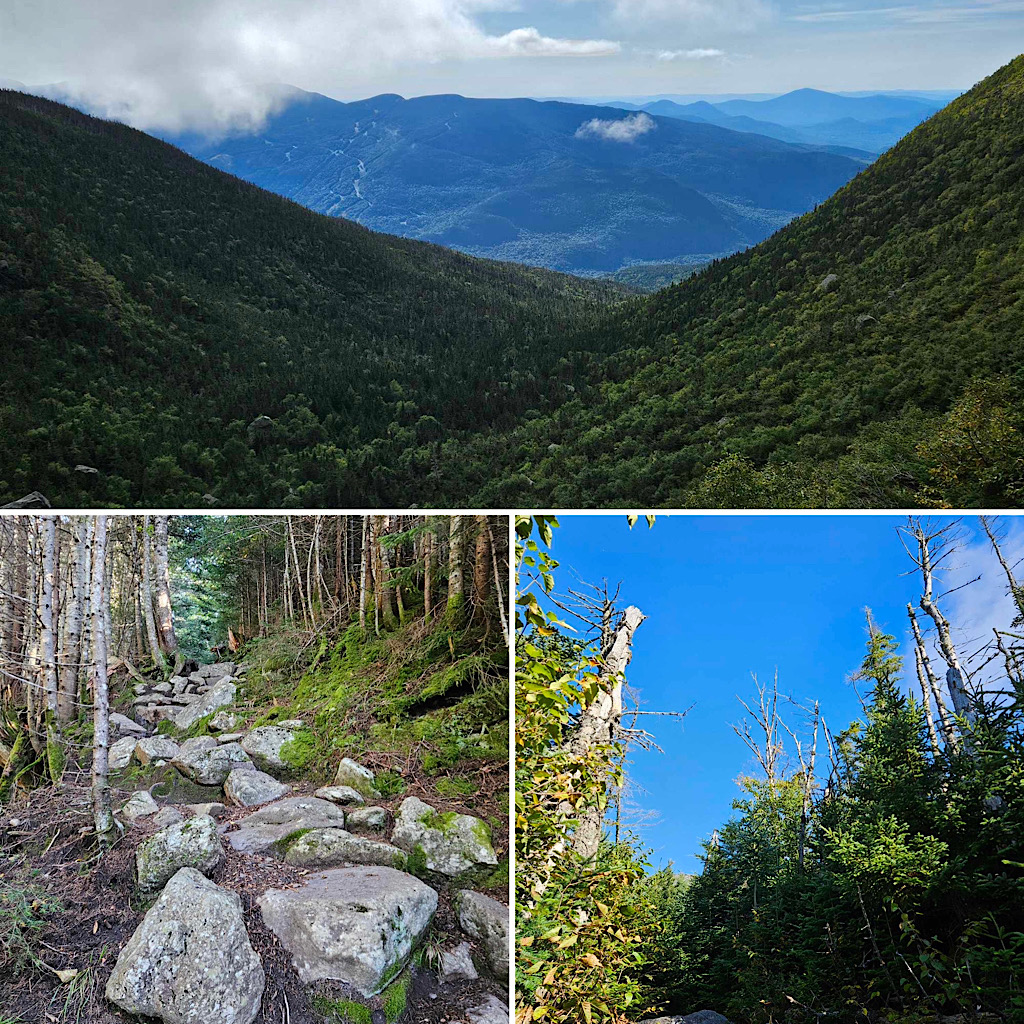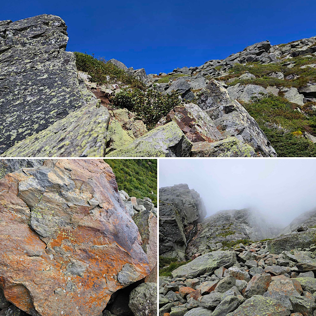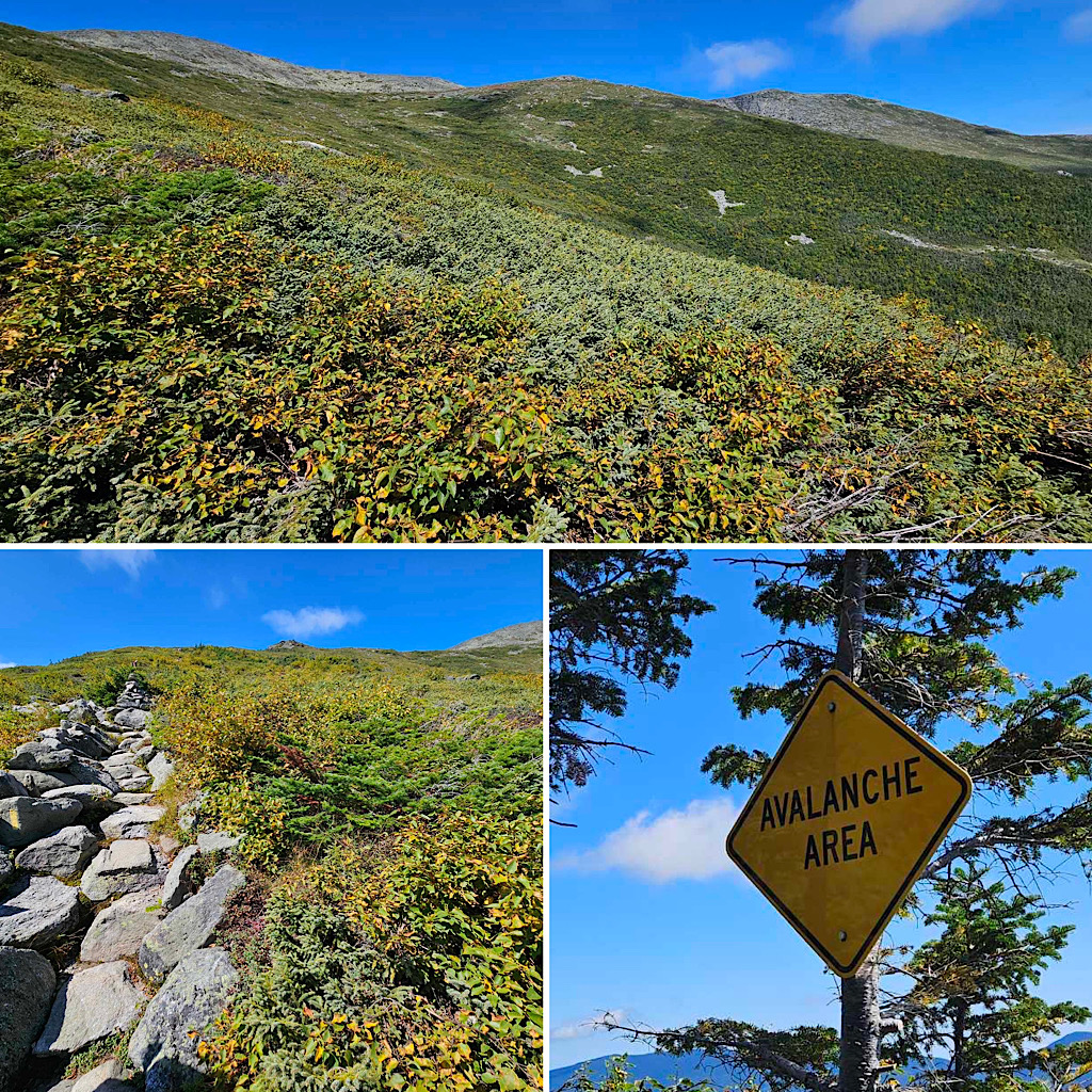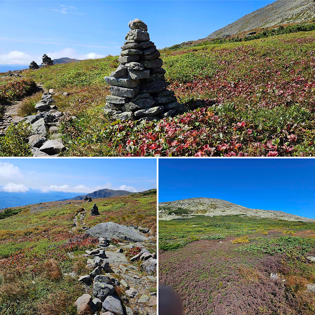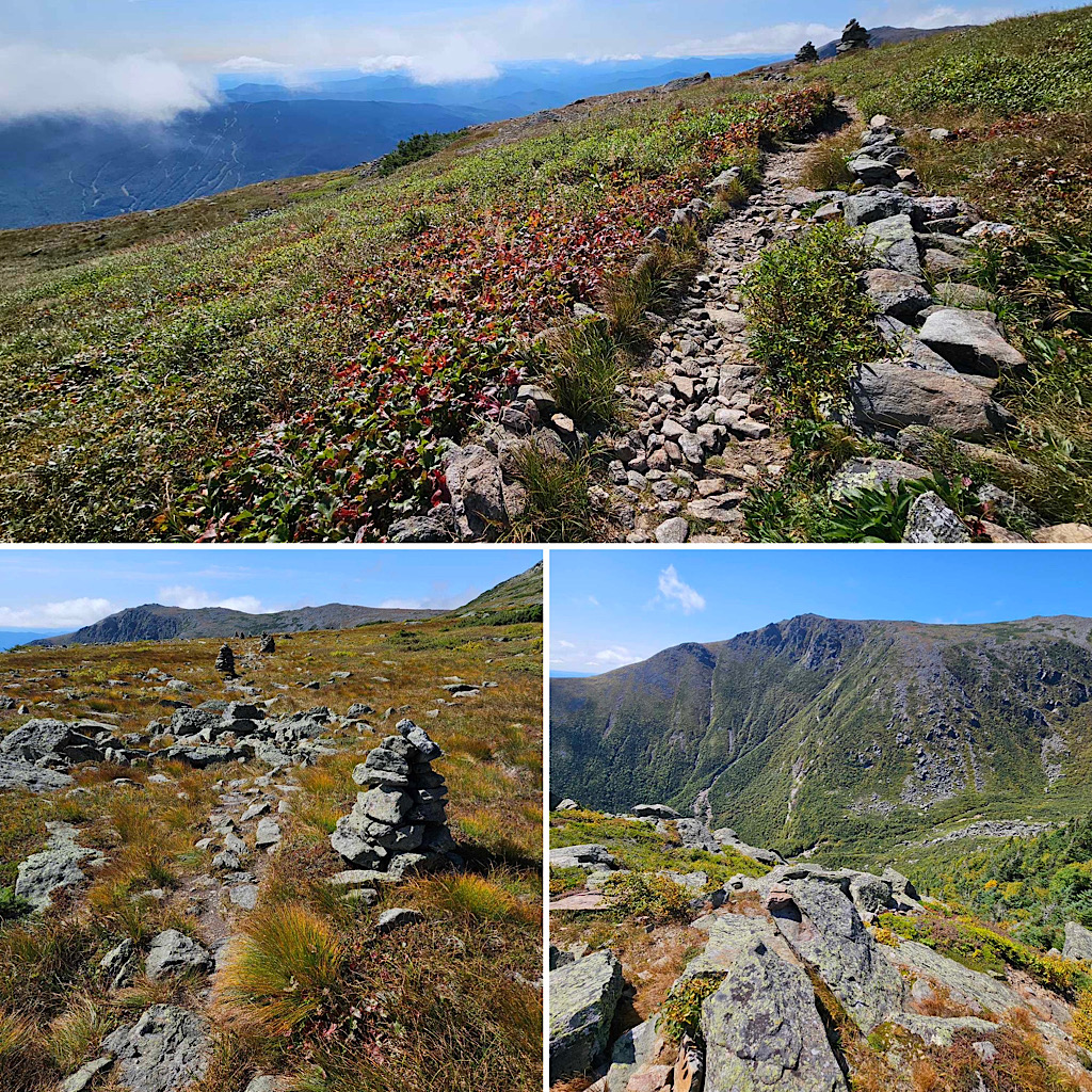 So, on a beautiful summer day, we hiked Huntington and then slowed down to soak in the sunshine and views on the Alpine Garden Trail, a favorite for both of us. As August draws to a close, we noticed that the leaves on the ground plants along the Alpine Garden had started showing their fall colors. We stopped to take in the still snow-free summer views of Tuckerman Ravine before hiking down Lion Head and back to Pinkham Notch.