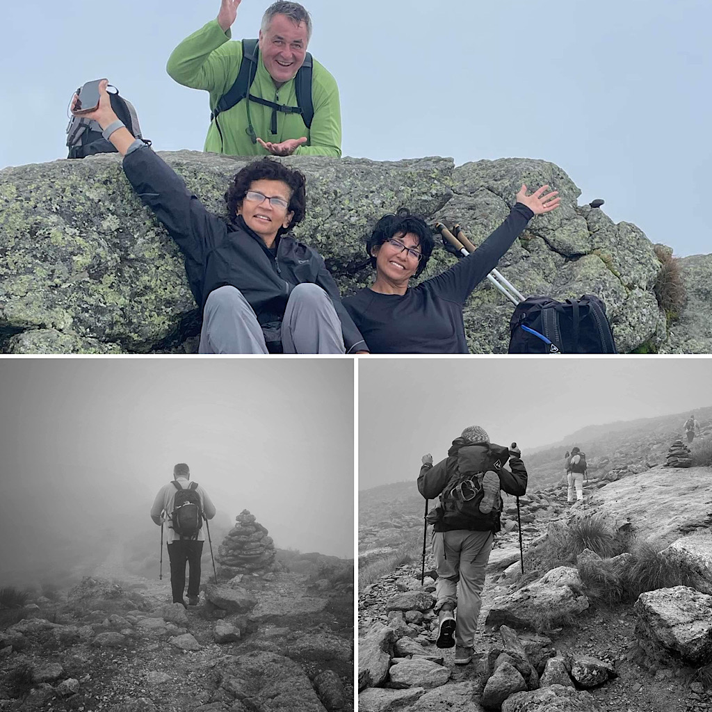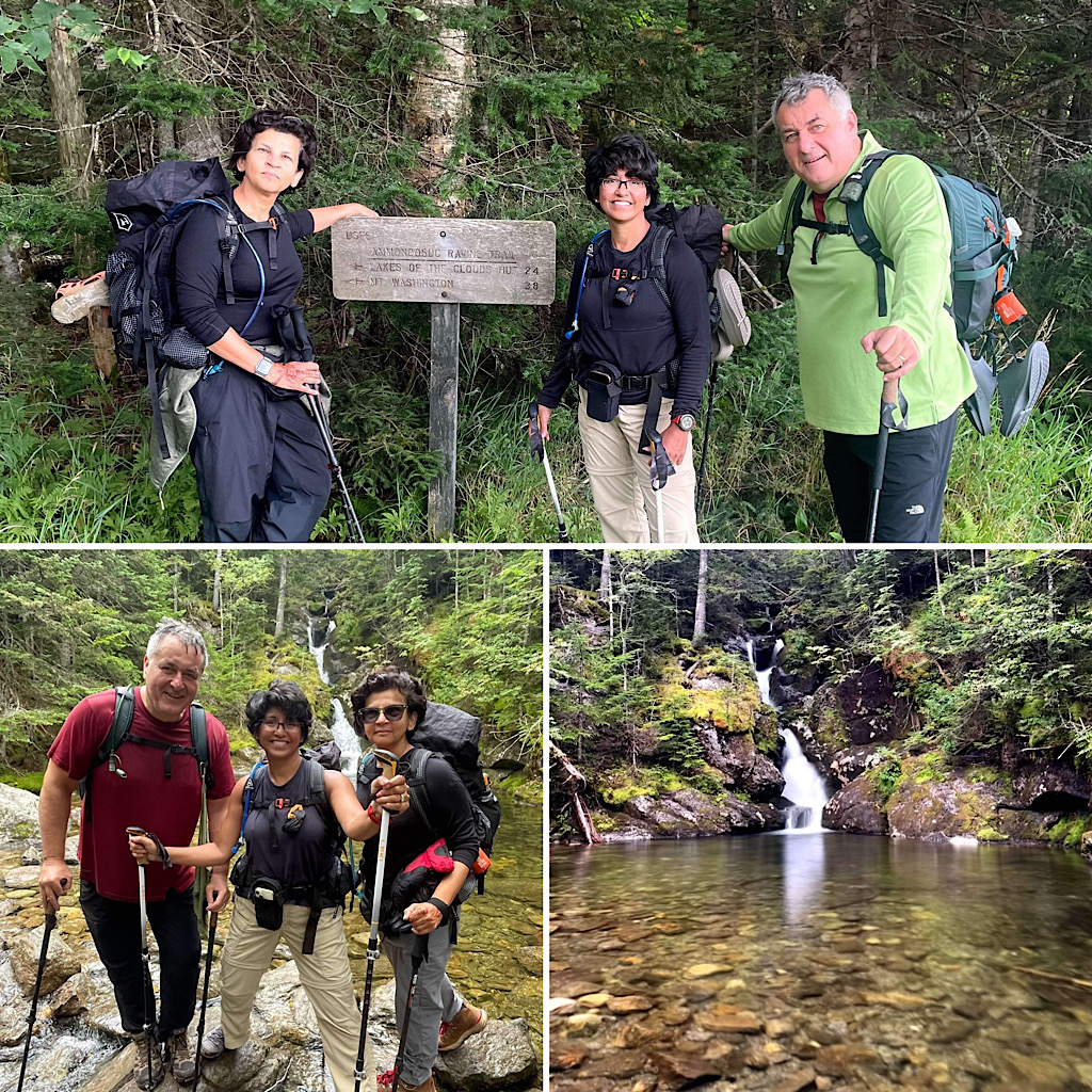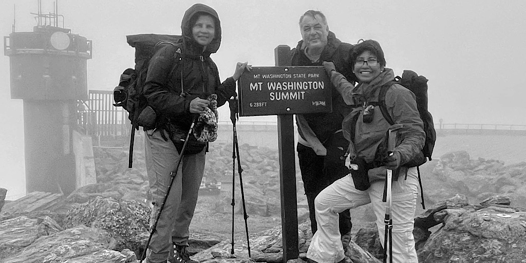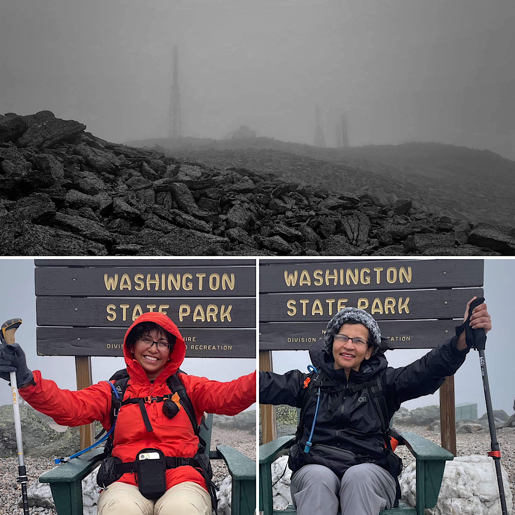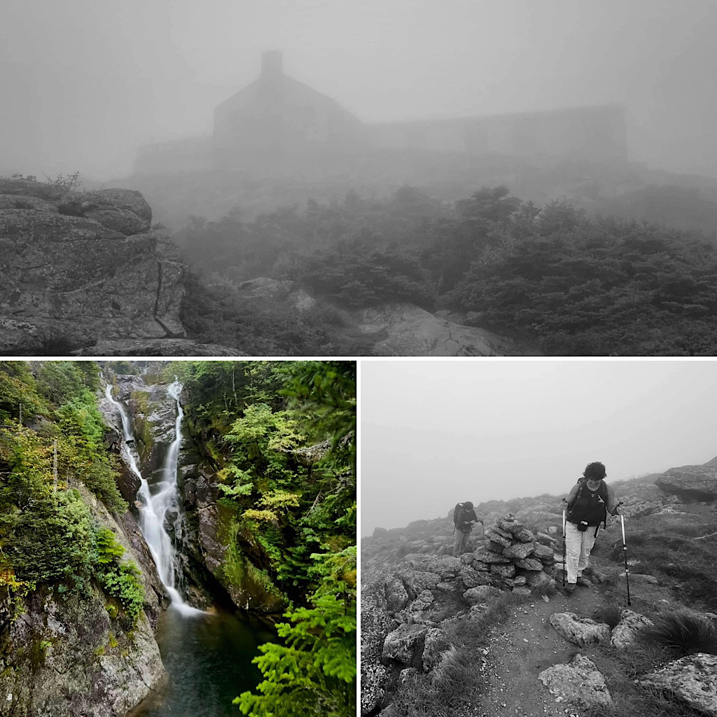 This last adventure put them in some difficult terrain as we negotiated the Ammonoosuc Ravine Trail on a misty day. The rocks were slick and above treeline the visibility was limited. After a break at the hut and happily unloading their overnight gear, the guests were eager to head up Mt Monroe and were still smiling when we made it to the socked-in summit.