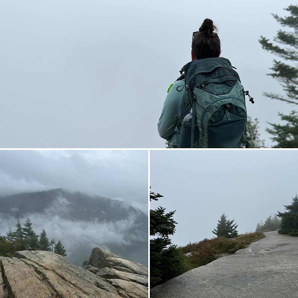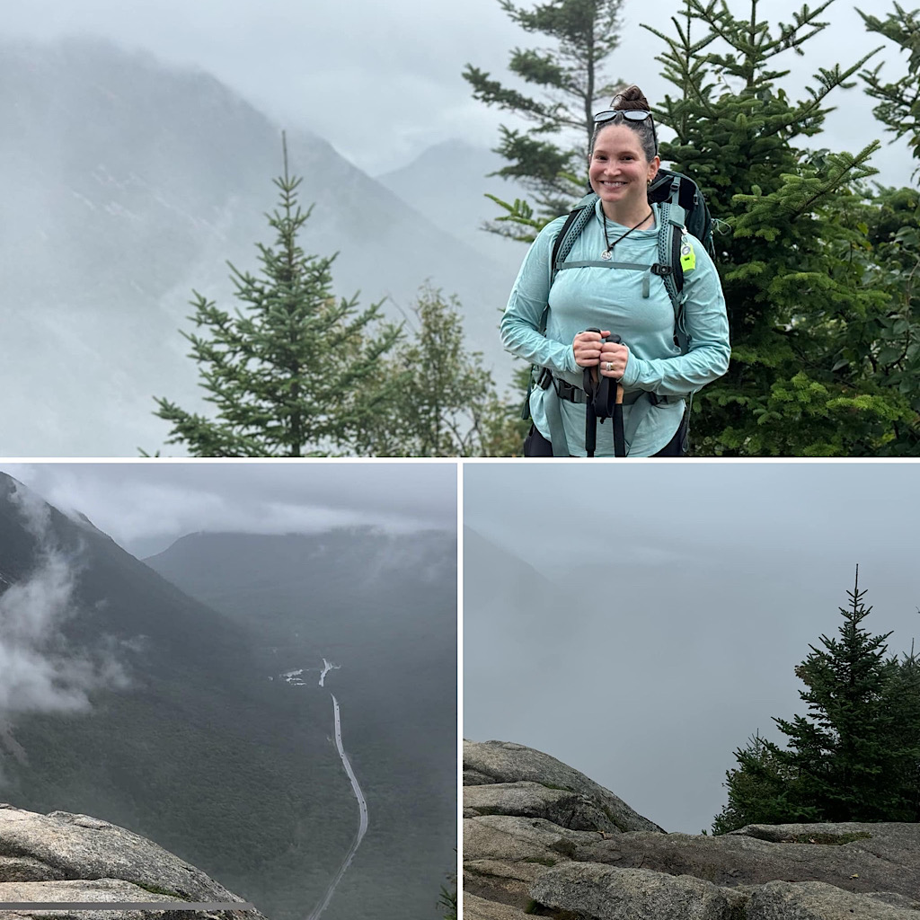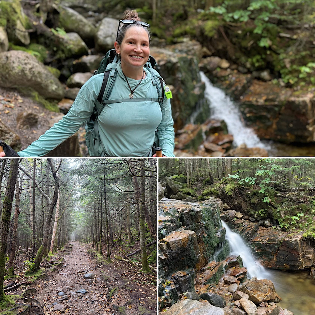 After eating lunch, we set out to hike Mount Willard, one of the peaks on the 52 With-A-View list that our guest is now inspired to continue exploring. It was raining when we got to the trailhead, which was perfect for testing gear in a controlled, low-risk environment. Our guest did a fabulous job preparing for this hike by hydrating and nourishing herself beforehand. She was also able to learn how to use trekking poles, specifically during water crossings, and on the descent. We talked a lot about erosion and how to hike on a trail, while minimizing impact to the surrounding forest.