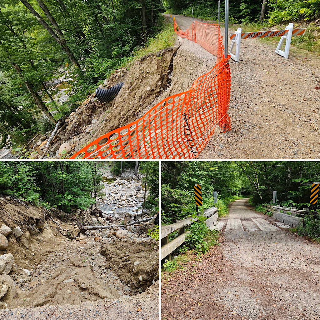 We look at the mountains and consider them steadfast and unchanging, and they do appear to have permanence at a glance. But if you observe them over time and are paying attention to the details, you may realize that the landscape as a whole is in constant motion. Rocks roll, break, crumble into sand, and are washed away by rains eventually making it the sea. We see the erosion, but the scale of these events is minute. Only when we see it in action under our very feet, or feel the aftermath of larger events, do we really take note. Usually with little to no effect on us. But in other cases, it has profound impact. Take for instance one of the more popular 4000-footers, Mt Carrigain (4680′). By its most popular route, Signal Ridge Trail, the hike is about five miles in, and five miles out — at least in the warmer months when the access road is opened to vehicular traffic. In the winter, however, when gated, we must add two miles in each direction changing the more normal ten miles into almost fifteen. That’s how it used to be. Then, bam, weather. The road gets washed out forcing a prime season and likely multi-year closure. And that is the case today as Redline Guide Debra McCown documented in a few photos. This wasn’t unknown to us, and it has happened before, but it does offer us a reminder to the impermanence of it all. Before we get to the photos, however, Debra wrote this short summary of the day, leading one returning guest to a longer-than-normal out-and-back.