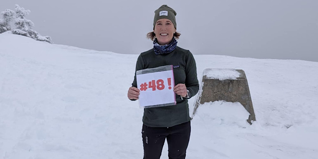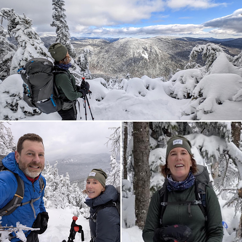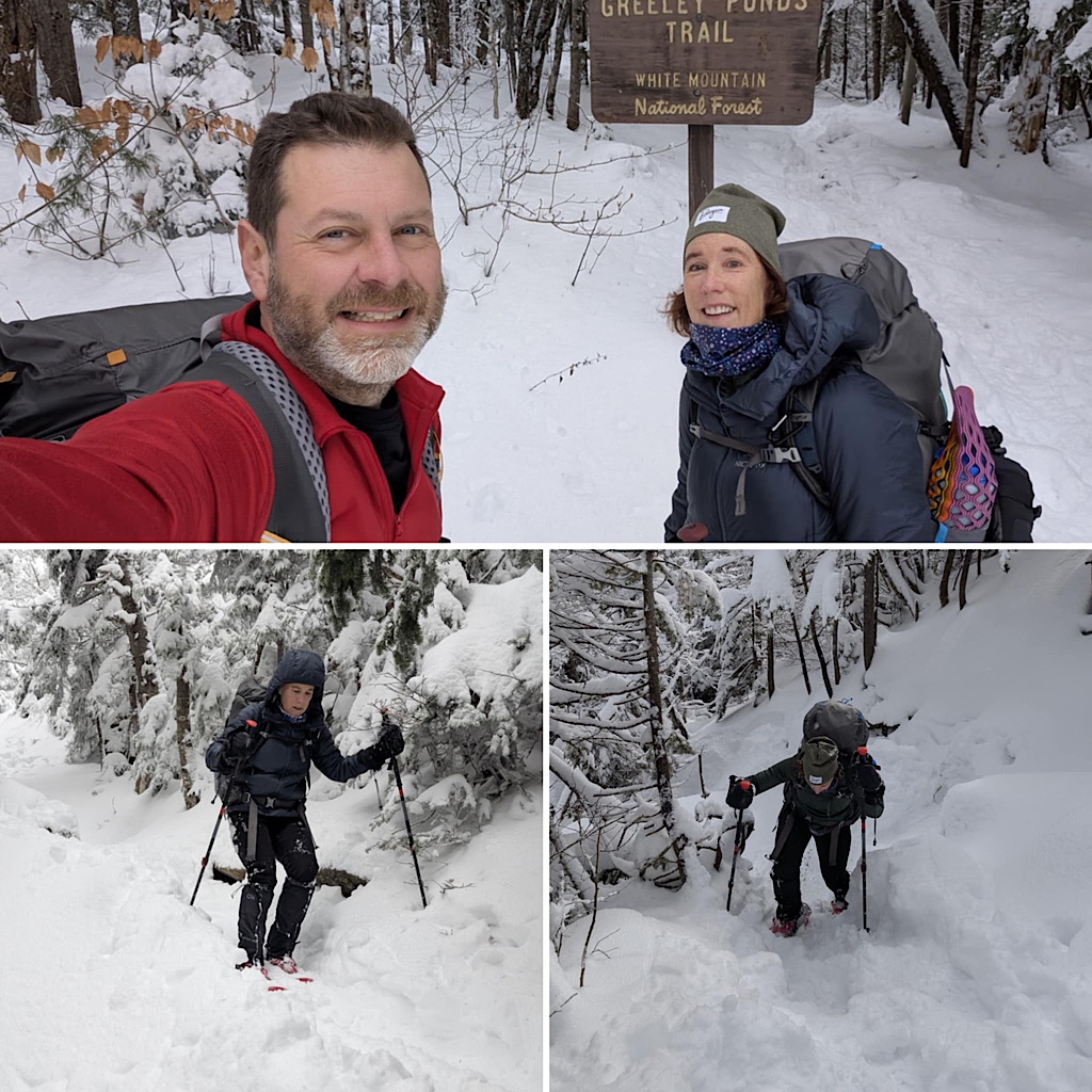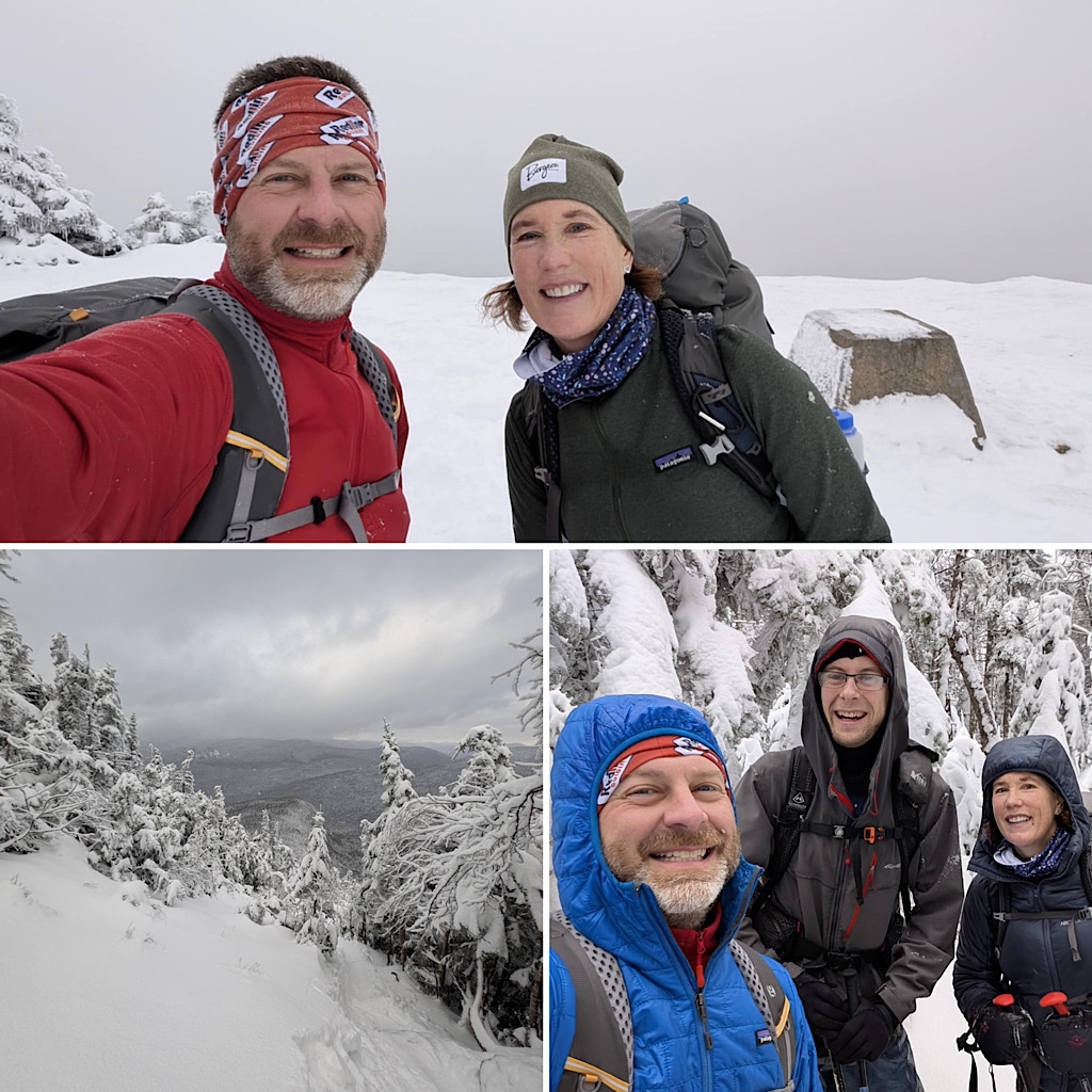 With two peaks left for her NH48, our guest and I hiked the Osceolas as an out-and-back from Greeley Pond Trailhead, the de factor winter route now that Tripoli Rd is closed for the season. Six inches of new snow at the trailhead led to 10″ at elevation, and we wore snowshoes from the start. Trailhead temps were 27°F while at the main Osceola summit it was a breezy 18°F at around 1PM. Leading up to East Osceola we enjoyed a really nice view at the slide crossover, a gem and one of my favorite viewpoints in the Whites. The infamous “chimney” section between the summits was iced/drifted over, so we took one of the available bypasses and were able to puzzle our way up and then slither back down, which took a few extra minutes but presented no real trouble! The summit of Mt Osceola was in the clouds, but with relatively no wind we were able to hang out, have lunch, and celebrate our guest’s 4k finish. On the return, for the final steep descent from East Osceola we switched into full crampons for traction, which really helped with the loose snow over ice. Our hike timing was perfect and we finished just before sunset. Along the way we crossed paths with hiker friend and endurance athlete who was on his #114 of Single Season Fall NE115 (he finished on Tecumseh the next day). We spent a few minutes chatting with him about our hikes/projects, but in typical White Mountain hiker attitude, he was way more interested in giving kudos for our guest becoming the very newest NH48 Finisher! Congrats to her… she crushed it! —Eric