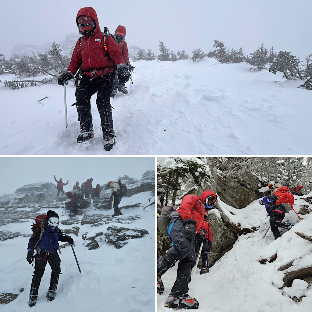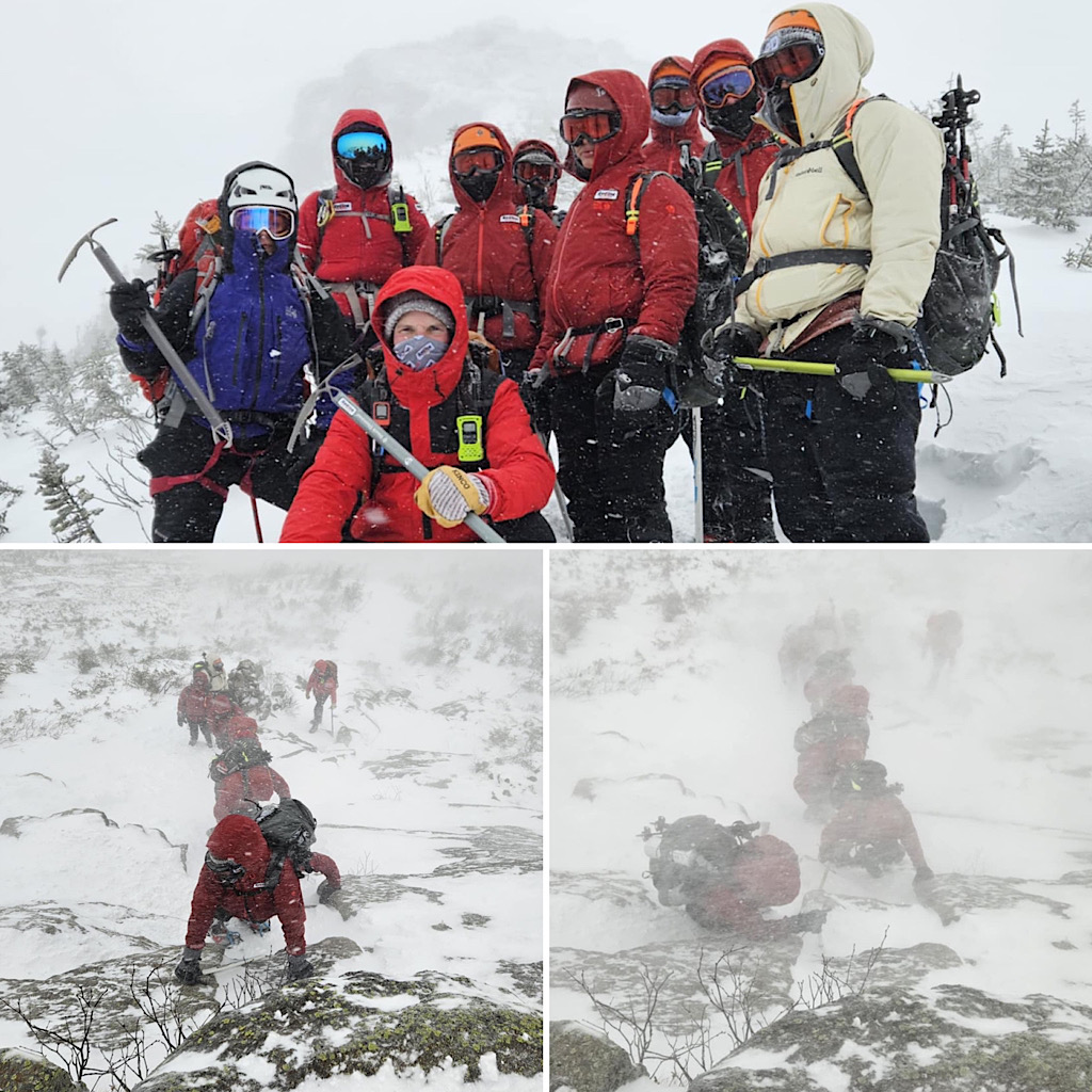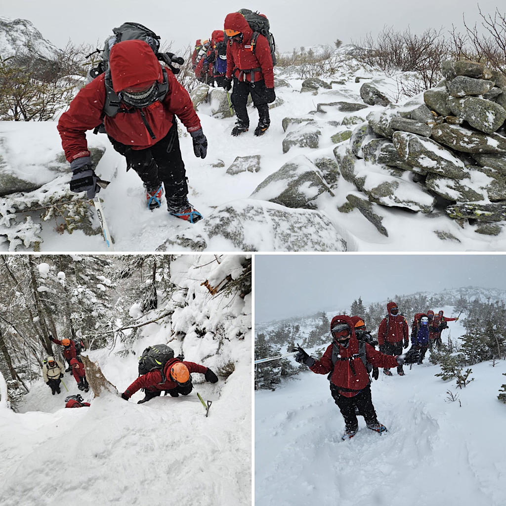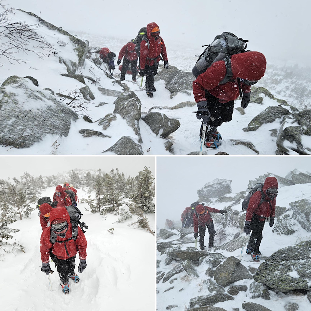 We were contacted by a NYPD-affiliated outdoor club looking to get some training for winter hiking and mountaineering skills and to take on the legendary Mt Washington — known to be the “Home of the World’s Worst Weather,” according to the Mt Washington Weather Observatory (MWOBS) — an opinion shared by many. On the job for this weekend were Redline Guides Debra McCown and Chase Hall. The summit ended up being the rocky, wind-blasted Lion Head formation — a Mt Washington sub-summit — thanks mostly to some strong winds, time-of-day, and occasional periods of limited visibility. What follows are a bunch of photos (and one video) of their mountain epic.