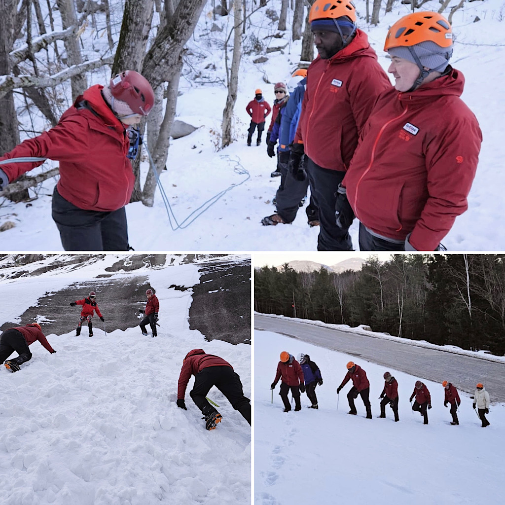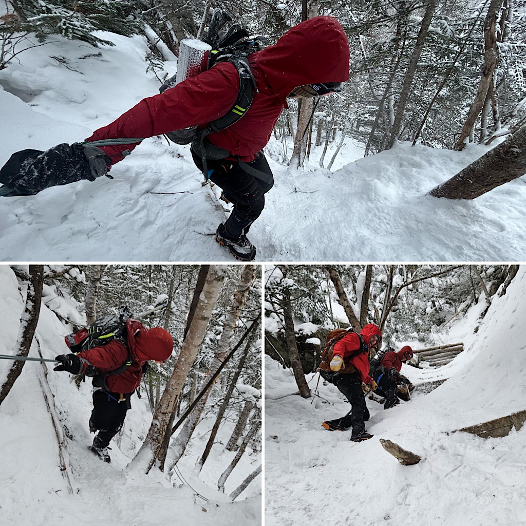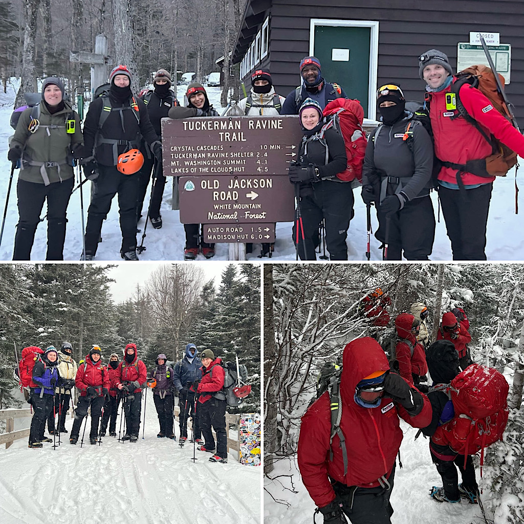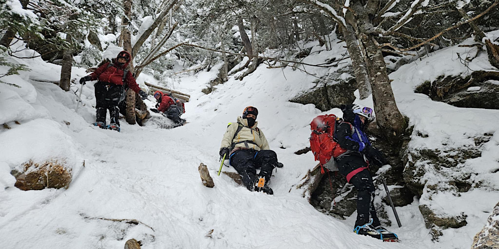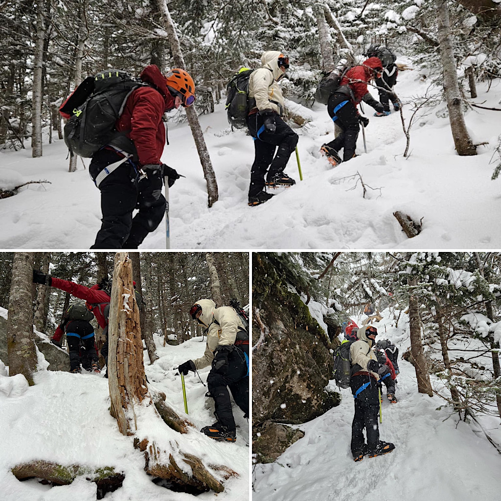 We were contacted by a NYPD-affiliated outdoor club looking to get some training for winter hiking and mountaineering skills and to take on the legendary Mt Washington — known to be the “Home of the World’s Worst Weather,” according to the Mt Washington Weather Observatory (MWOBS) — an opinion shared by many. On the job for this weekend were Redline Guides Debra McCown and Chase Hall. The summit ended up being the rocky, wind-blasted Lion Head formation — a Mt Washington sub-summit — thanks mostly to some strong winds, time-of-day, and occasional periods of limited visibility. What follows are a bunch of photos (and one video) of their mountain epic.