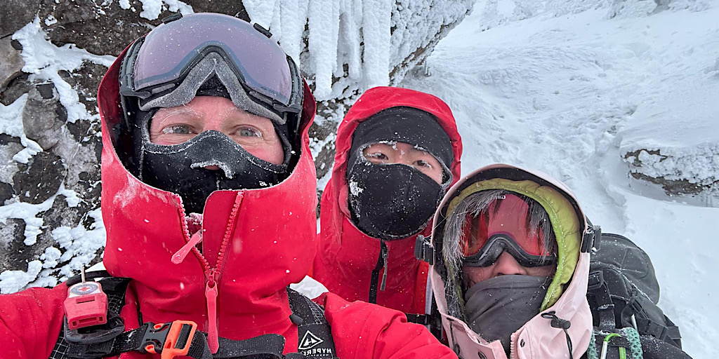 We sometimes joke that we will ask for a return fee from our hiking guests when standing on a summit somewhere. It’s only a joke, though, as payment for our tours are bi-directional: we bring you up, and we bring you back — fully back. Safe and sound, and in one piece. This is an industry standard and is a given in our eyes, but on some days it is more challenging than on others to accomplish this. Sometimes poor visibility, strong winds, and icy temps make safety a bit more elusive. Risks do come standard with the sports of winter hiking and mountaineering, though. Even in the White Mountain National Forest.