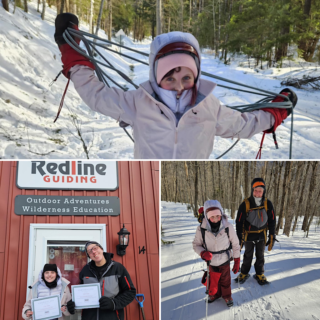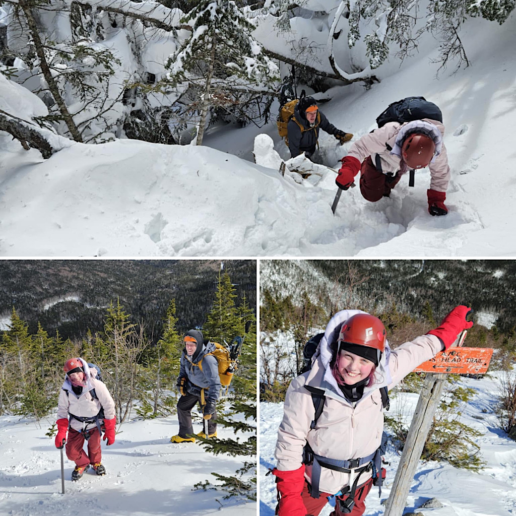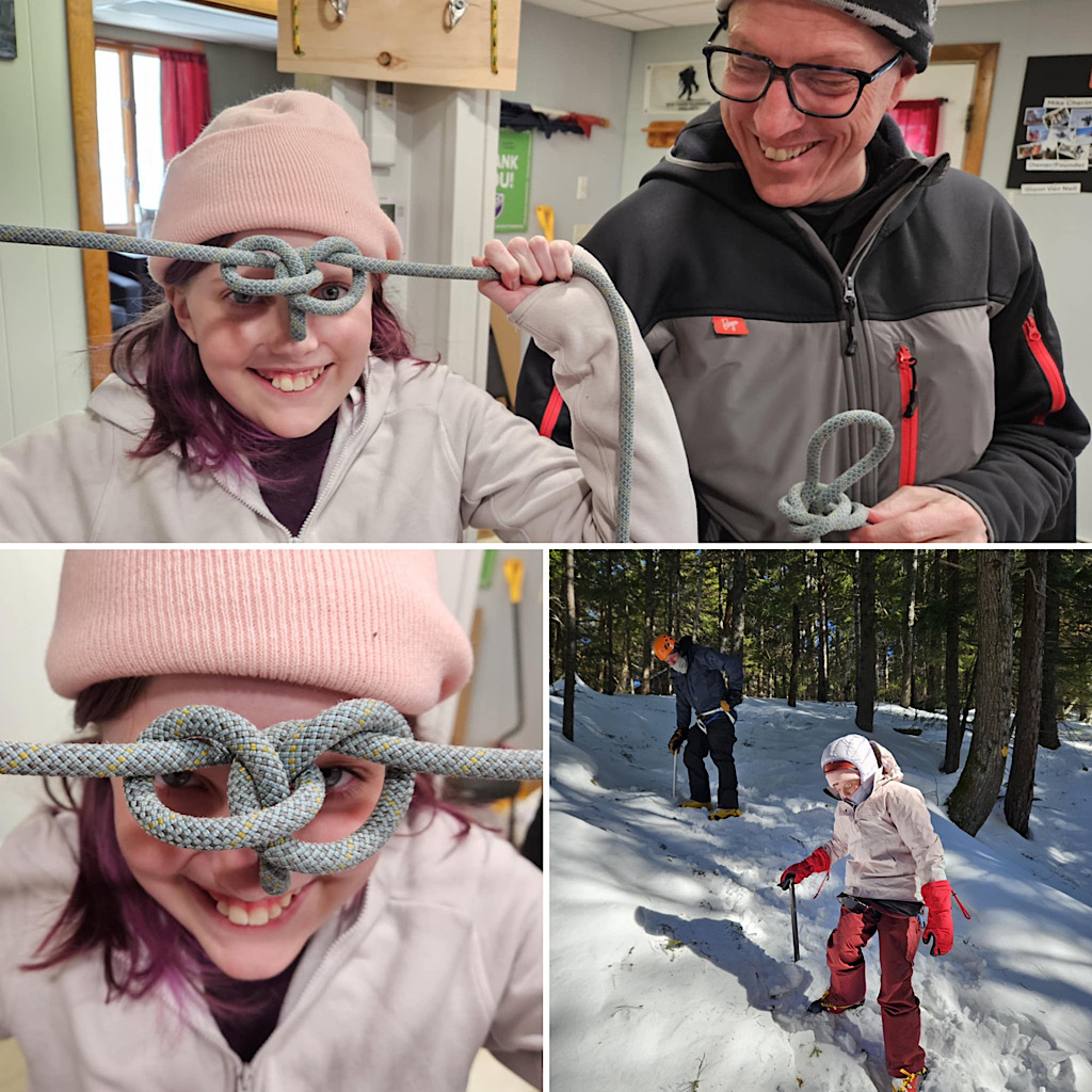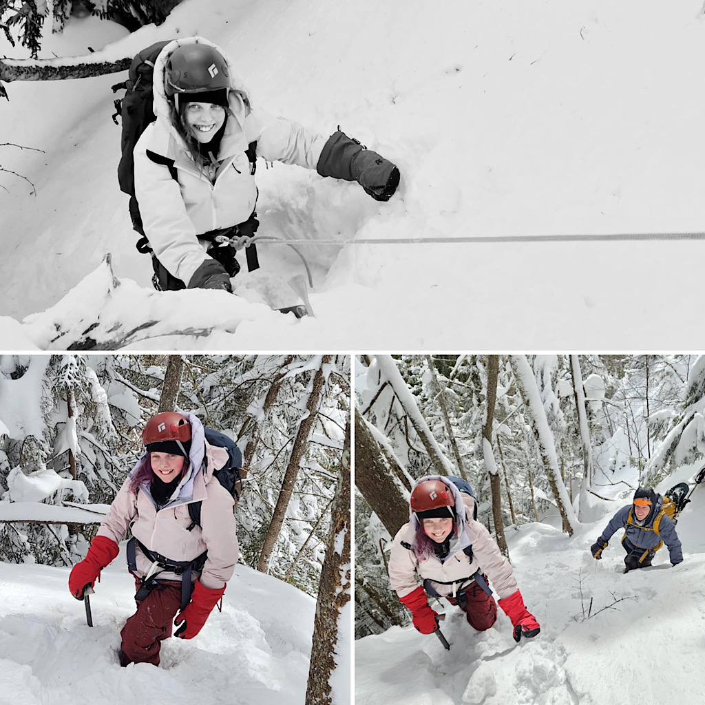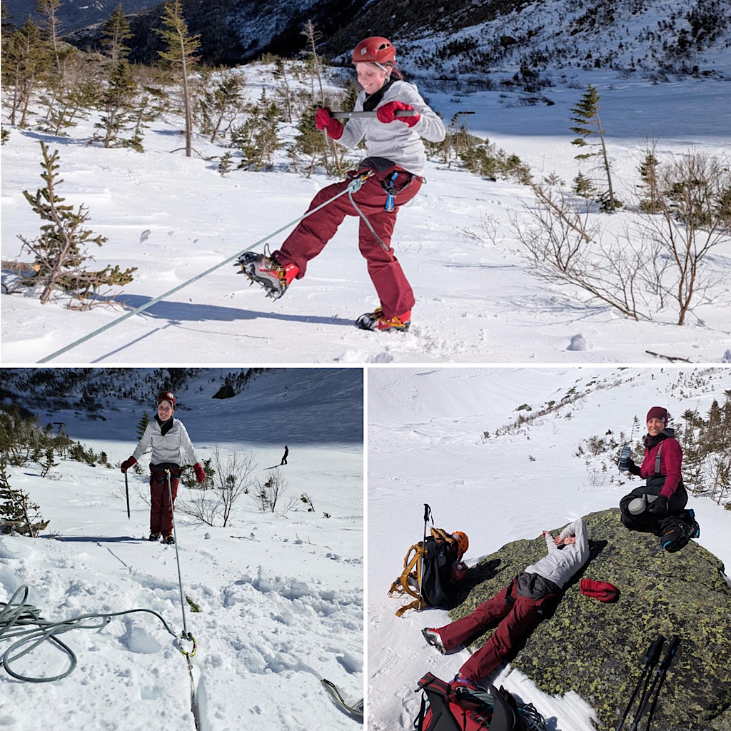 Some highlights of day three, besides watching some skiers take on impressive lines in the Ravine, as reported by Redline Guide Debra McCown, was building snow anchors, belaying, the little girl dropping her dad in the snow, checking out a helicopter flying overhead, and of course, what any twelve year old would love to do, glissade on steep snow (with a clear and safe runout, of course). Debra also added: “This kid is crushing it in all seasons.” Now for some photos of their time with us: