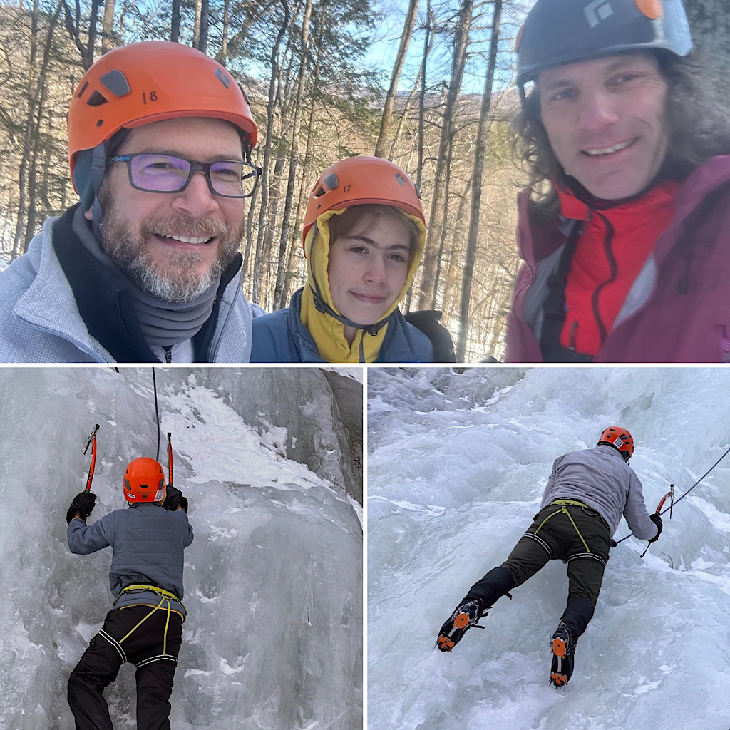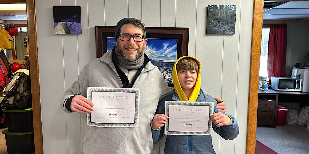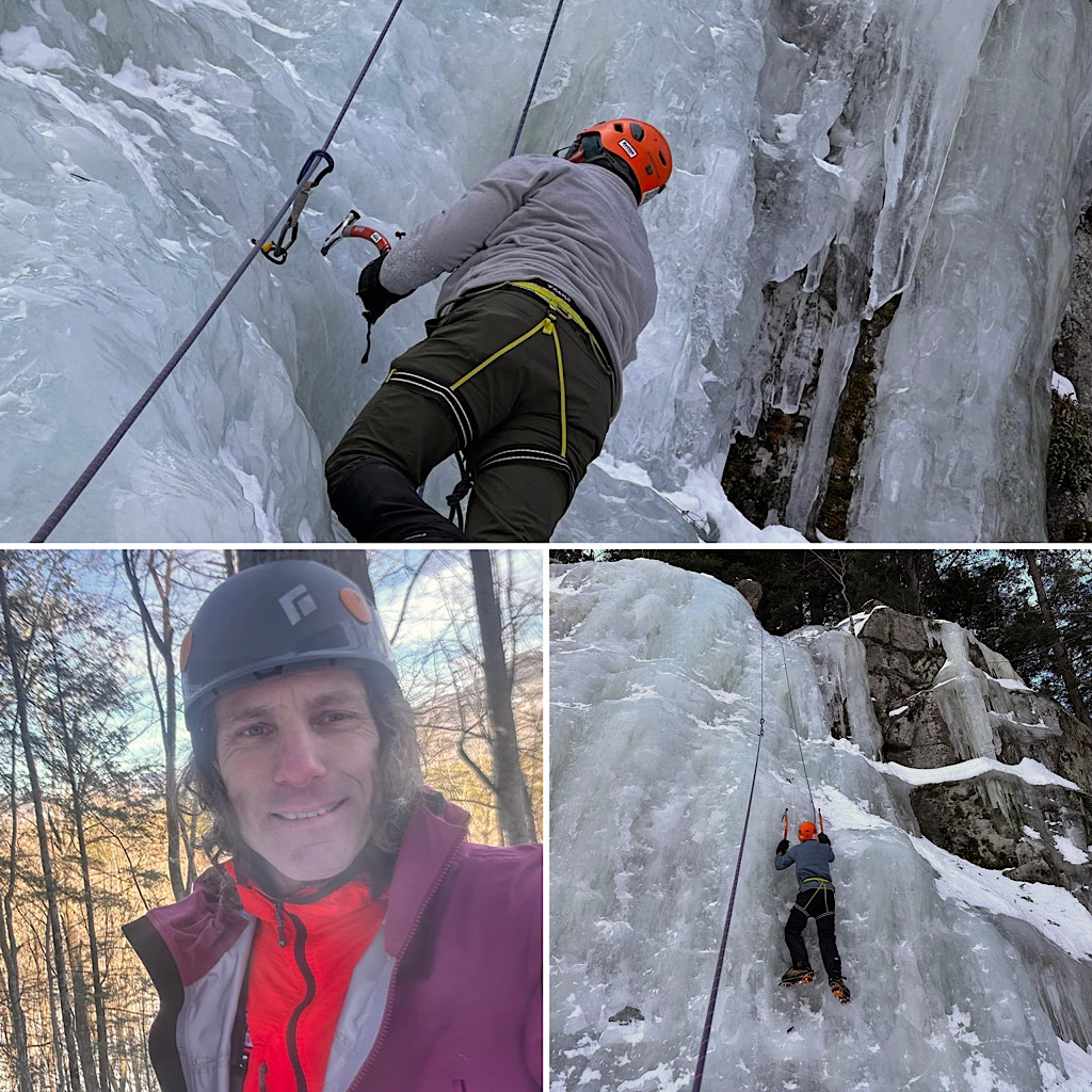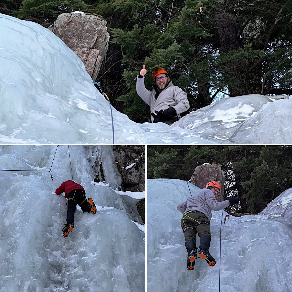 A returning guest and his son wanted to do a little top-roped ice climbing — another intro-level course — while in the area. Last time they were up we took them to the Cathedral Ledge North End. This time, Redline Guide Will Murphy decided to take them to Barking Dog off the backside of Humphrey’s Ledge. They had terrific weather for it , warmer and sunny, at least in the morning. Will showed them a good time, while expertly keeping them safe in the process. Now for a few photos of the day: