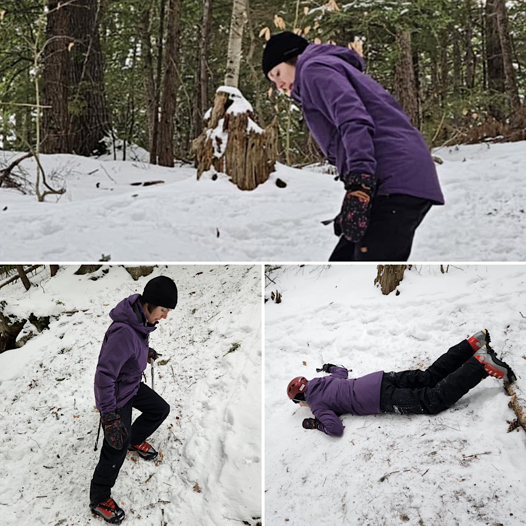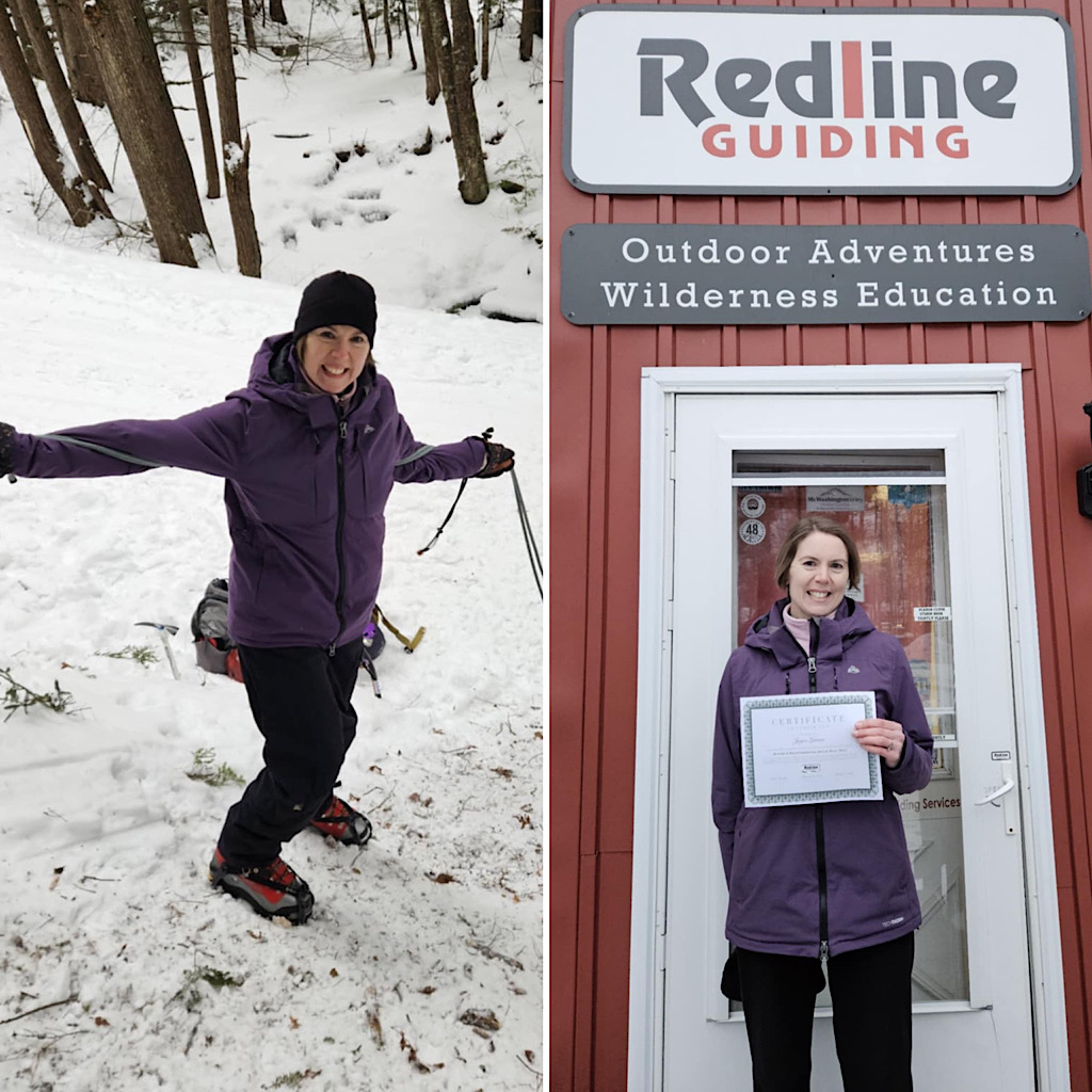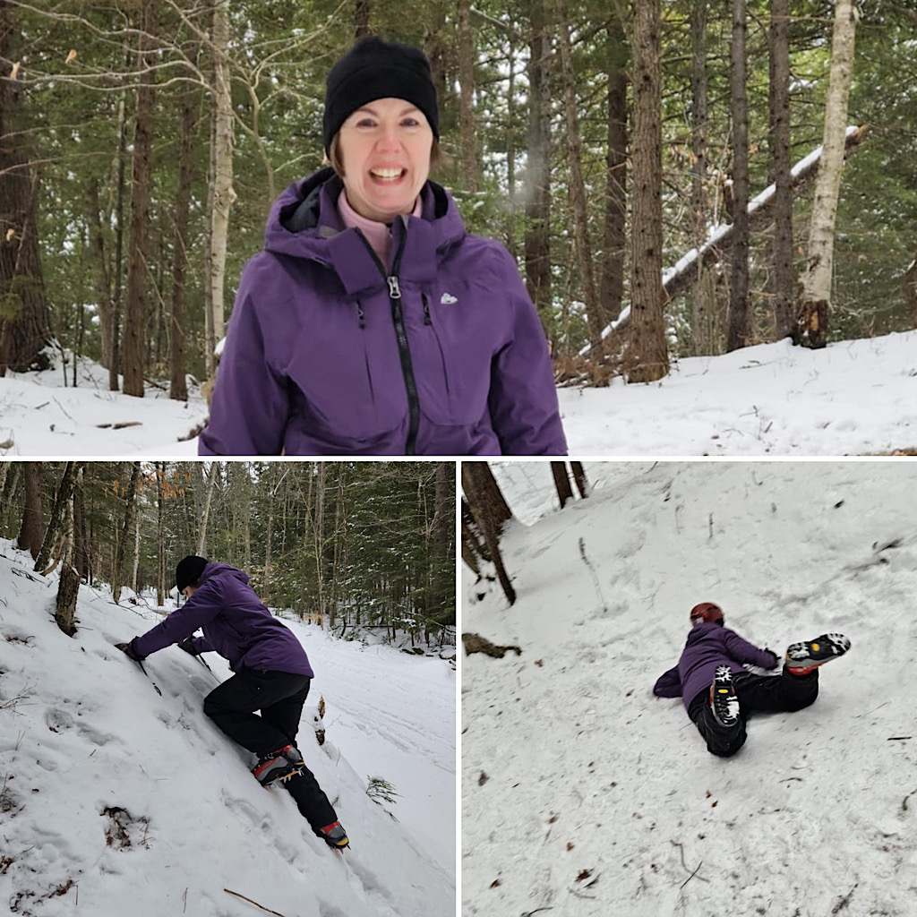 A guest and experienced WMNF hiker wanted to brush up on some Winter and Mountaineering skills in preparation for a climb up Mt Washington later this month. The climb she’ll make with friends, but she wanted to be sure to be able to bring her A-game and came to us for these two half-day courses. Teaching these classes was Redline Guide Debra McCown, and she also supplied these photos: