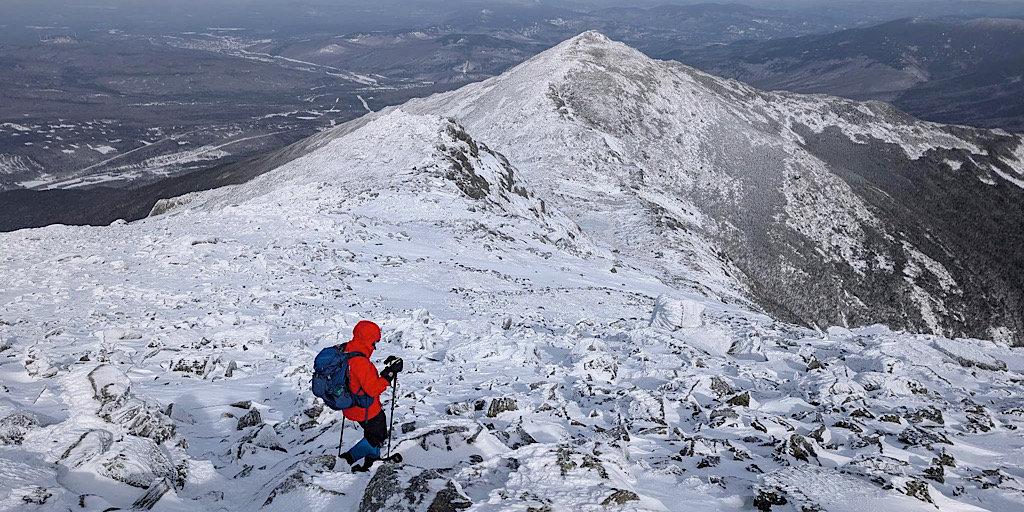 We had a great day to hike Mts Madison (5367′) and Adams (5793′). Our route was Valley Way to Madison Springs hut, then two out/back to the summits, descending Valley Way again. Trails were roughly broken out but soft and we wore snowshoes the entire hike. At Madison Springs hut we took a short break, snacked, and layered up for the alpine portion of the route. Madison summit cone was great, grippy snow, -1 deg F but with almost no wind on the summit. We took a nice but quick photo break the headed back down. Once back to the hut, we pivoted to Gulfside Tr and ascended Mt Adams. Windier there, 25 mph wind, but two degrees warmer than Madison! It was all manageable and conditions were quite favorable for mid February in the northern Presis. Our guest was very skilled and did great. We moved right along and snowshoed the route in roughly six hours elapsed. It was really a pleasure to guide this hike. —Eric