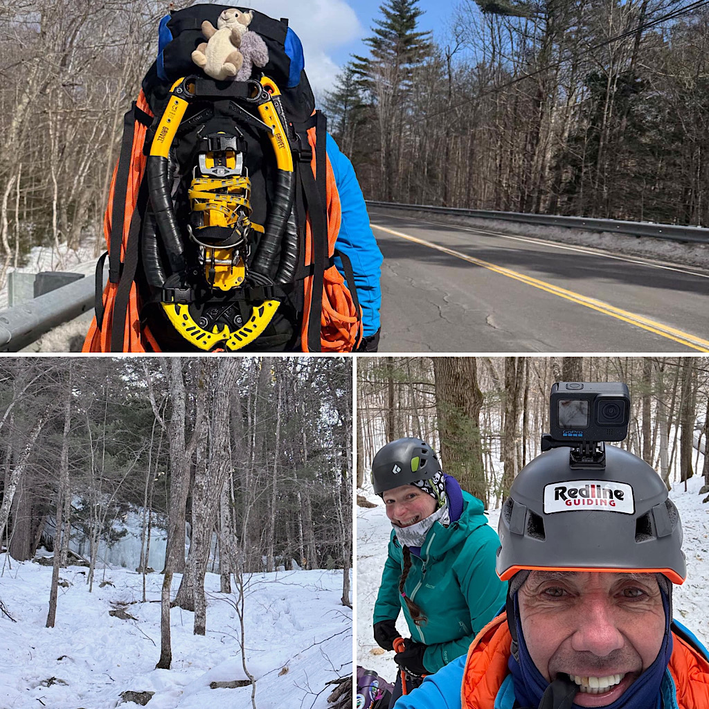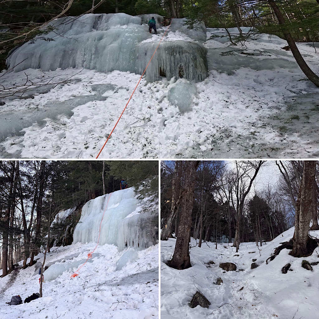A returning guest was looking for a fun day of ice climbing after a winter full of various hikes in the mountains. After the rain that hit a few days prior, I decided to take her to one of her, and my, favorite spots. I was surprised how good the condition of the ice was. The wind was howling, but this location is pretty well protected. Although, at times, the wind sounded like a freight train and it seemed like trees were going to start snapping like toothpicks. The approach up to the ice was probably the most difficult part of the day.