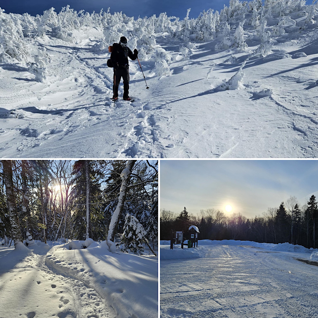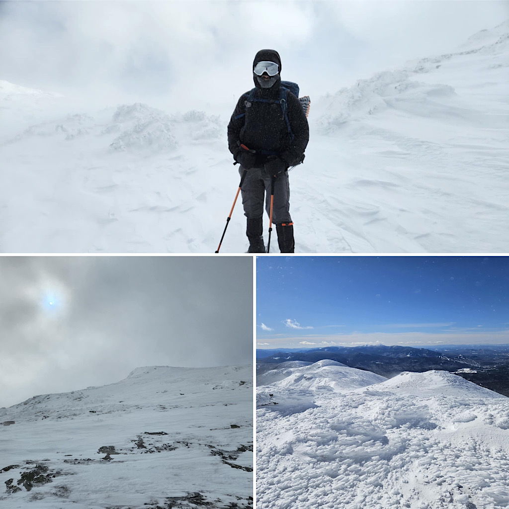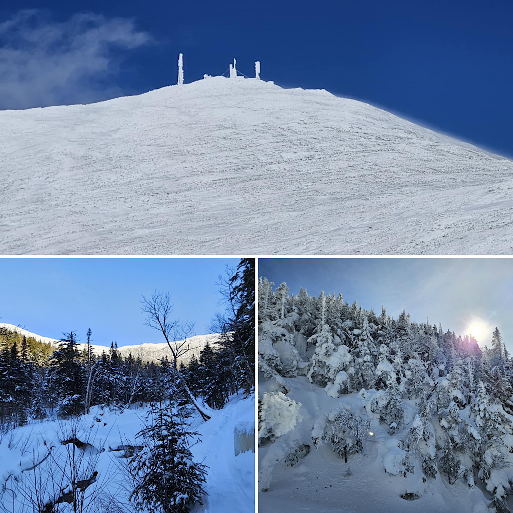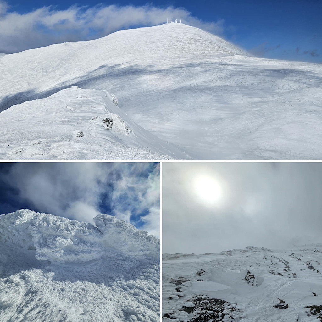 As it turned out, Monroe came with its own challenge: The upper part of the trail, which goes up the northeast side of the peak, had a ton of wind-loaded snow that I was super uncomfortable with from a safety standpoint. So, we turned around to try a different way. We wound up going to the summit by a more westerly approach, sticking to firm and textured snow as we went up from the northwest. The only downside: It put us in the full force of a whipping northwest wind.
