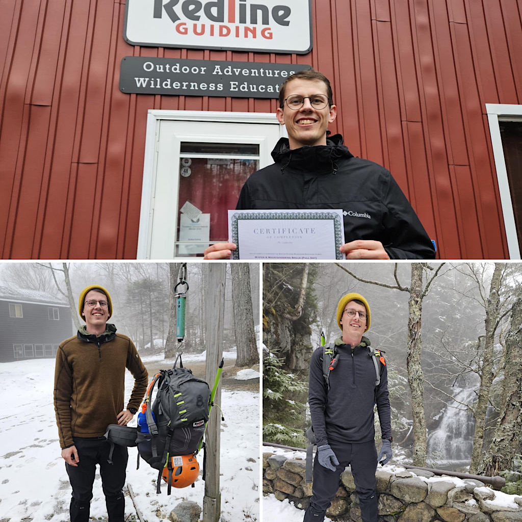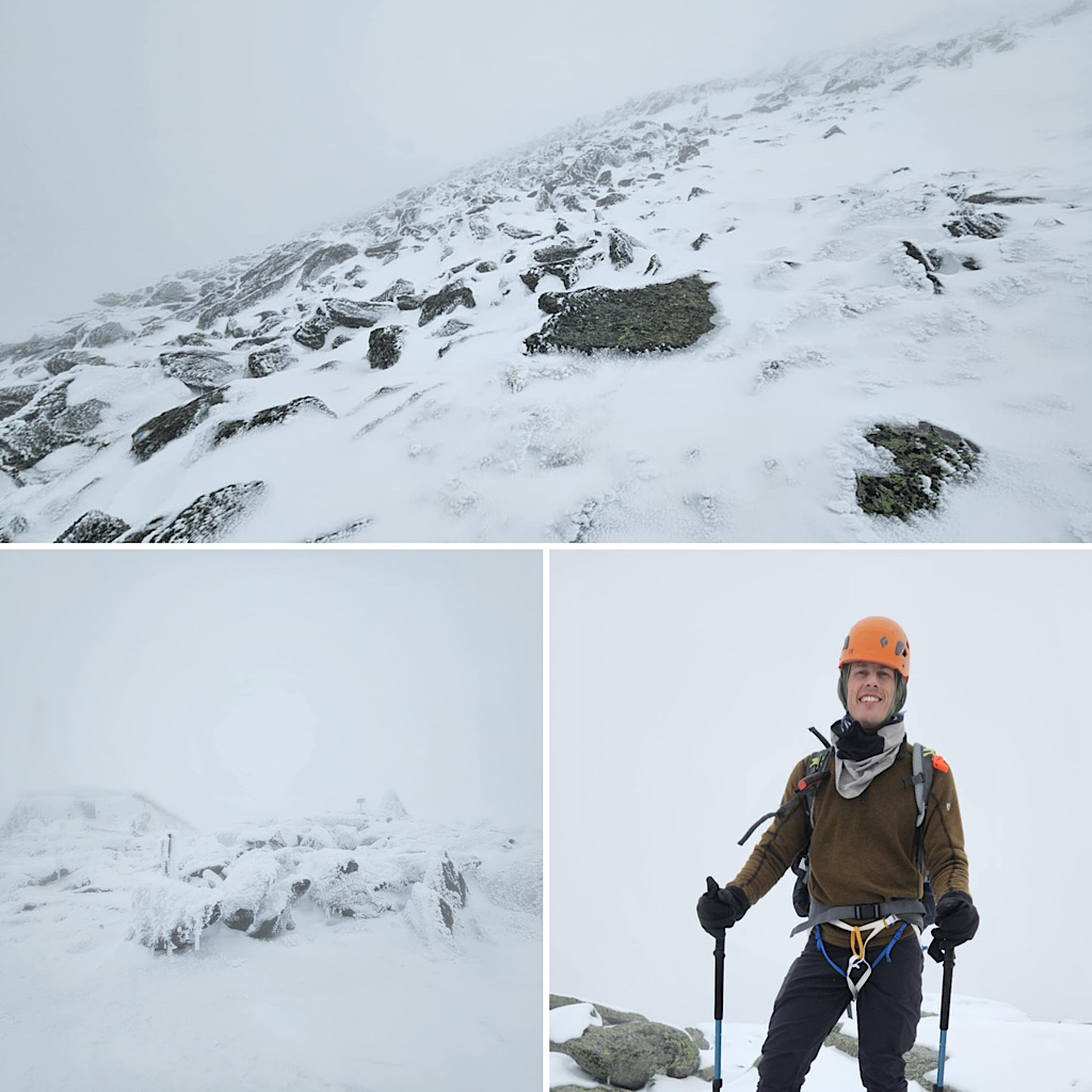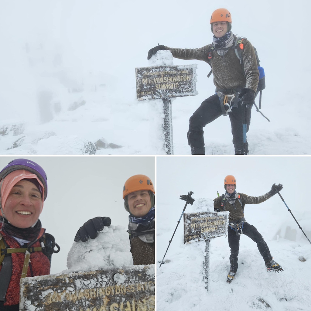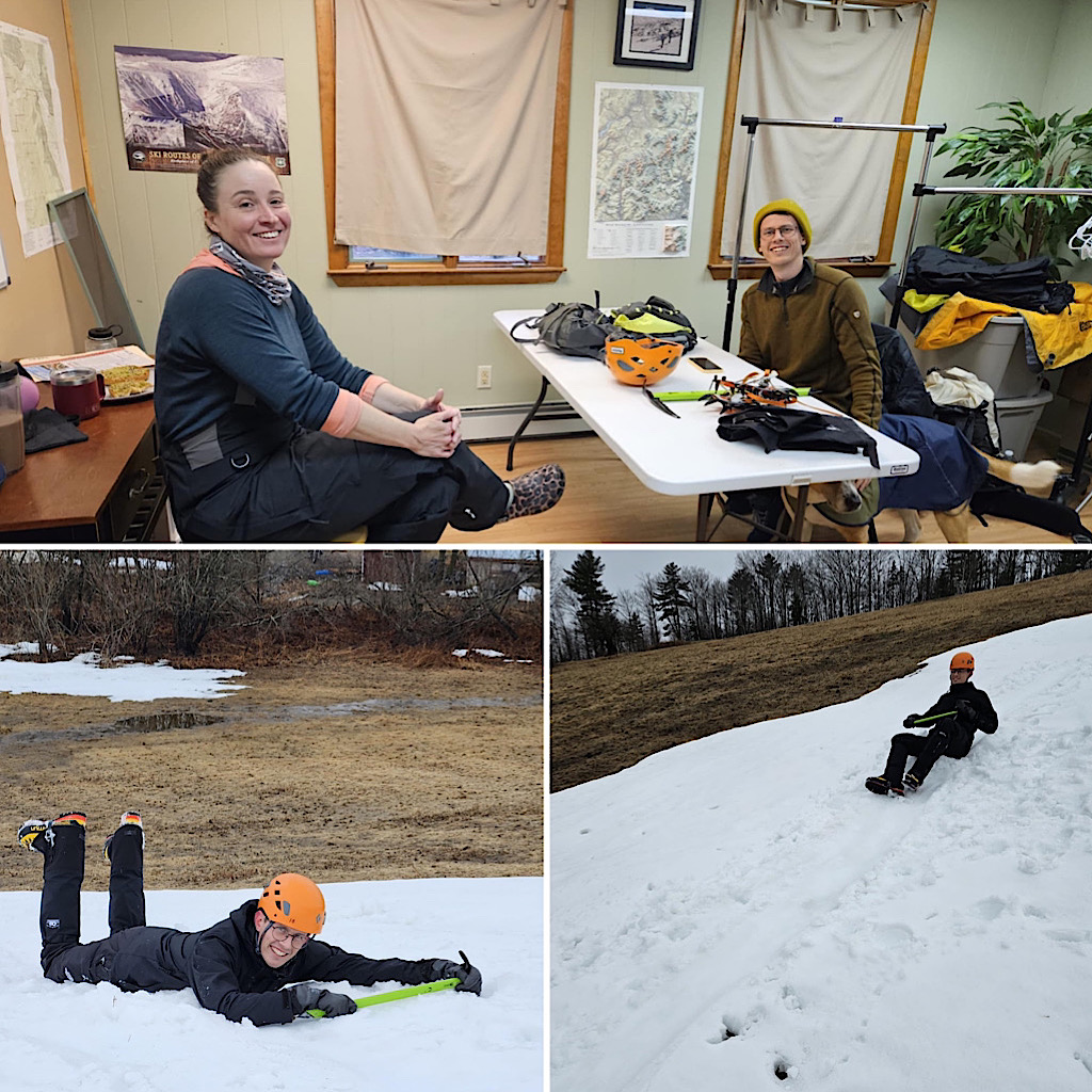 There are four distinct seasons: winter, spring, summer, and fall. But in the mountains, especially, the lines between these seasons can become blurred and indistinct. Case in point, one day it’s warm and sunny and very spring-like, surfaces getting softer as they melt in the sun, and the next day it’s full-on winter, all that melt water frozen creating a treacherous surface to climb on, with long, sliding falls becoming a real threat along with navigating rime-covered rocks in the clouds. Gotta love that mountain weather! It’s all good from our perspective, though. Black Mountain Ski Area in Jackson allows us to use their still-snowy mountain for our training day (thank you), and on-mountain on day two it screams winter and we need that. This allows us to continue offering our Two-Day Winter Mt Washington epics well into the “spring.” Leading this one, all the way to the summit with one guest, was Redline Guide Debra McCown. The photos below she captured along the way.