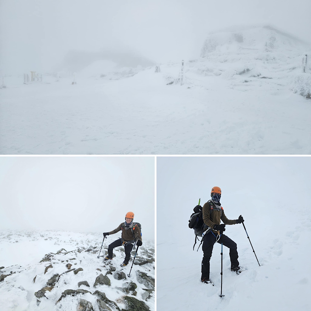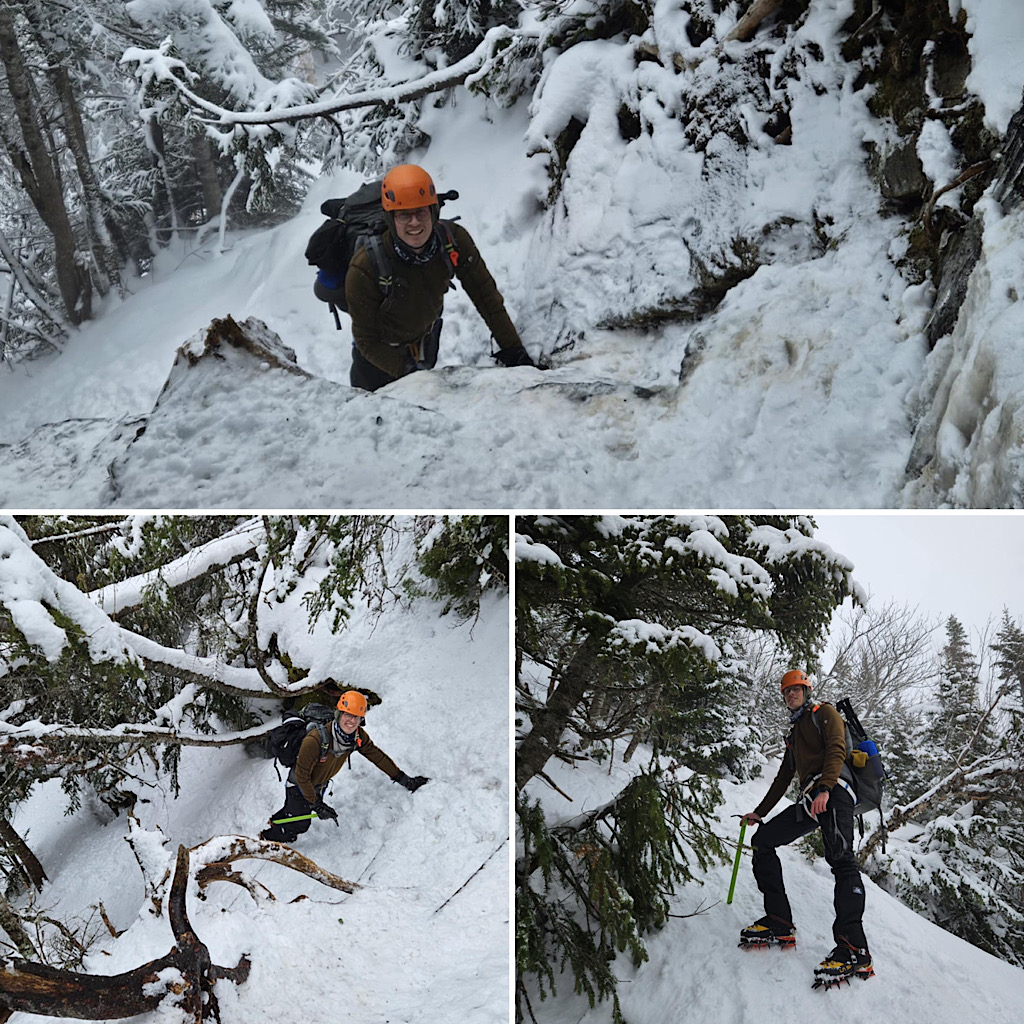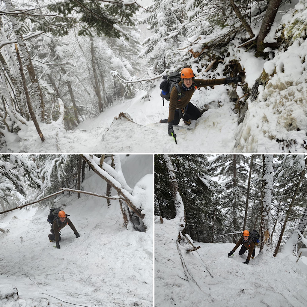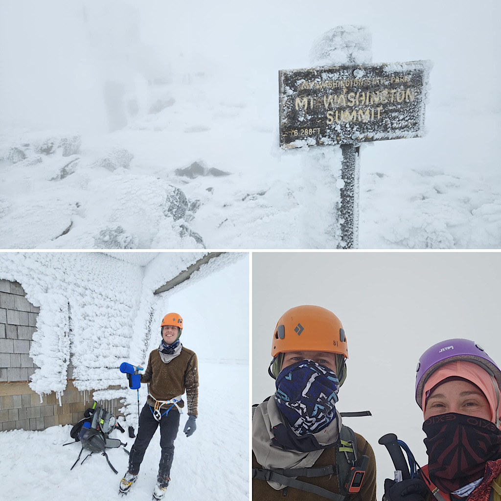 There are four distinct seasons: winter, spring, summer, and fall. But in the mountains, especially, the lines between these seasons can become blurred and indistinct. Case in point, one day it’s warm and sunny and very spring-like, surfaces getting softer as they melt in the sun, and the next day it’s full-on winter, all that melt water frozen creating a treacherous surface to climb on, with long, sliding falls becoming a real threat along with navigating rime-covered rocks in the clouds. Gotta love that mountain weather! It’s all good from our perspective, though. Black Mountain Ski Area in Jackson allows us to use their still-snowy mountain for our training day (thank you), and on-mountain on day two it screams winter and we need that. This allows us to continue offering our Two-Day Winter Mt Washington epics well into the “spring.” Leading this one, all the way to the summit with one guest, was Redline Guide Debra McCown. The photos below she captured along the way.