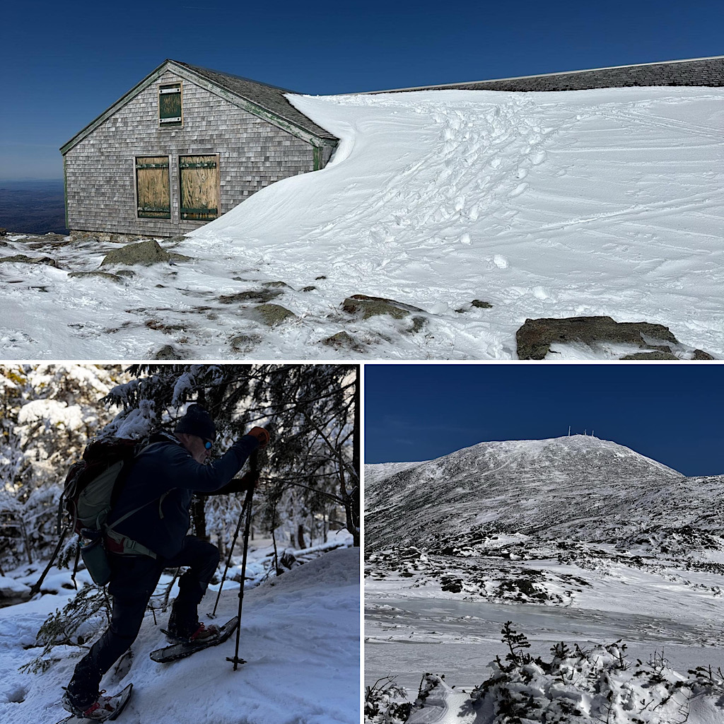 Ammo going up was fantastic. Solid snow base. Snowshoes from lot to Lakes of the Clouds will get you up Ammo without any issues, and there were no issues with the water crossings. I was really feeling good about the day. At Lakes of the Clouds hut, though, that’s when the day — and the trail — went sideways. The area around the hut and beyond had a lot of ice. There was soft snow on top of ice, but it was very slick. We changed over the spikes for the remainder of the day. Mt Monroe (attempted) was extremely icy from the junction sign on up. We turned around half way up as getting down could have been a problem. It was too icy and unsafe so we went up Washington instead. —Chase