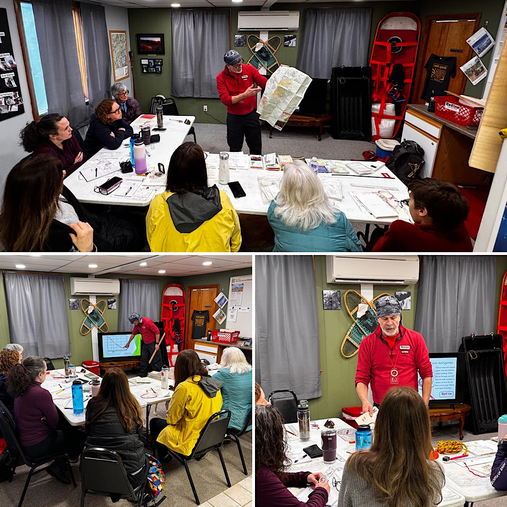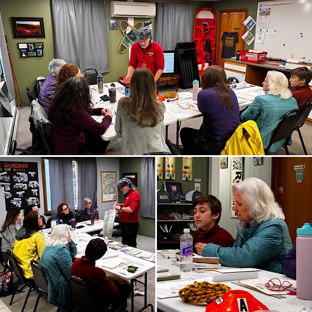 One of the most demanding classes we offer in terms of depth and complexity is our Wilderness Navigation course — ours is not a dumbed-down offering by any means. The “click” from our students’ understanding does occur, but it is definitely hard won. But when that happens, however, it’s immensely satisfying, both for us and our students. We do finish up the class giving homework, which we are happy to support both in offering teaching materials and also ourselves in terms of our time by phone, text, or whatever works. In the end, despite these efforts, the knowledge is extremely perishable. Inasmuch we try to create natural and practical uses allowing student to actually implement what they’ve learned. Like our last class, this course was also offered to members of the Pemi Valley Hikers. This most recent class — which ran a little differently due to time (or a lack thereof) and weather, was led by Redline Guides Mike Cherim and Chase Hall.