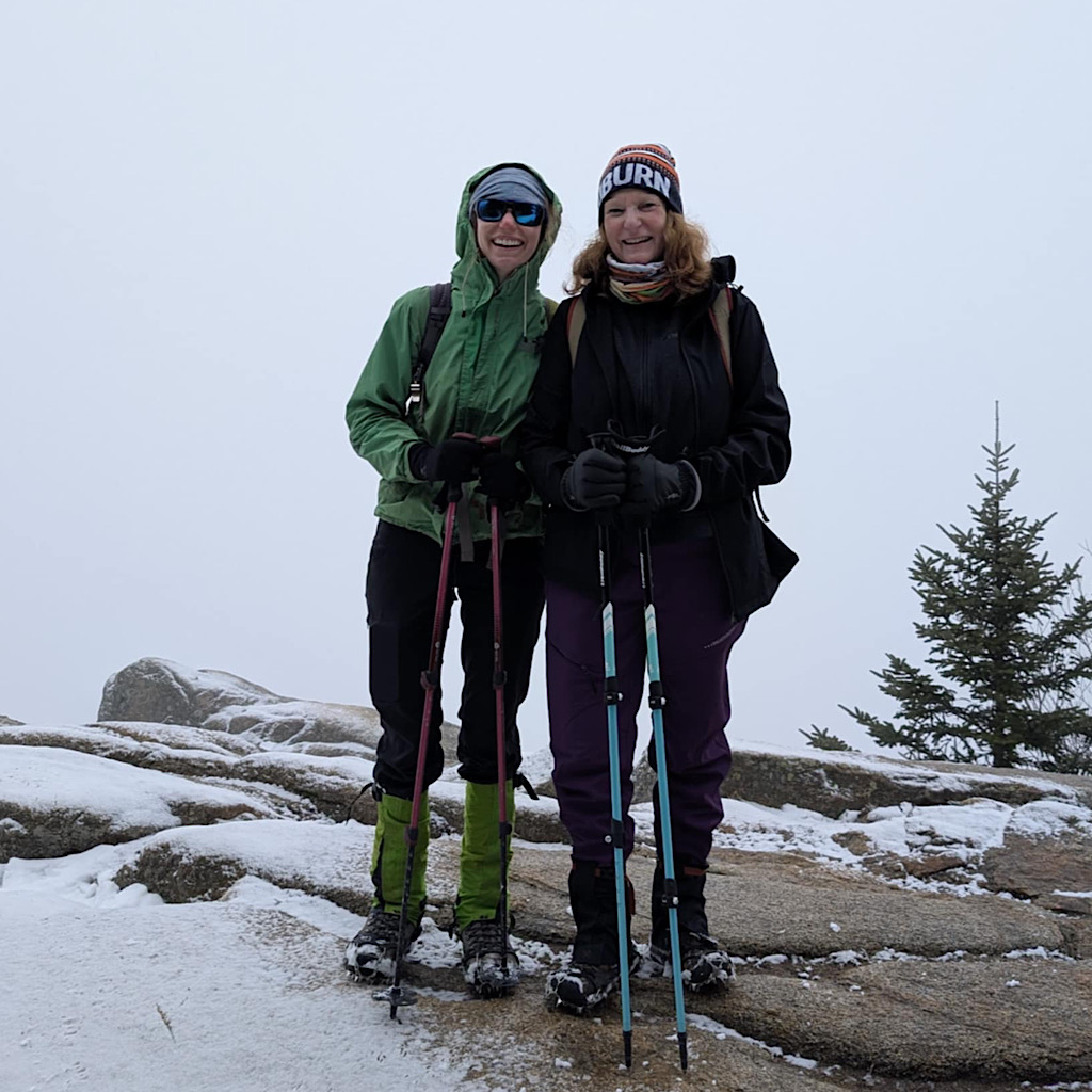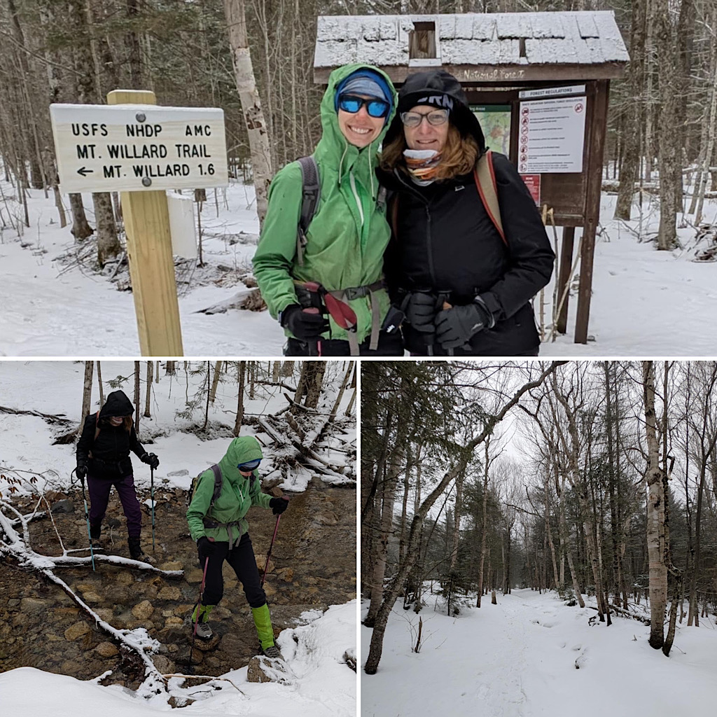 We enjoyed a nice hike up to Mt Willard summit through snowy paths and pretty brookside scenery. From the road you could see the summit was in the clouds, so we weren’t sure what kind of views we’d get. But either way we would be hiking up into the clouds. The trail was fully snow covered from the trailhead and we were able to bareboot our way to the summit, then put on our microspikes for added traction on the descent. Once we were within a quarter mile from the summit we started entering the cloud vapor. The summit itself, well… you could see your feet! It was a unique and new experience for our guests to be standing in the middle of a cloud, looking down from the summit ledge to clouds below. With low wind and a comfortable temperature, we enjoyed the summit, took some pictures and had a snack, then descended at a leisurely pace with good conversation. A fun time out on a peaceful early spring day! —Eric