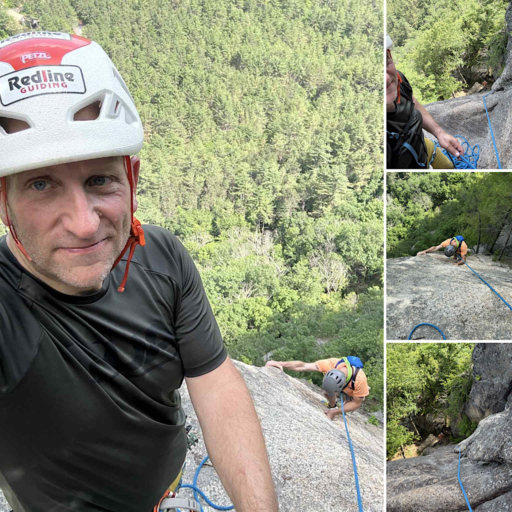 A fellow from Maryland planned to spend a number of days playing in our playground. And while he was from Maryland — a person one we might refer to as a flatlander — he took to our hills with the spirit of adventure and apparently, legs of steel. He hiked some impressive hikes only to outdo himself by taking on a second hike on the same day. And he did this multiple times during the week — both with and without our help. For his hikes he asked a lot questions and made them happen on his own building upon some basic info we provided. He did hire us, however, for a day of rock climbing thrown into the mix. As he had some climbing experience Redline Guide Glenn Van Neil did a little top-roping to shake him down, so to speak, to see if he was ready for some multi-pitch climbing. He was. Glenn then moved to another spot for a pretty cool climb on Cathedral Ledge called Upper Refuse. There he also excelled as well. Stoked for action, he plans to come back for more — and to maybe introduce his son to these things. For now, we offer some photos of the climbing.