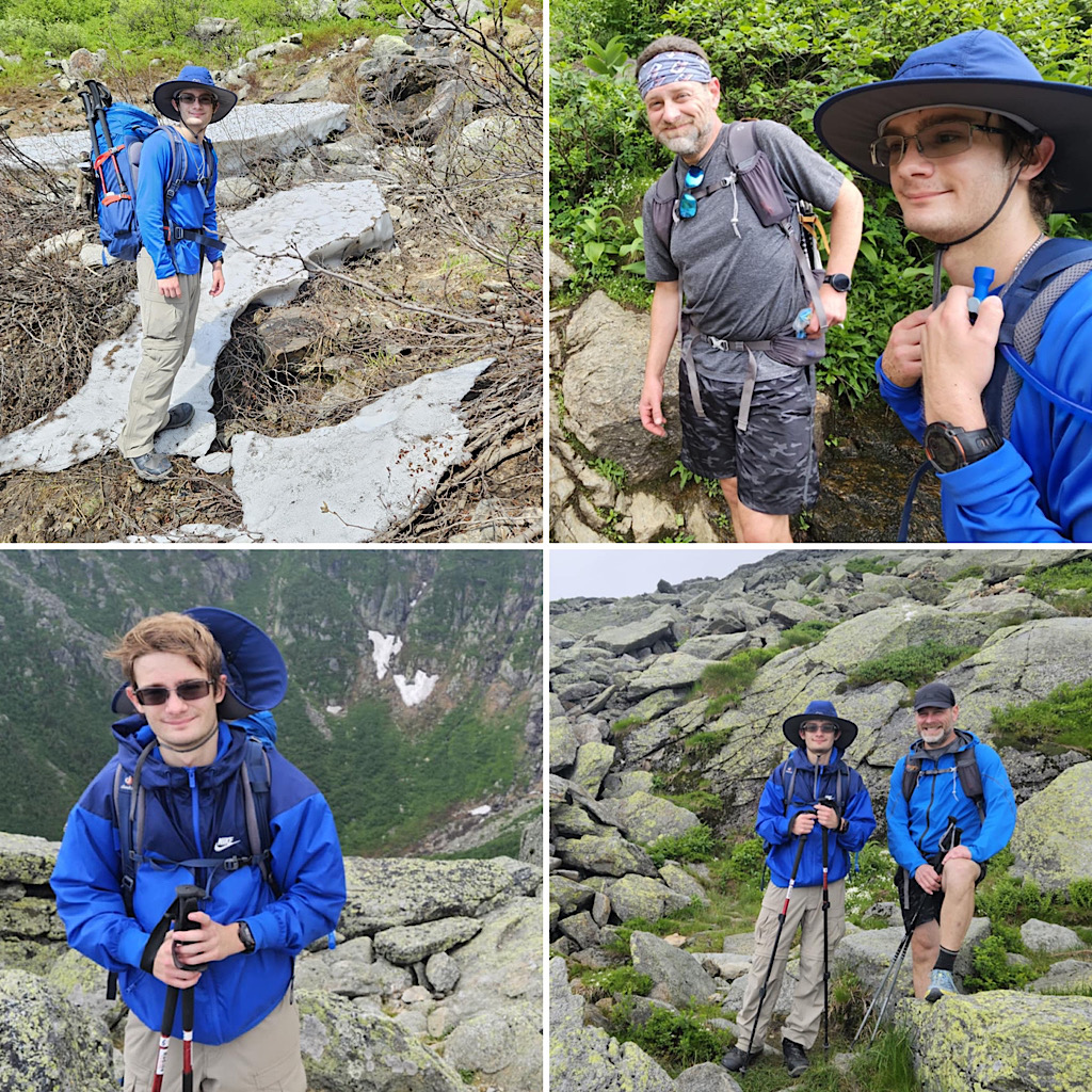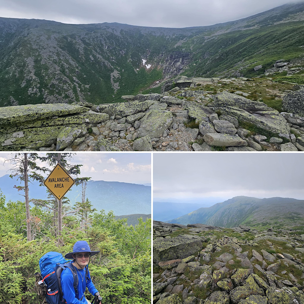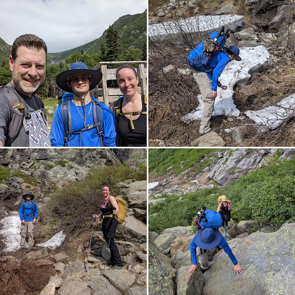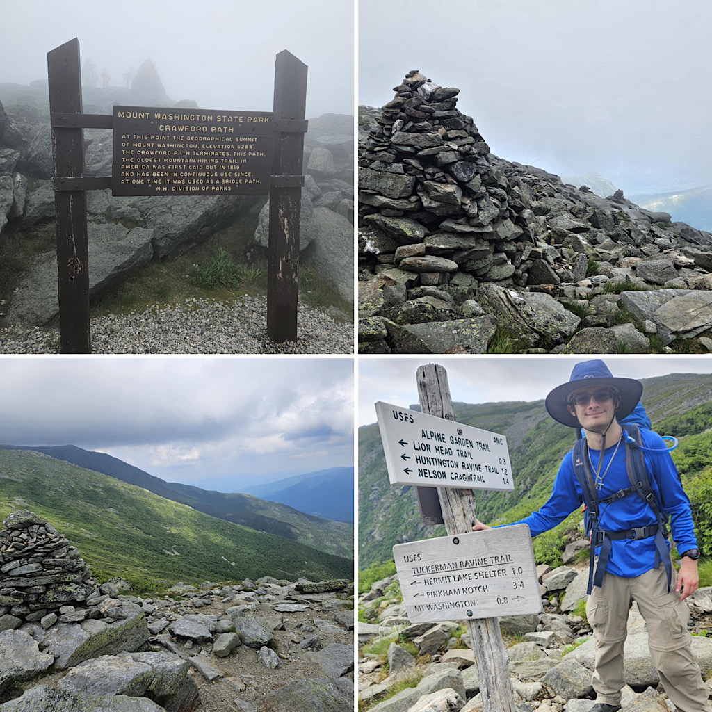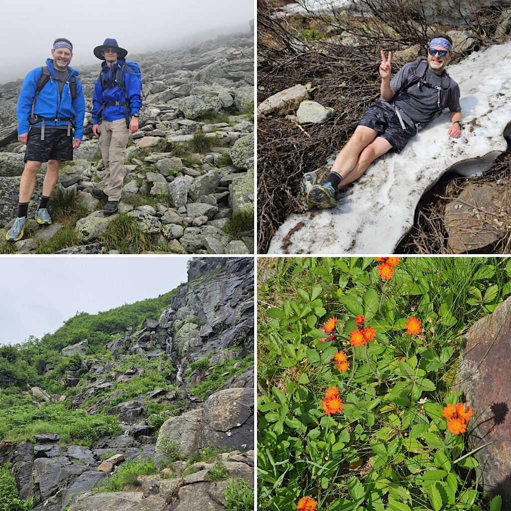 After meeting up at Base Camp to secure our guest’s rental gear, we shuttled to Pinkham Notch to begin our Mt Washington hike. We took Tuckerman Ravine Tr on the ascent, and a loop around Lion Head Tr back to Tuckerman on the descent. It was a very decent weather day, warm at the trailhead but much cooler and breezier at elevation. We enjoyed some ‘late season’ remaining snowpack in the ravine bowl, hiked up along a waterfall, and experienced all the varied terrain of the Rock Pile. Once above the ravine bowl, we hit the cloud floor and continued our ascent, in the mist and vapor, up the summit cone. Our guest, hailing from Florida, is a high school track and cross country runner, and we had a hunch he’d do just fine on this hike, especially given the lack of alligators. In fact, we believe he’s been one of the fastest people we personally have guided up the east side. Impressive given this was, reportedly, the most vertical elevation gain he’d taken on in a single day, perhaps by a factor of 100x! We hit the summit, got our pictures at the summit sign, then took a break at the visitor center. After a short while we decided we’d head back down. It was another new experience for our guest to make such a lengthy descent, yet any time we checked on his status, his verbal reply was ‘chilling,’ which we eventually figured out meant he was doing just fine. We really enjoyed hiking with our guest and giving him a big mountain experience. He knocked it out of the park! —Eric
