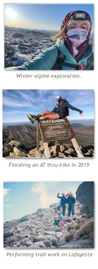 Certifications: Degree in Recreation, Adventure Education/Travel, and Ecotourism (PSC), SOLO Wilderness First Responder (WFR), AHA CPR/AED, AIARE Avalanche Level 1 (Avy 1), Leave No Trace (LNT) Master Educator, and White Mountain Outfitter Guide (USFS/AMC).