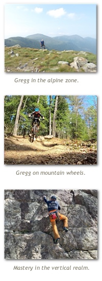 Resume: He has hiked 22 of 48 4000 footers and counting, and has ice climbed the tallest waterfalls in NH and ME, as well as a lot of lesser known waterfalls. Gregg is studying and practicing to get his AMGA certifications for Single Pitch Instructor (SPI), on the way to ice and rock climbing guide/instructor. Gregg also strives to be a mountain biking guide and instructor (a future offering?). We should also note that Gregg is Ambassador, has a sponsorship, or is affiliated with the following: Rudy Project Eyewear (10+ years), Honey Stinger (10+ years), GoPro (5+ years), Odi Grips (5+ years), Skratch Labs (5+ years), and Leatt Protectives (3 years)