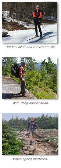 Résumé: Tim has hiked over 600 miles of the AT, has explored every corner of the White Mountain National Forest, and much of the Greens and Adirondacks, too, and has probably summited most of the “48” at some point (he’s never kept a list). He’s a certified volunteer kayaking trip leader and whitewater kayaking instructor for the NH Chapter of the Appalachian Mountain Club (AMC), and has taught Winter Camping, Backpacking Skills, Advanced Snowshoe Skills, and Backcountry Skiing for Vermont Doe Camp. In winter, he is a Trail Steward for the Mount Washington Valley Ski Touring Association.