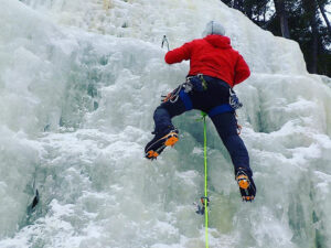 - Belay wear. Being that ice climbing can involve a fair amount of standing around while not actively climbing, belaying and whatnot, it’s possible to get really cold. In particular think of a large, hooded puffy jacket (like the one in our Alpine Ready Packs) to wear while not climbing. Also consider your hands: good climbing gloves and mitts while not climbing.