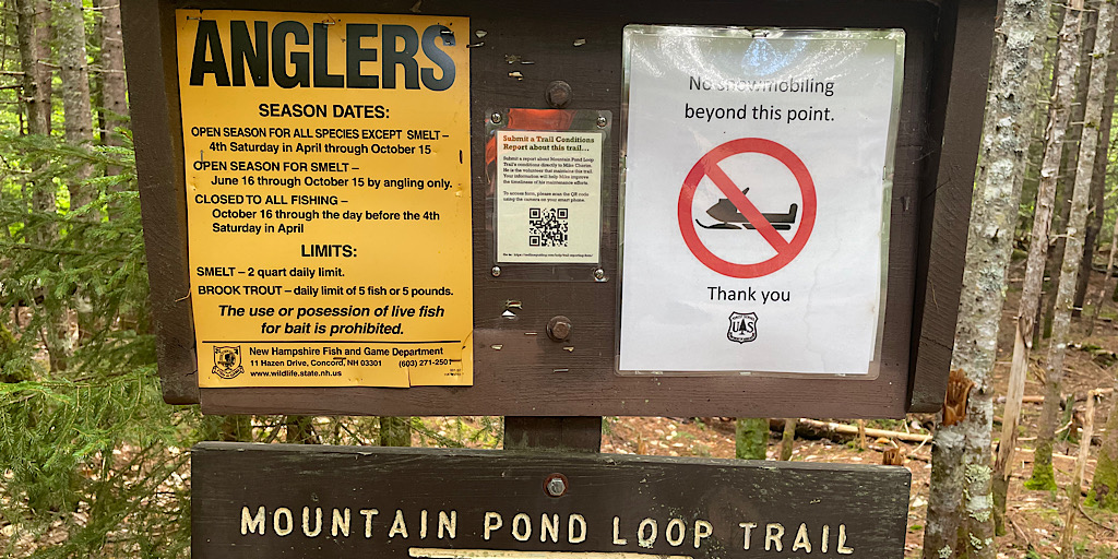 You probably came to this page after scanning a QR code posted at the Mountain Pond Loop Trail trailhead. If that is the case, thank you for visiting. The form on this page is for reporting trail conditions on the Mountain Pond Loop Trail — a classic, rugged and remote-feeling non-wilderness loop, some of which may require maintenance from the volunteer trail maintainer, Mike Cherim. Things Mike is interested in hearing about are any or all of the following: